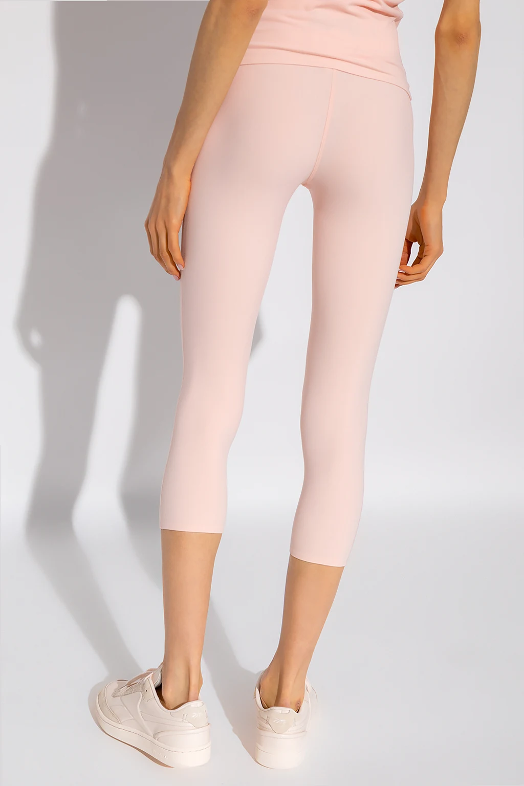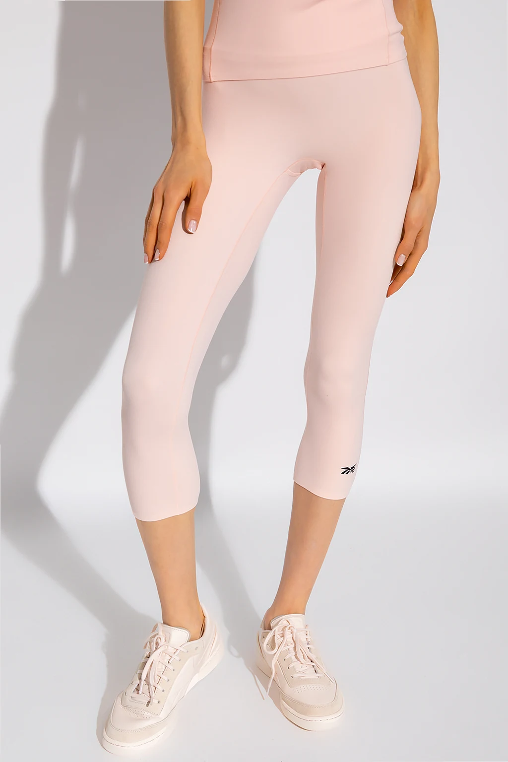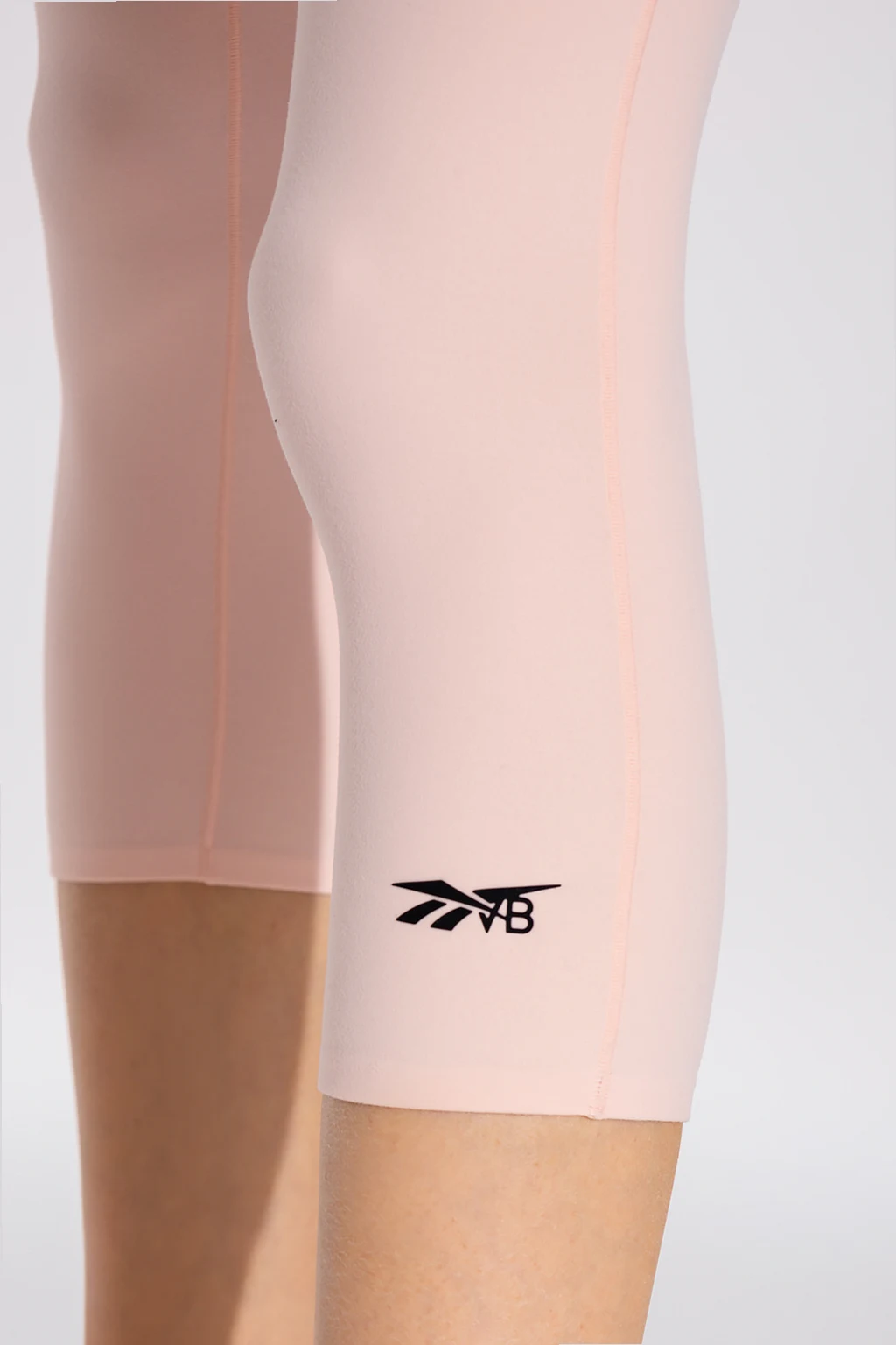 Orange and pink leggings from Reebok x Victoria Beckham. This pair features an elastic waistband and a black logo embroidery.