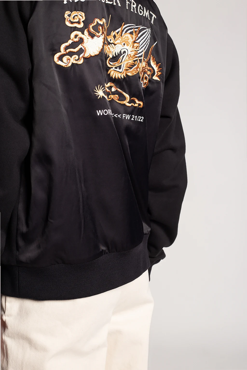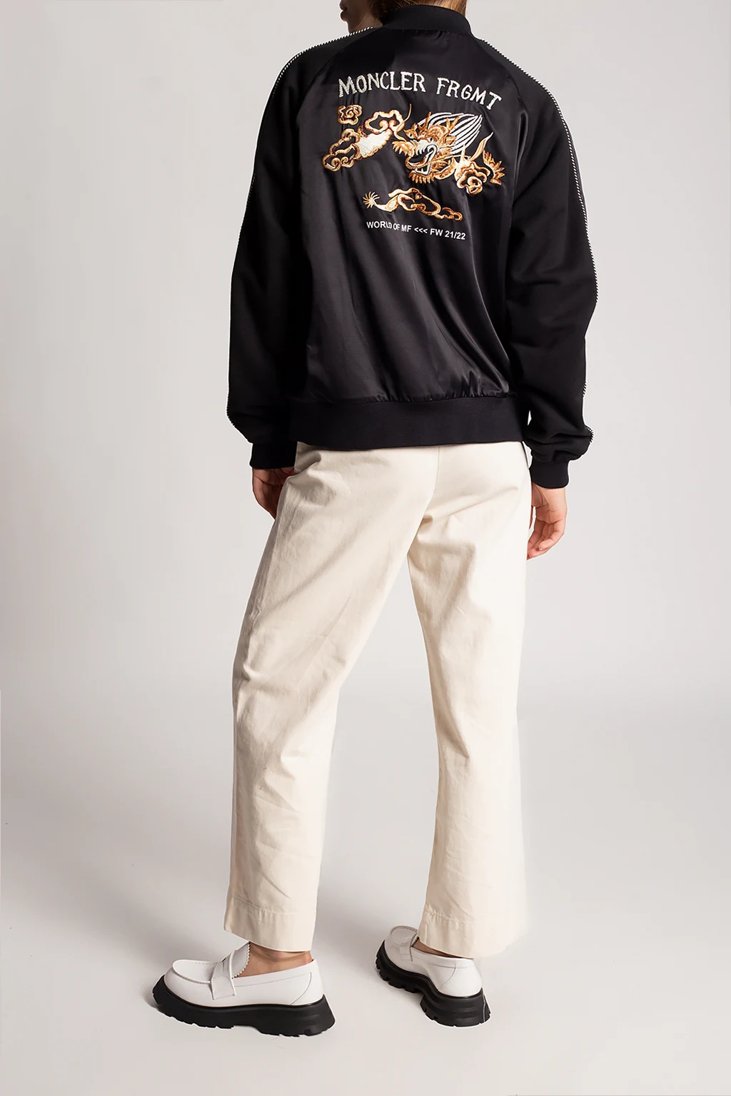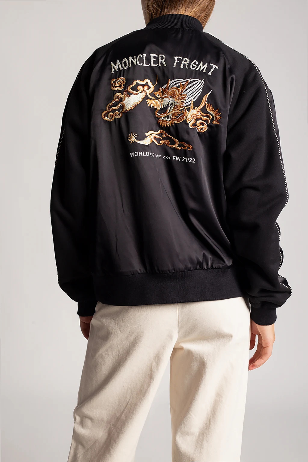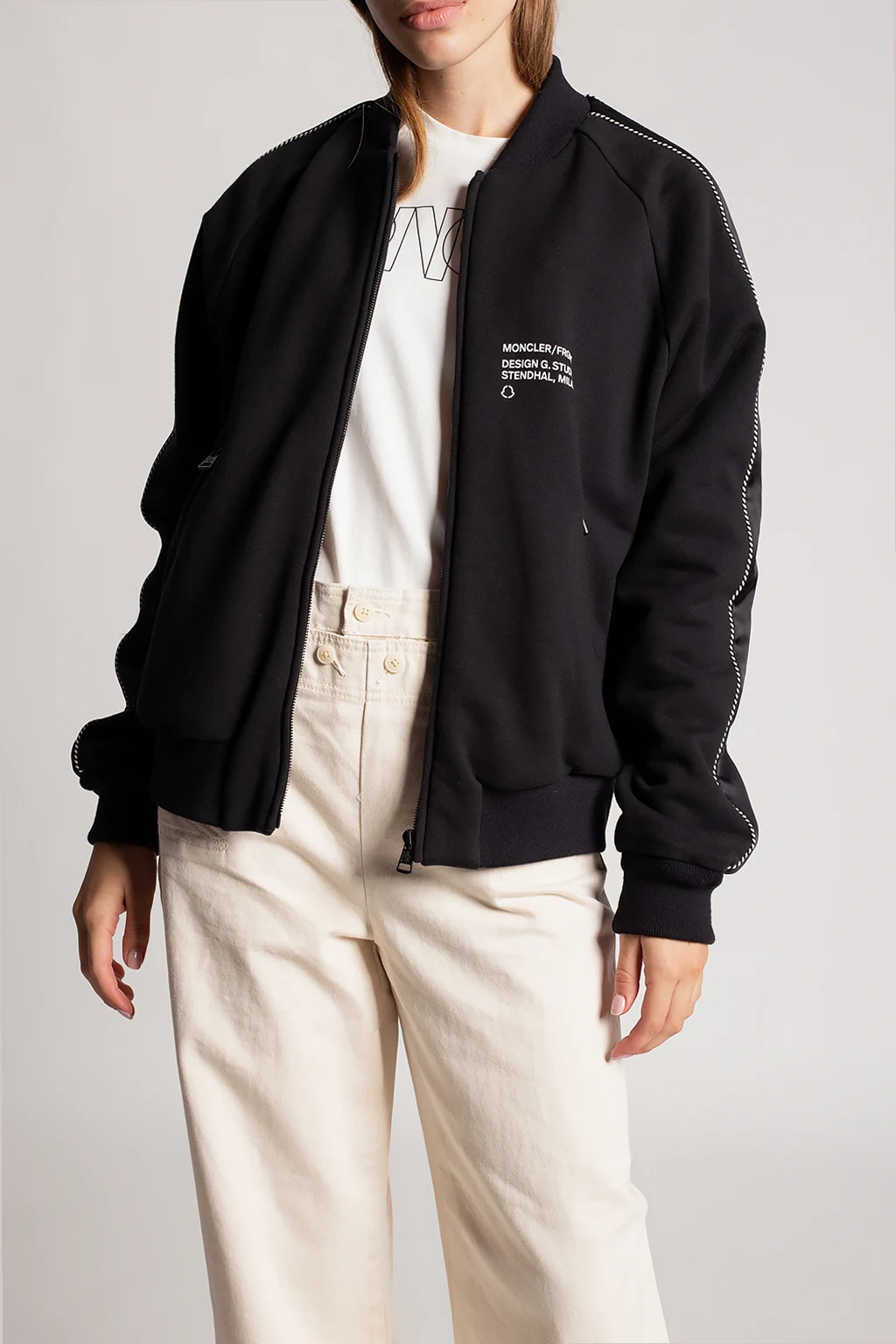 Black bomber jacket from Moncler Genius, the ‘Hiroshi Fujiwara no.7’ collection. Fastened with a zip, this garment features sewn-on stripes in black and white, two front zip pockets on the front, a print and embroidered logo pattern in white, brown and beige at the back as well as ribbed trims at the hem and cuffs.