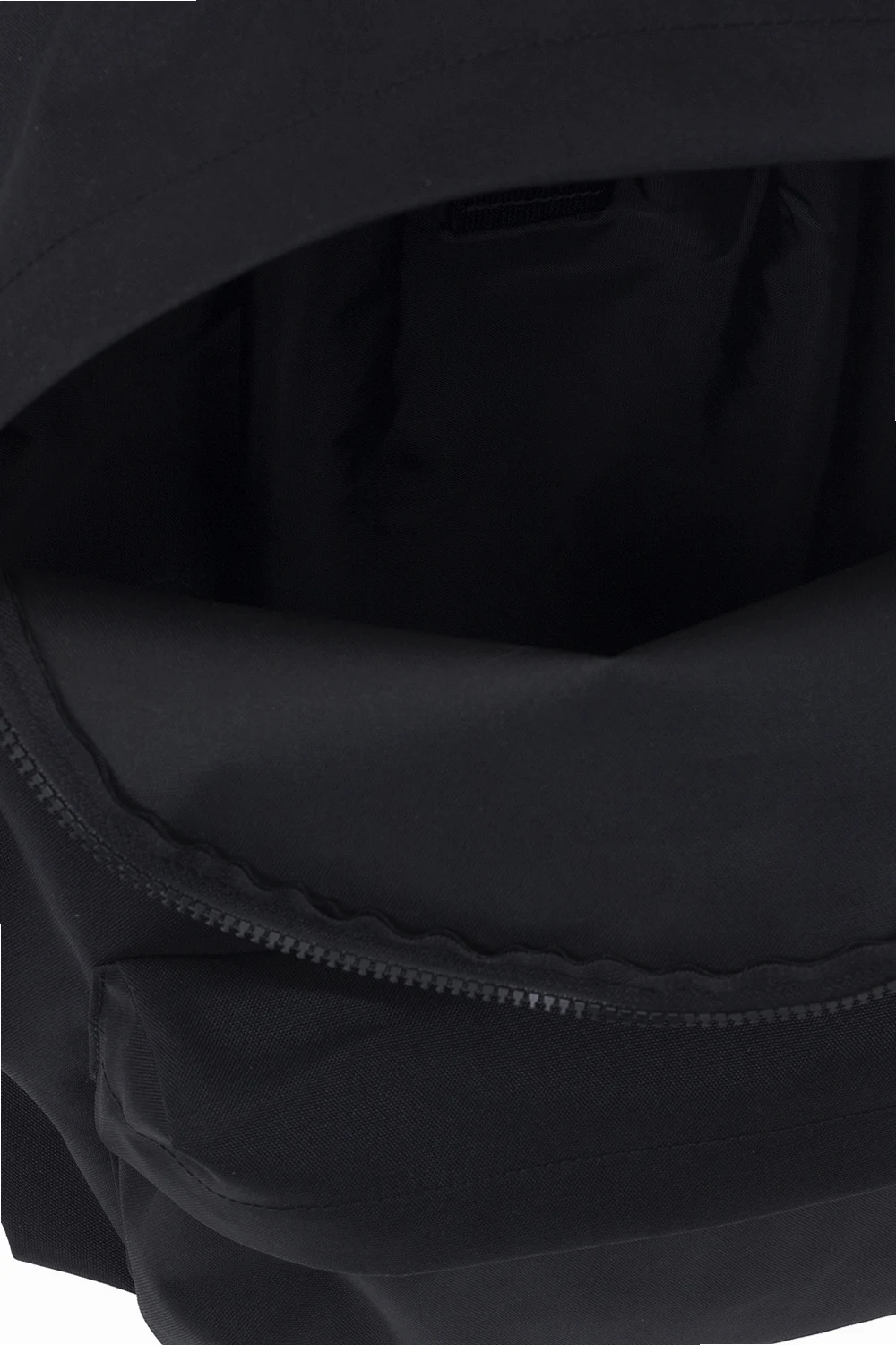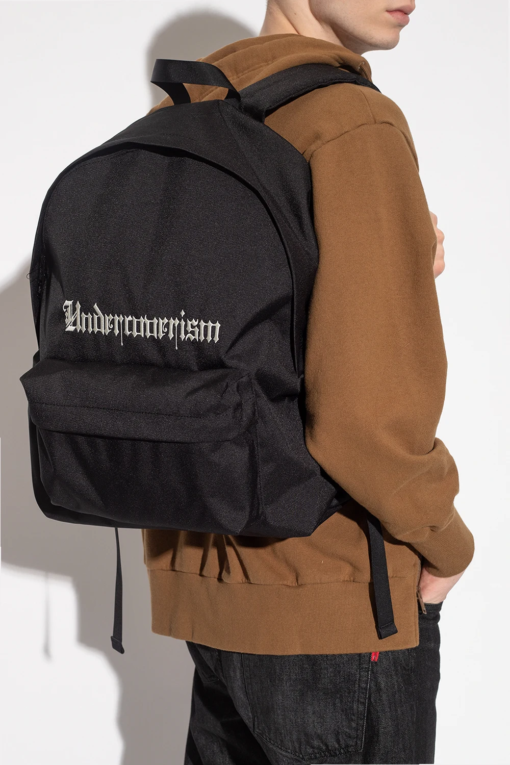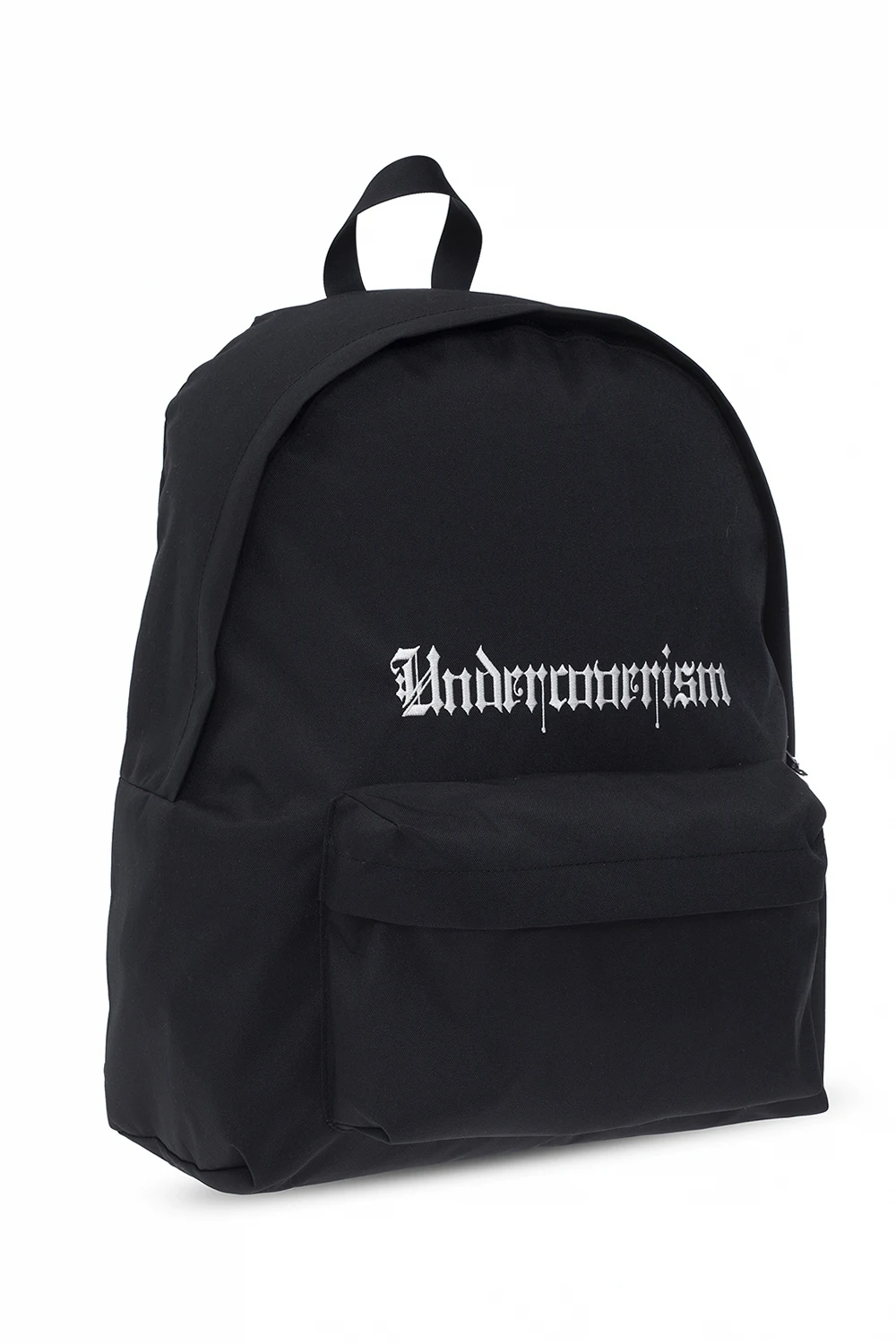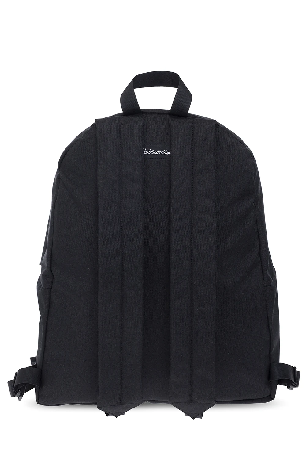 Black backpack from Undercover. Fastened with a two-way zip, this design features a zip front pocket accompanied by white lettering embroidery, a half-round top handle, adjustable shoulder straps and one internal compartment with a velcro-fastened pocket.