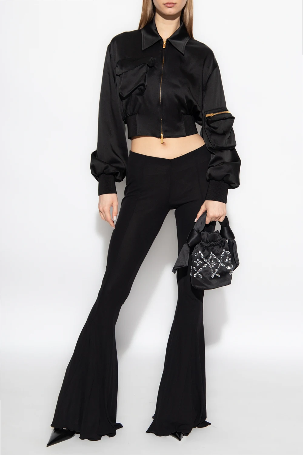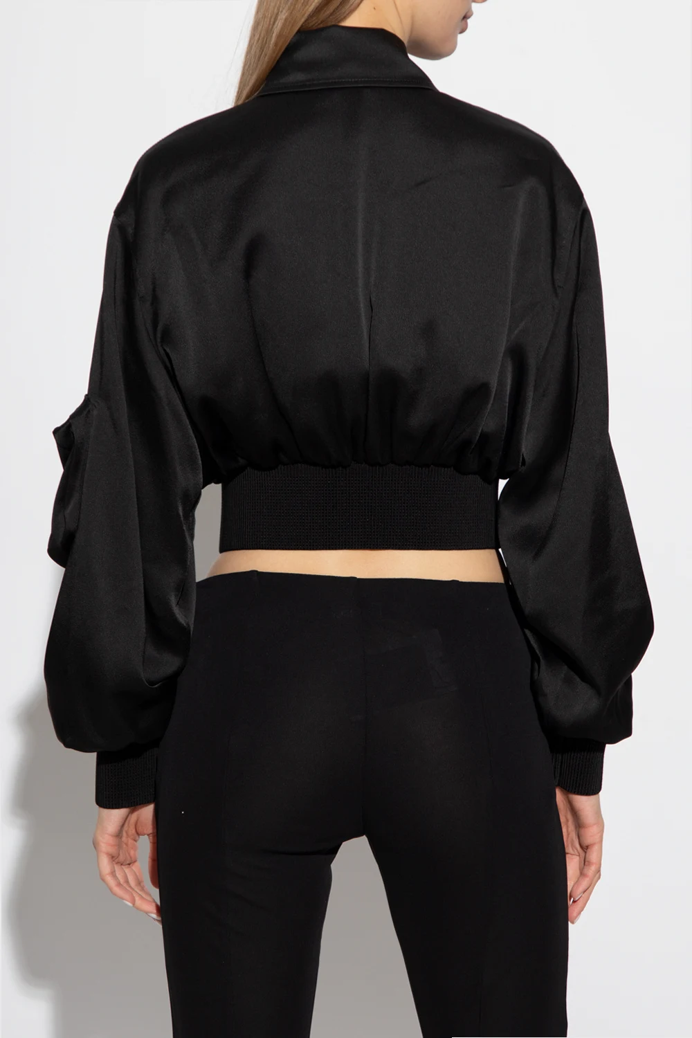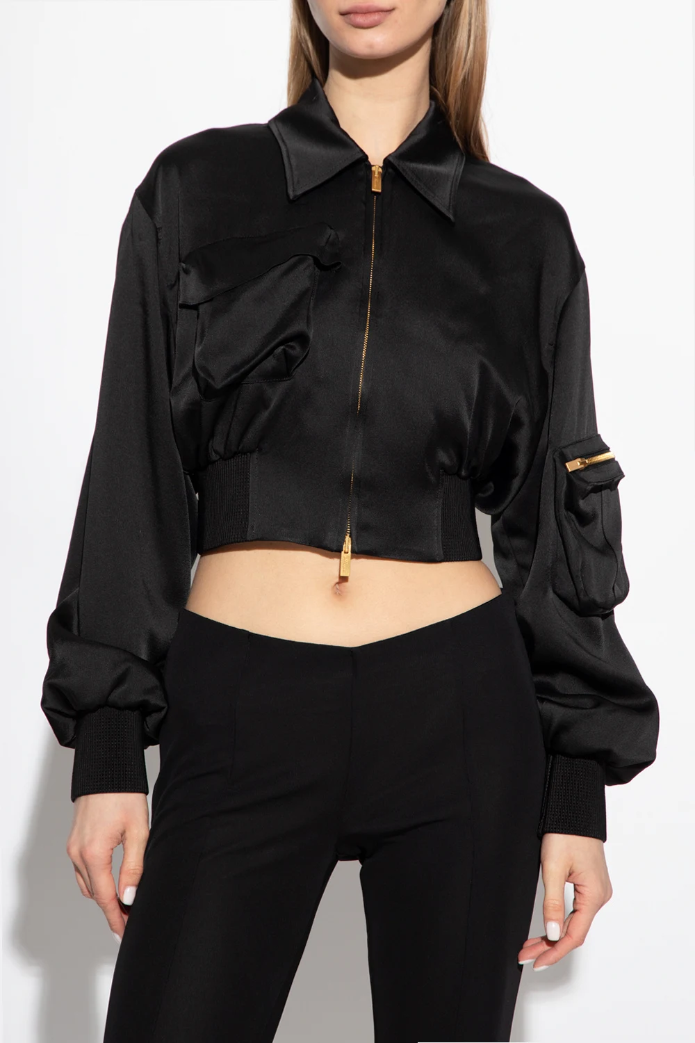 Black bomber jacket from Blumarine. Crafted from satin material with a cropped fit, this style fastens with a two-way zipper and features a pointed collar, one flapped pocket on the front, one zip pocket on the shoulder and elasticized trims on the bottom hem and cuffs.