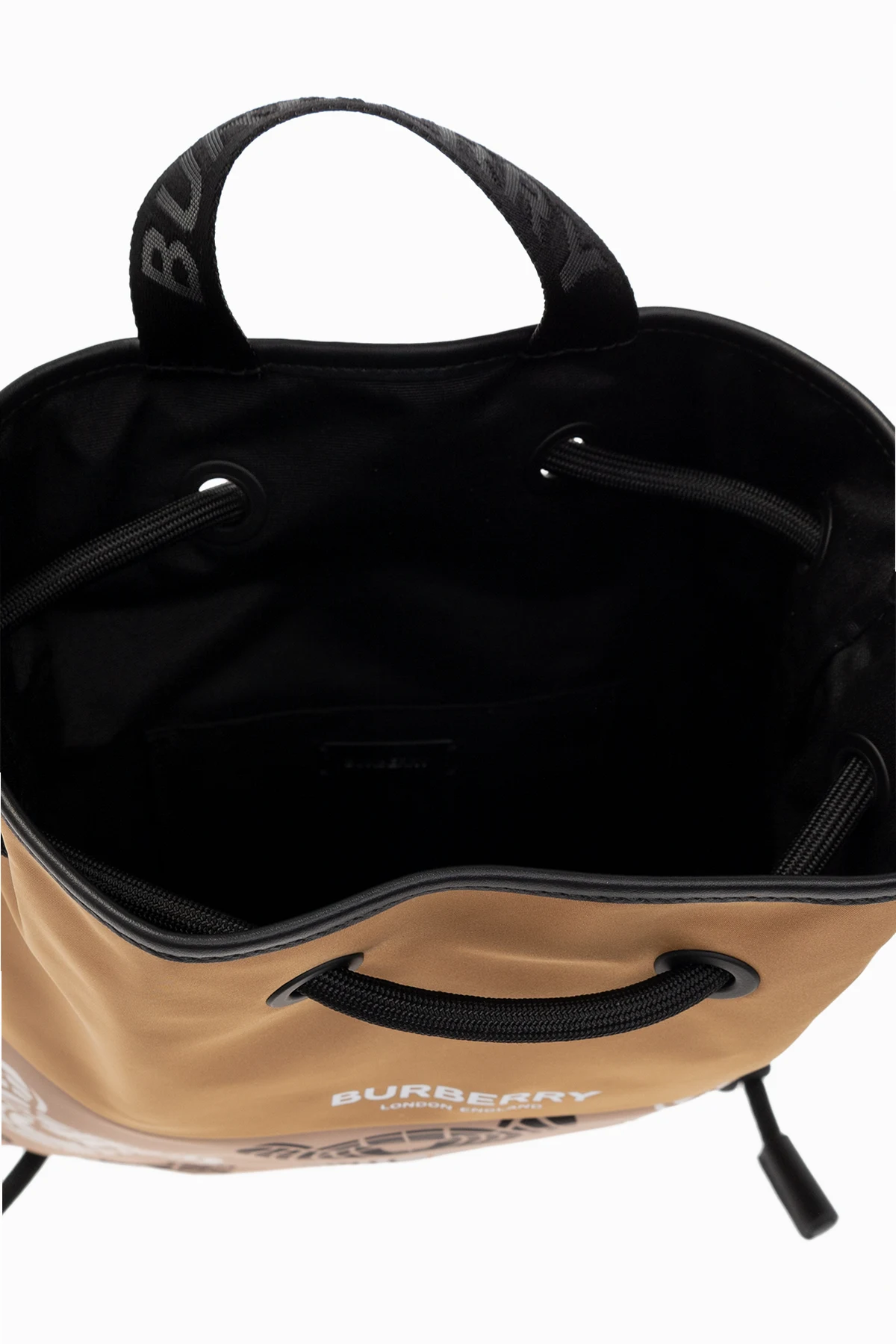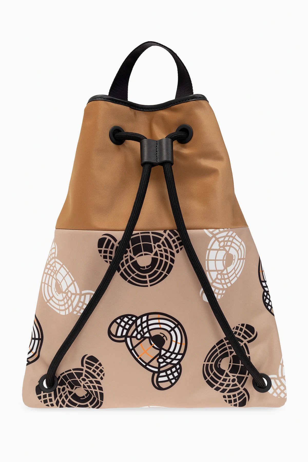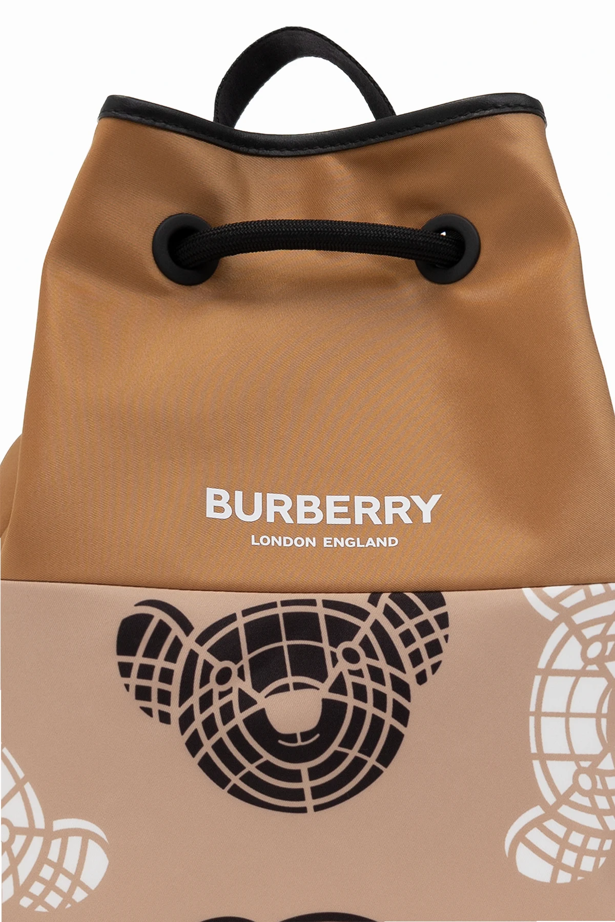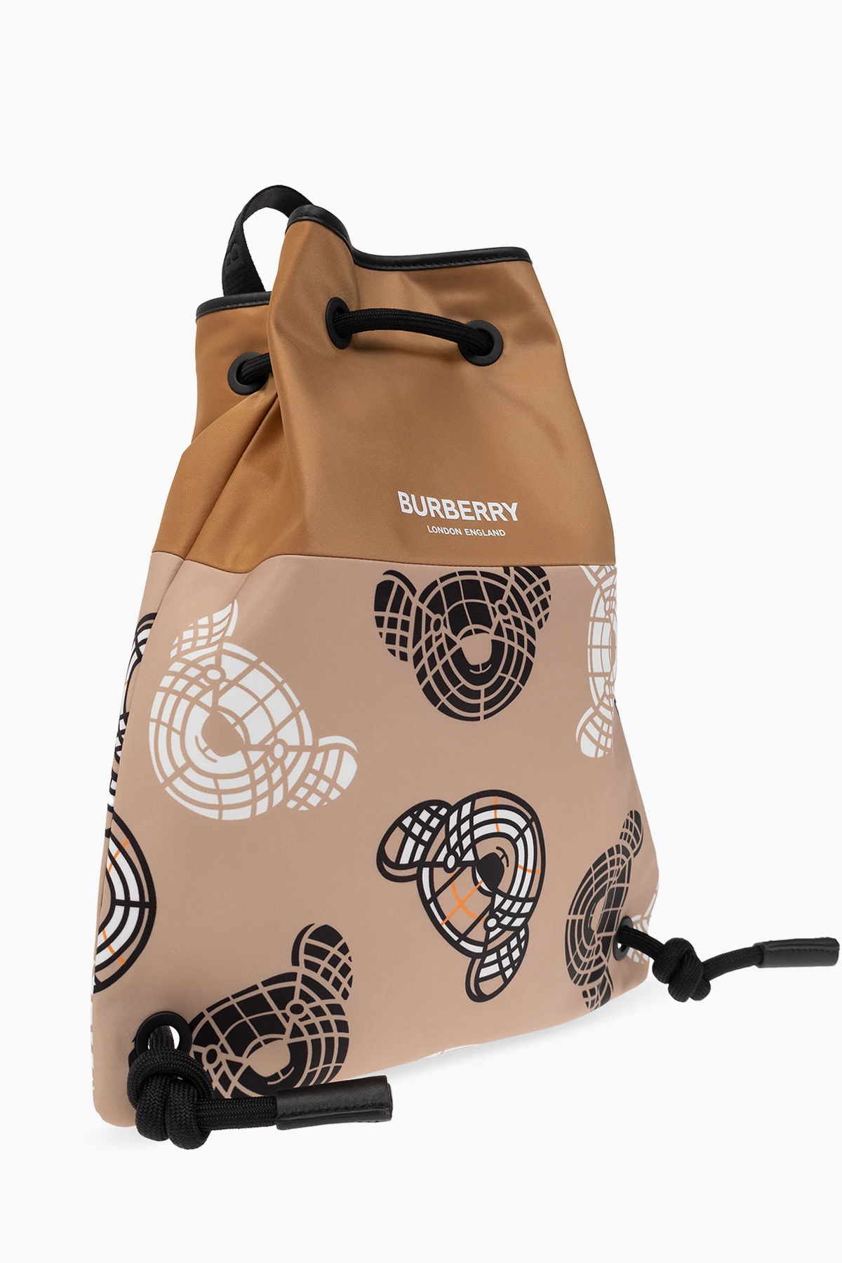 Beige and black backpack from Burberry Kids. Crafted from fabric and trimmed with leather, this design cinches closed with drawstrings and showcases a colourful graphic print with the brand's logo and its signature Thomas Bear motif. It is complete with a half-round handle and one internal compartment with a slip pocket.