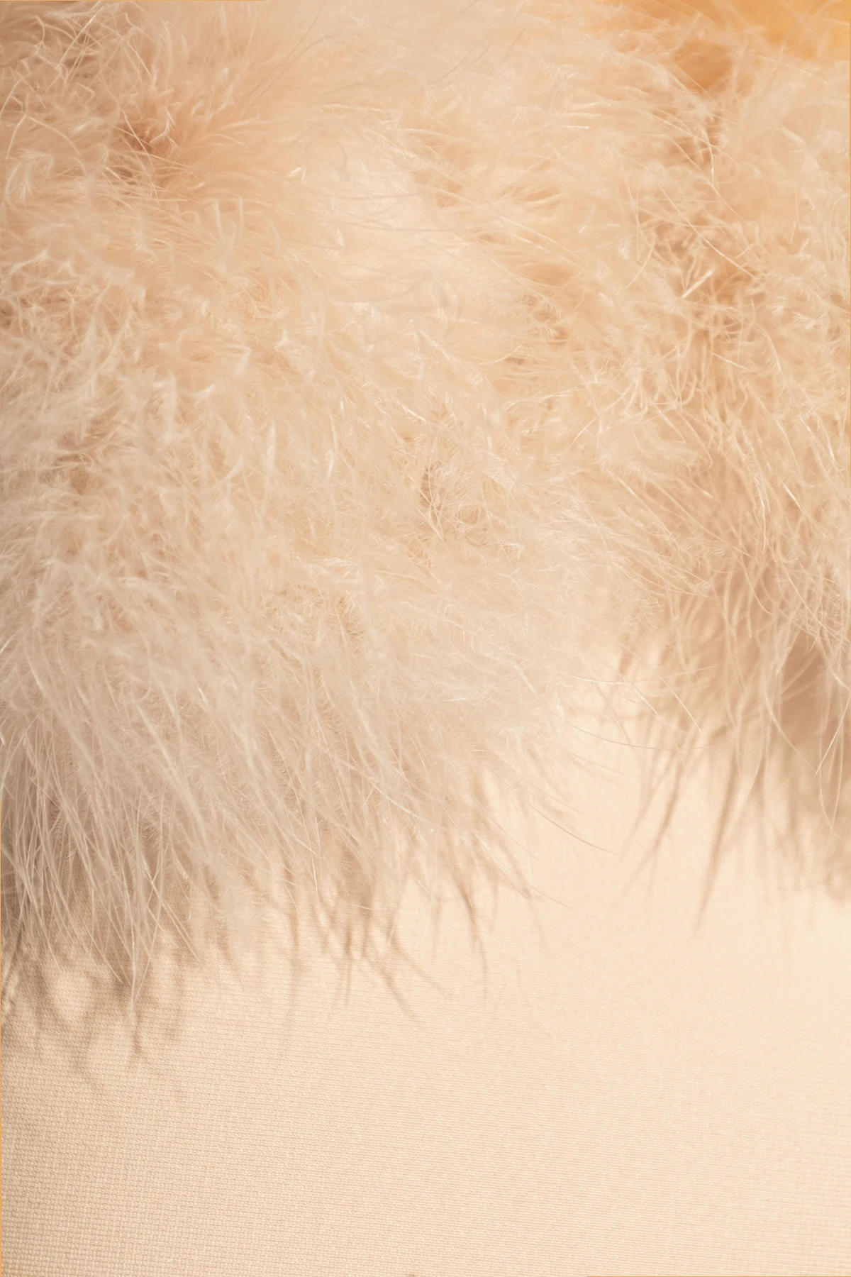 Der obere Teil des Kleides ist mit einem flauschigen, pelzähnlichen Detail in Beigetönen verziert, das harmonisch mit der rosa Farbe des Kleides verschmilzt und ihm einen einzigartigen und eleganten Charakter verleiht. Dünne, verstellbare Träger ermöglichen eine perfekte Passform, und ein zentraler Reißverschluss am Rücken erleichtert das An- und Ausziehen.