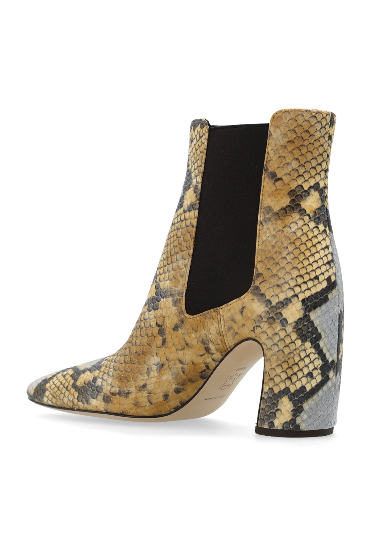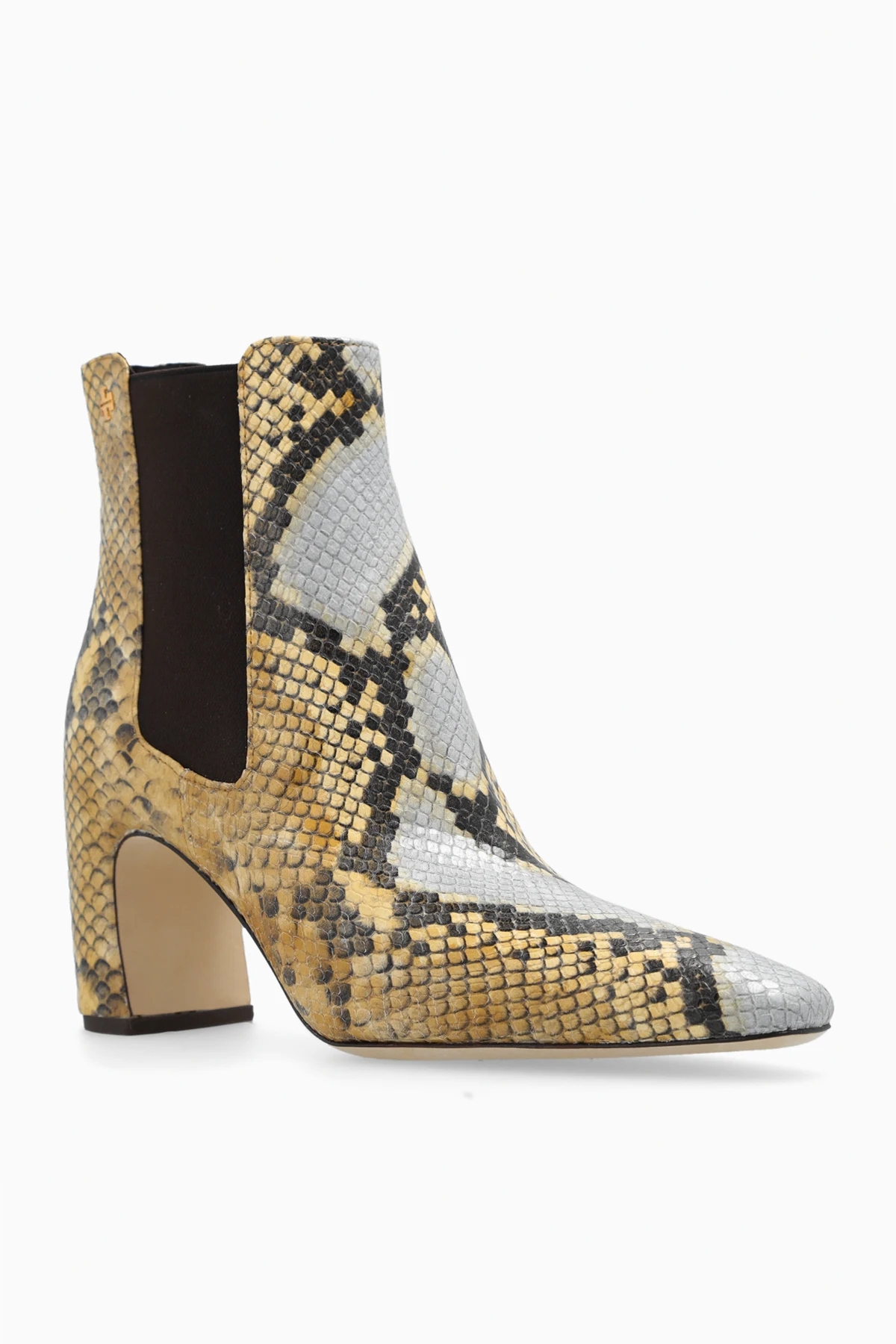 Beige, black and grey ‘Banana’ heeled ankle boots from Tory Burch. Made from leather with a snakeskin effect, this model sits on a black leather sole and features a curved heel, elastic panels on the sides and gold-tone logo hardware.