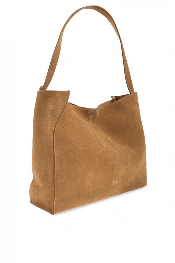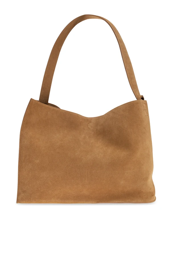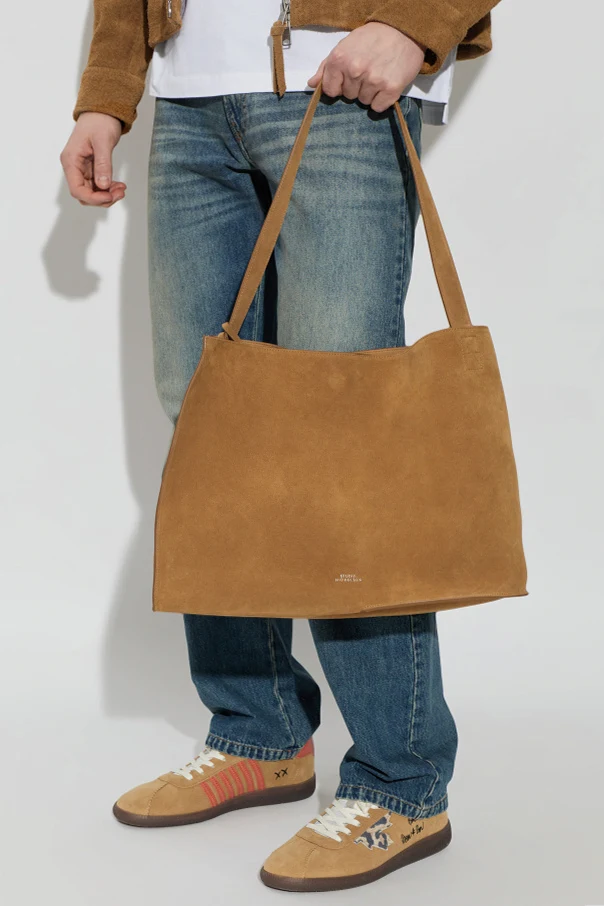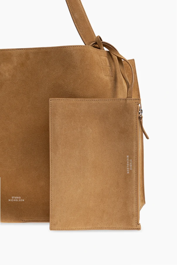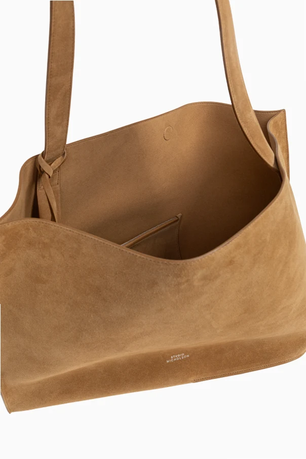Die Zamschtasche Doublet im Shopper-Stil von Studio Nicholson verkörpert das Wesen raffinierten Minimalismus. Gefertigt aus hochwertigstem beigen Ziegenveloursleder begeistert sie durch ihre klare Form sowie die weiche, leicht trapezförmige Silhouette, die sich sanft an die Hand schmiegt. Der lange, breite Riemen sorgt für angenehmen Tragekomfort – sowohl über der Schulter als auch in der Hand – während dezente Nähte die geometrische Form der Tasche elegant hervorheben.