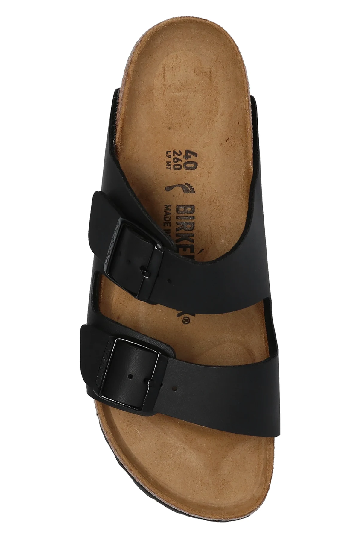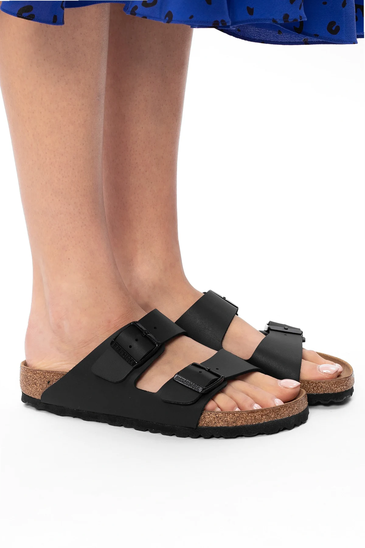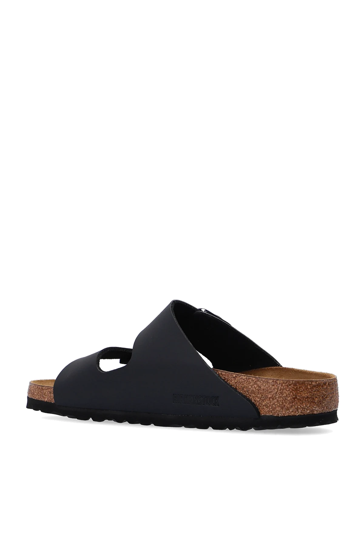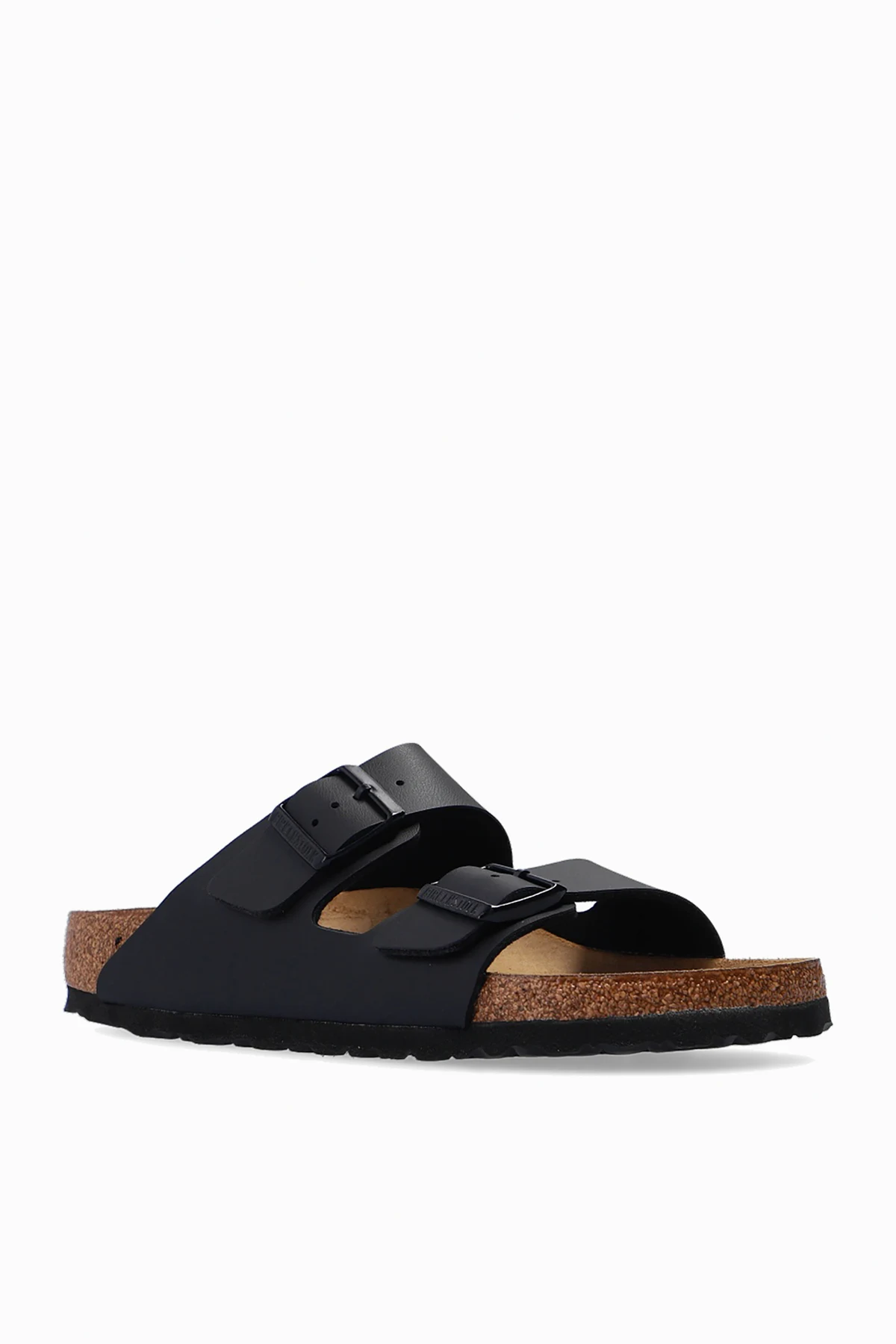 Black ‘Arizona BS’ slides from Birkenstock. This pair features a tapered upper, adjustable straps with logo-embossed black buckles and a black rubber sole.
