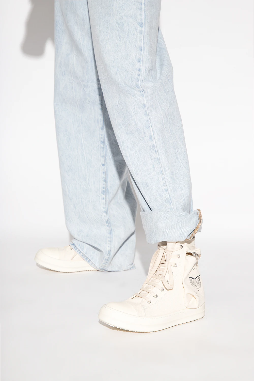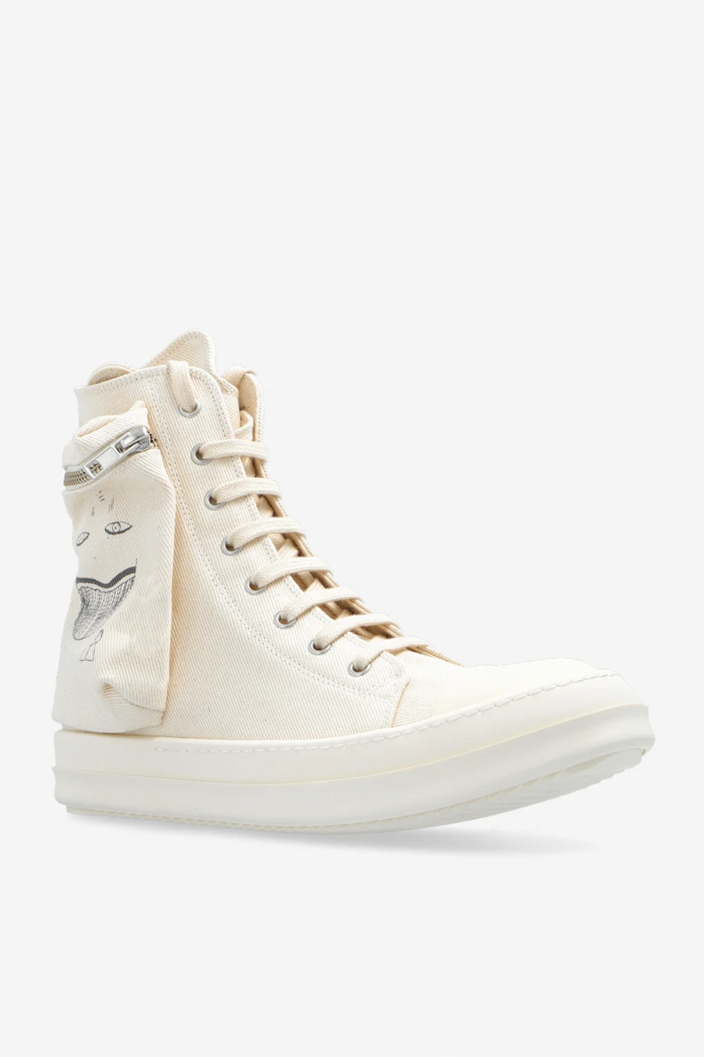 Cream ‘Cargo Sneaks’ high-top sneakers from Rick Owens DRKSHDW. Sitting on a cream rubber sole, this lace-up model features a side zipper and a zip pocket enriched by a black graphic print.
