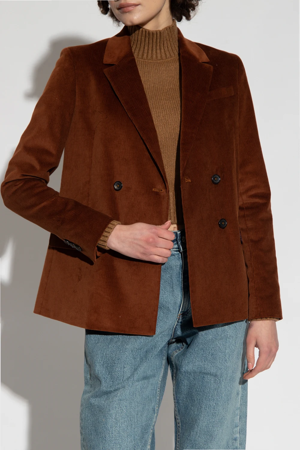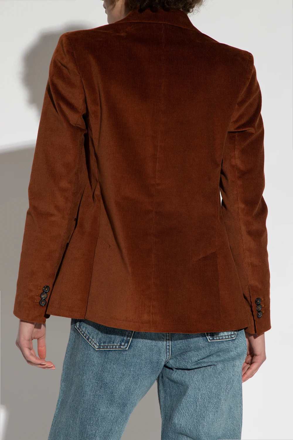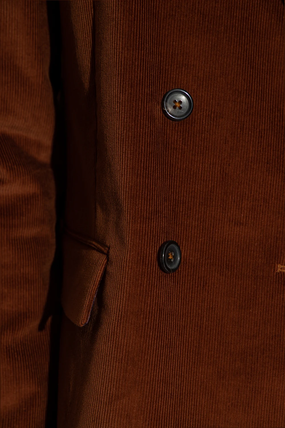 Brown corduroy jacket from PS Paul Smith. Made of cotton with a double-breasted silhouette, this style features button closures, notch lapels, three frontal pockets – two flapped ones, long sleeves and a double back vent.