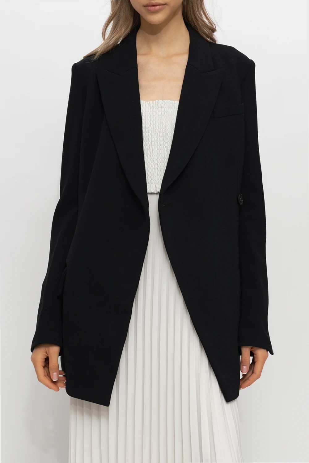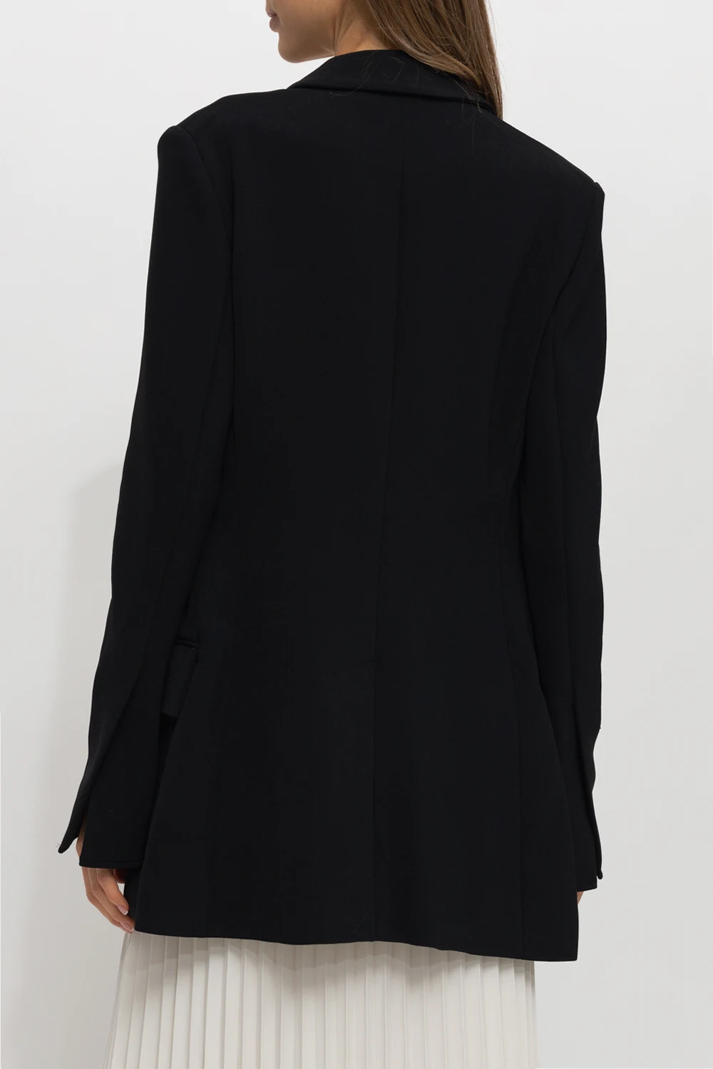 Black fitted blazer with peak lapels from Proenza Schouler. Fastened with buttons, this fitted garment features two flap pockets, one slip pocket and long sleeves with slits.