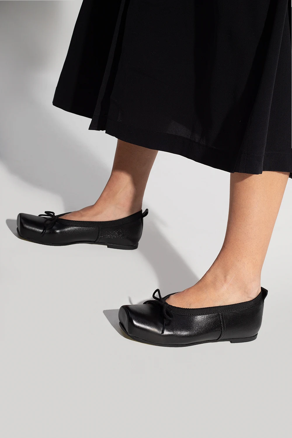 Black shoes from Comme Des Garçons. Made of leather, this pair features fabric trims, a bow detail and black rubber sole.