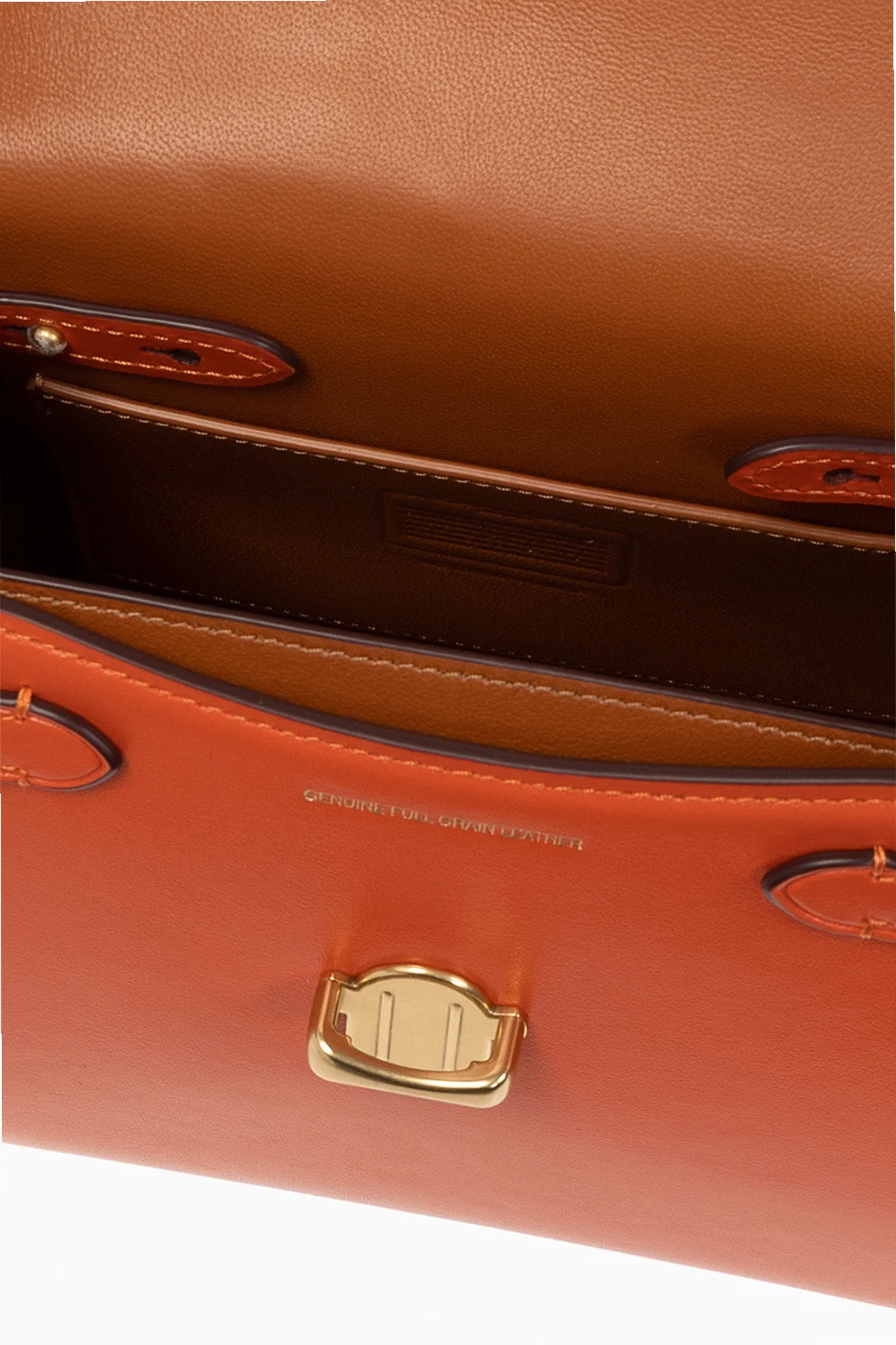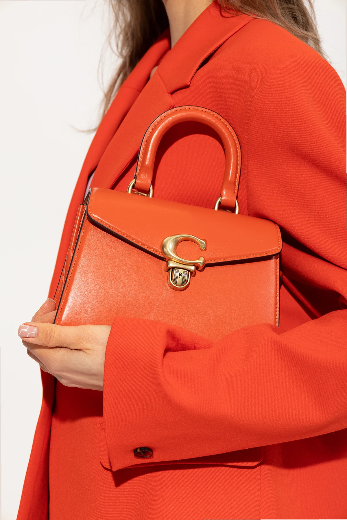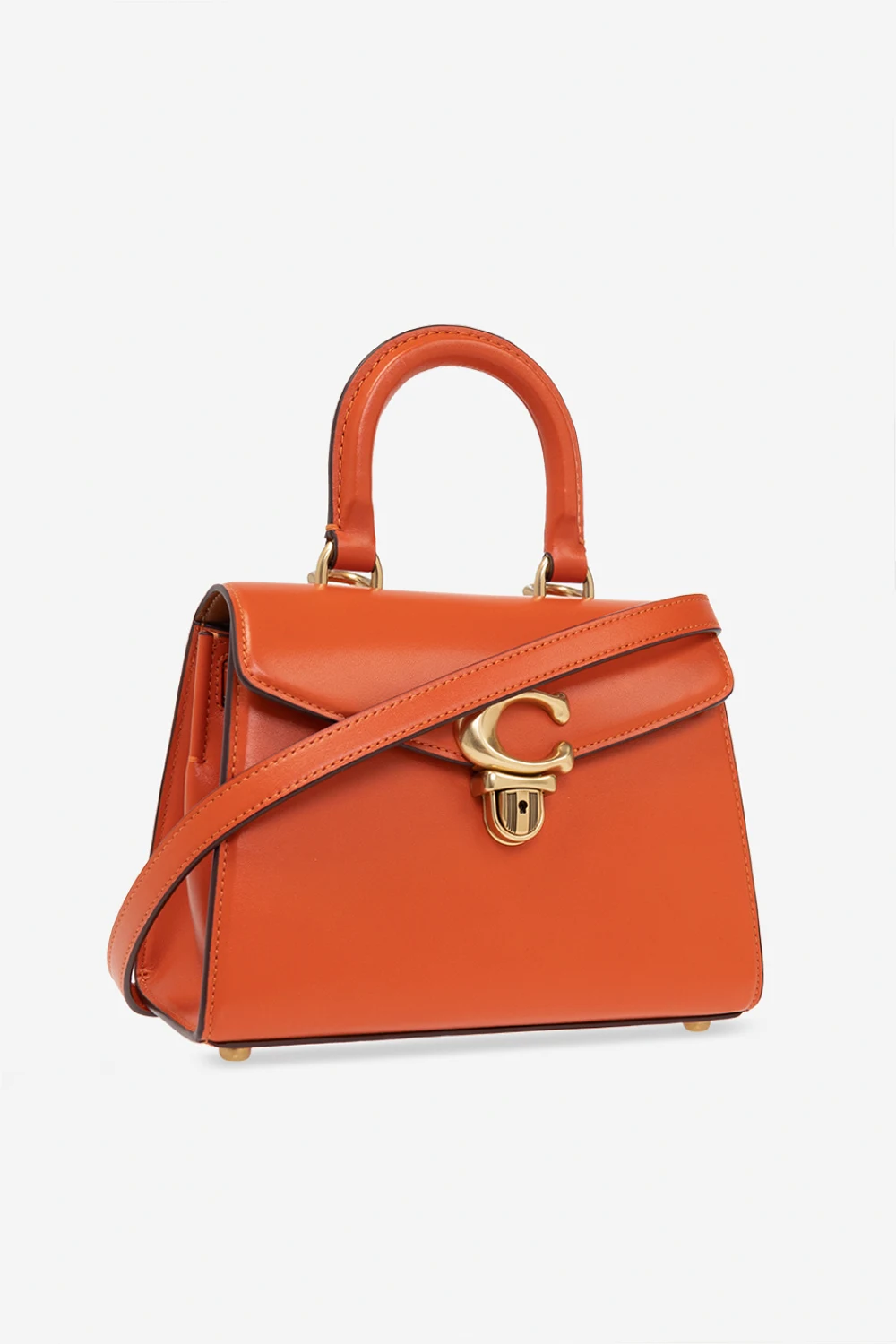Orange 'Sammy 21' shoulder bag from Coach. Made of leather, this design features a snap closure, logo detail, half-round handle, shoulder strap, gold-tone metal hardware and one internal compartment with one pocket.