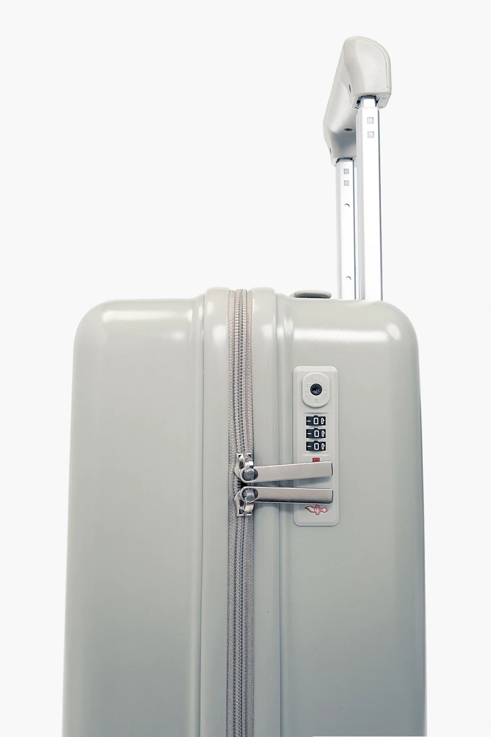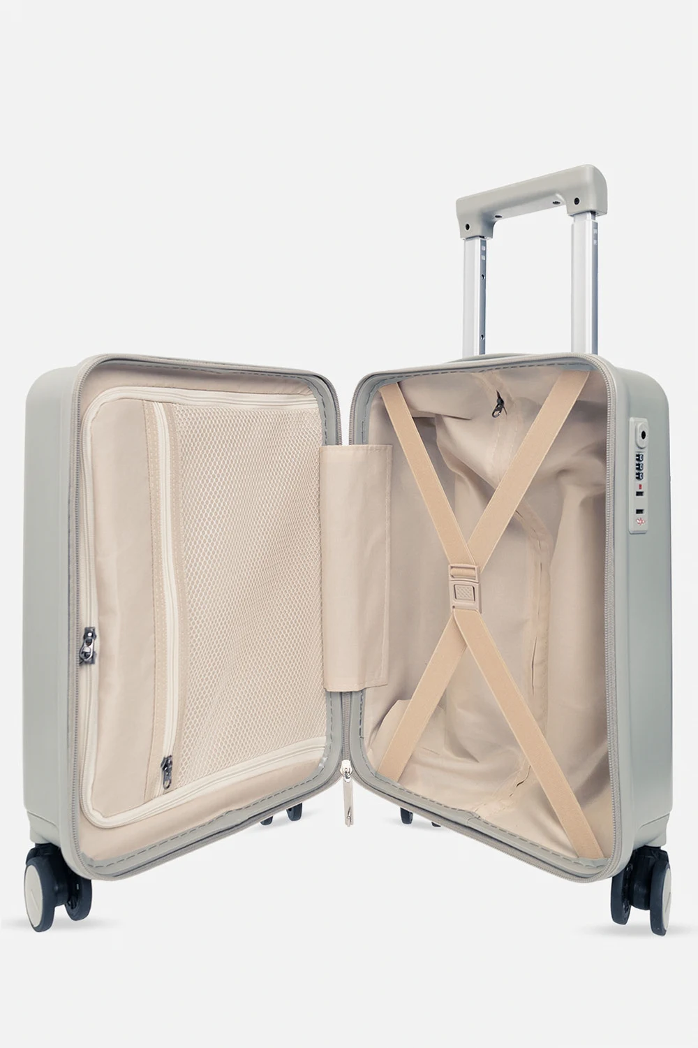 Grey and green suitcase from Konges Slojd. Fastened with a two-way zip with a built-in coded TSA LOCK®, this carry-on luggage features a dinosaur print, top handle, 3-step telescopic handle and four double 360-degree spinner wheels. It has two internal compartments with elasticated straps and zipped mesh pocket.