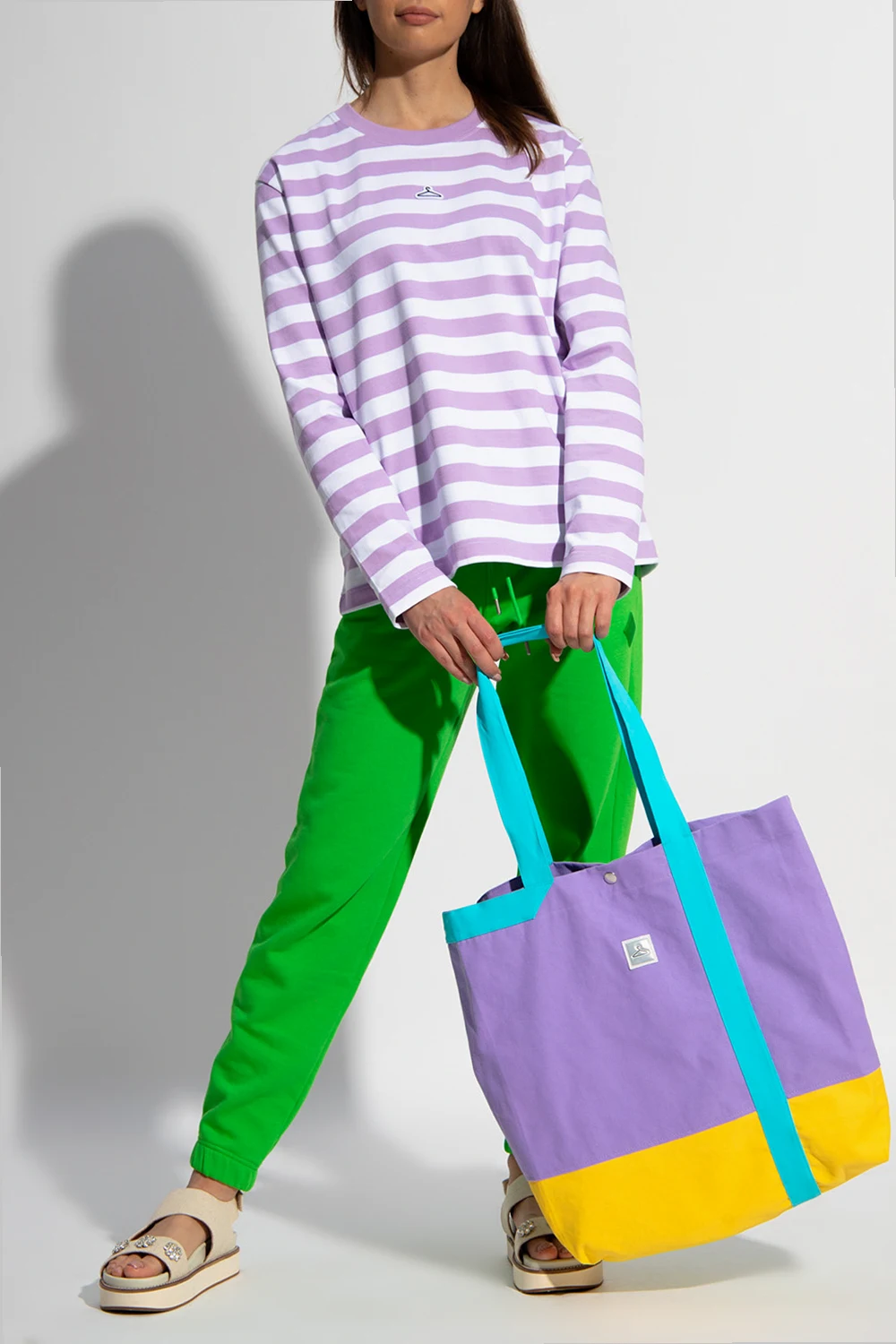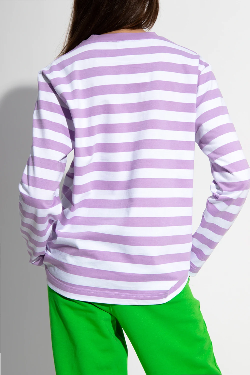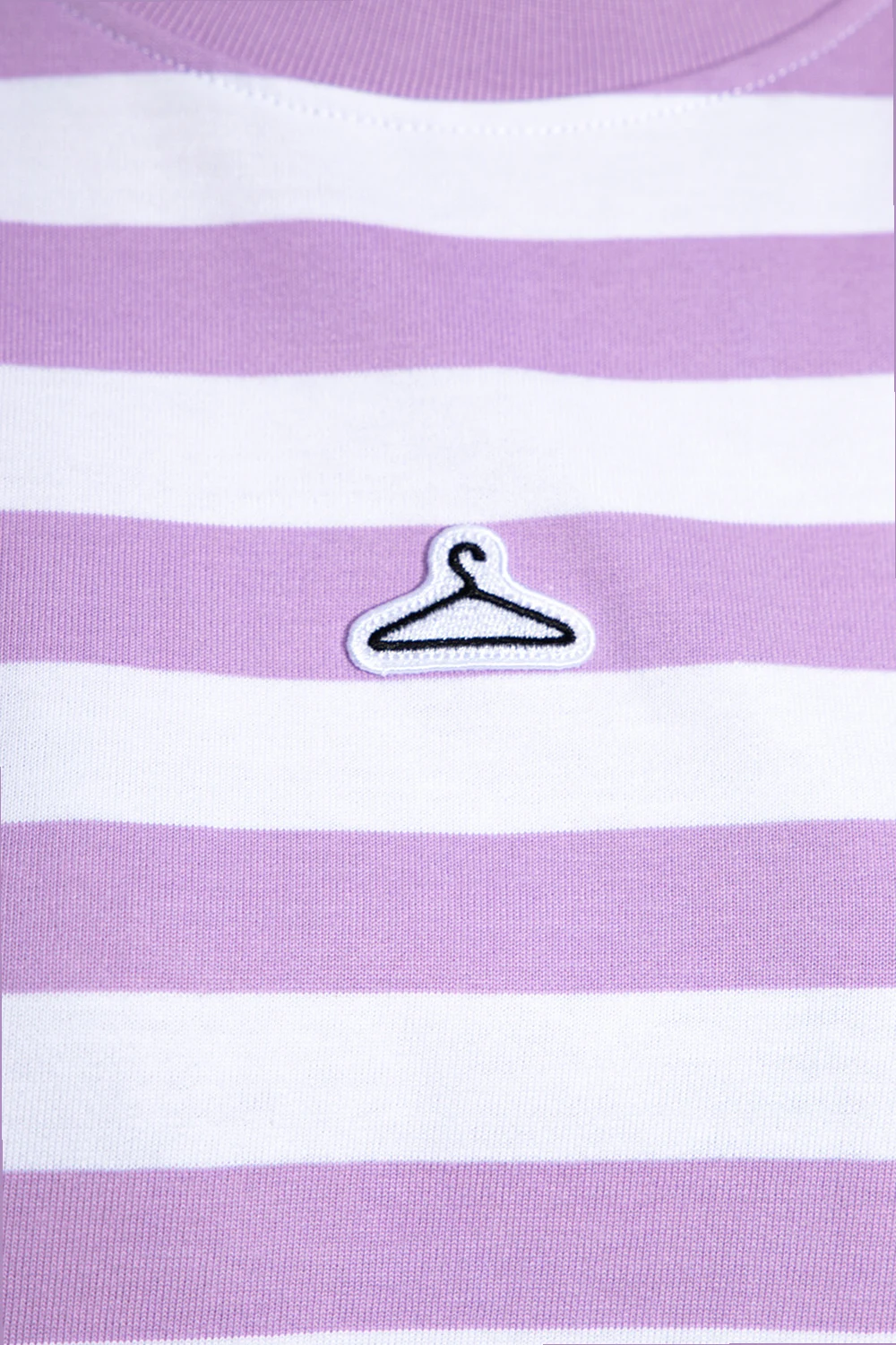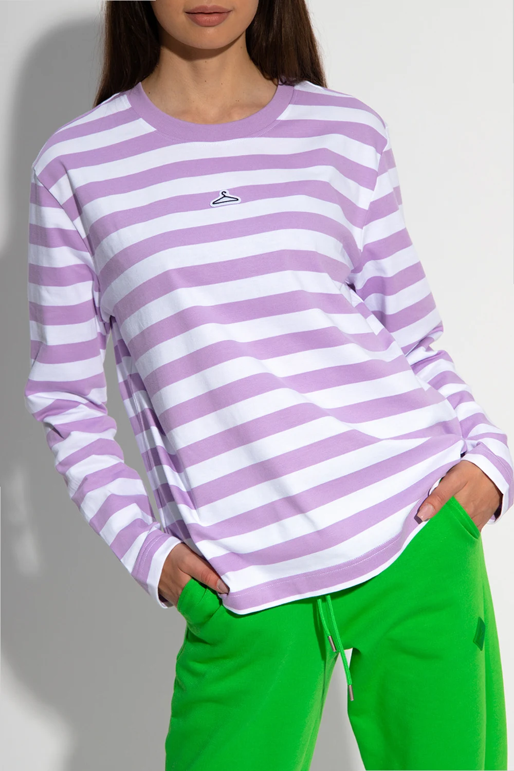 White and purple T-shirt from Holzweiler. Made of organic cotton, this long sleeve garment features a stripe pattern, white and black logo patch and a ribbed round neck.
