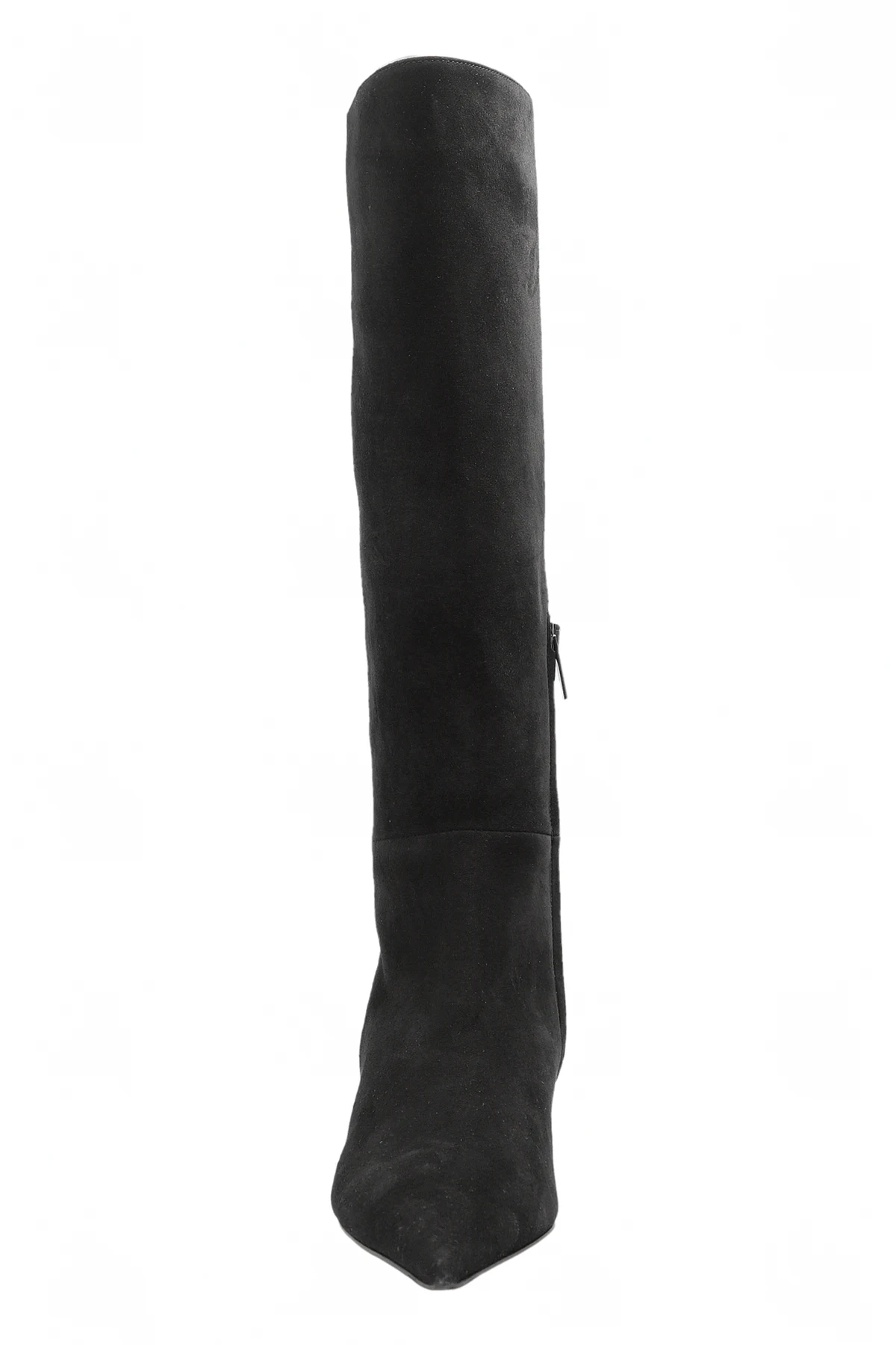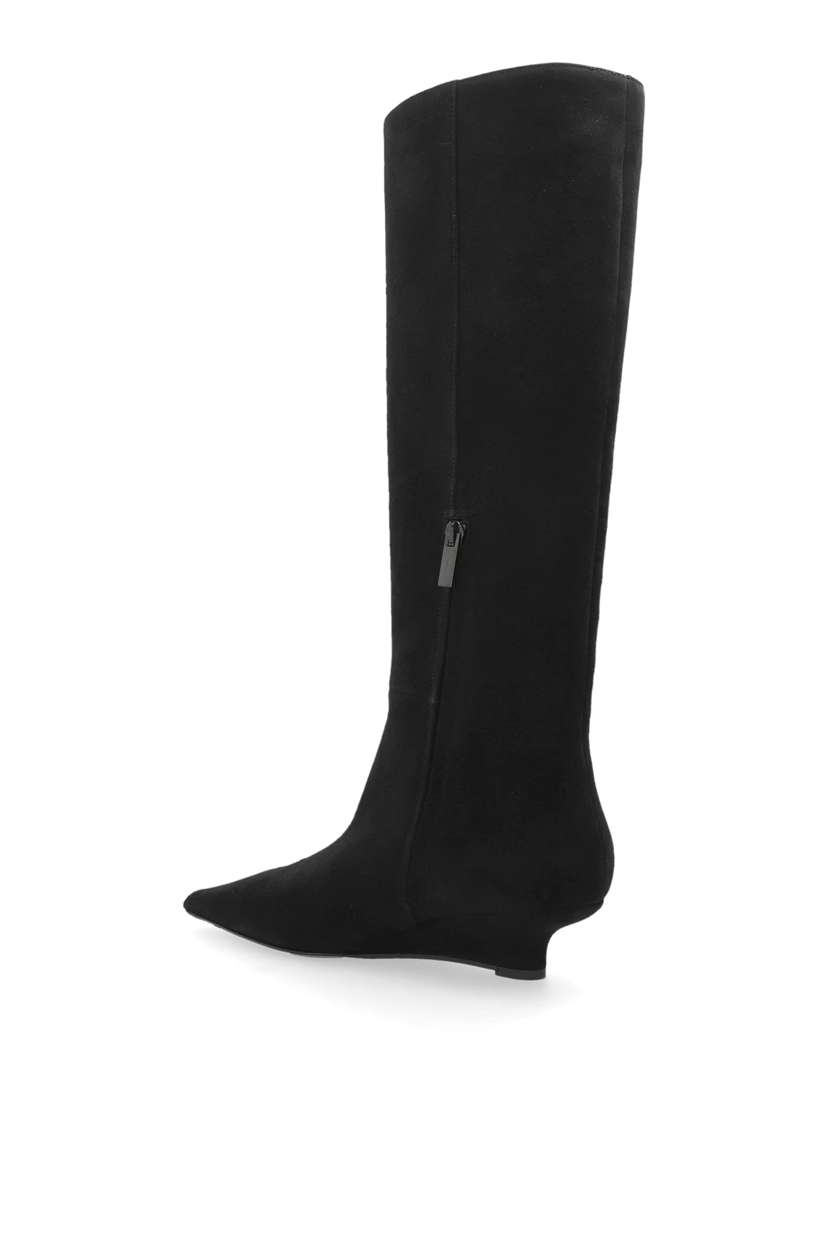 Die Stiefel zeichnen sich durch ihre schlanke Form und den hohen Schaft aus, der in einer schmalen, spitzen Kappe endet und ihnen ein raffiniertes Aussehen verleiht. Aus schwarzem Leder, sowohl außen als auch innen, gefertigt, präsentieren sie einen luxuriösen Charakter. Der subtil integrierte niedrige Keil bietet Komfort und Eleganz, während der sichtbare seitliche Reißverschluss das An- und Ausziehen erleichtert.