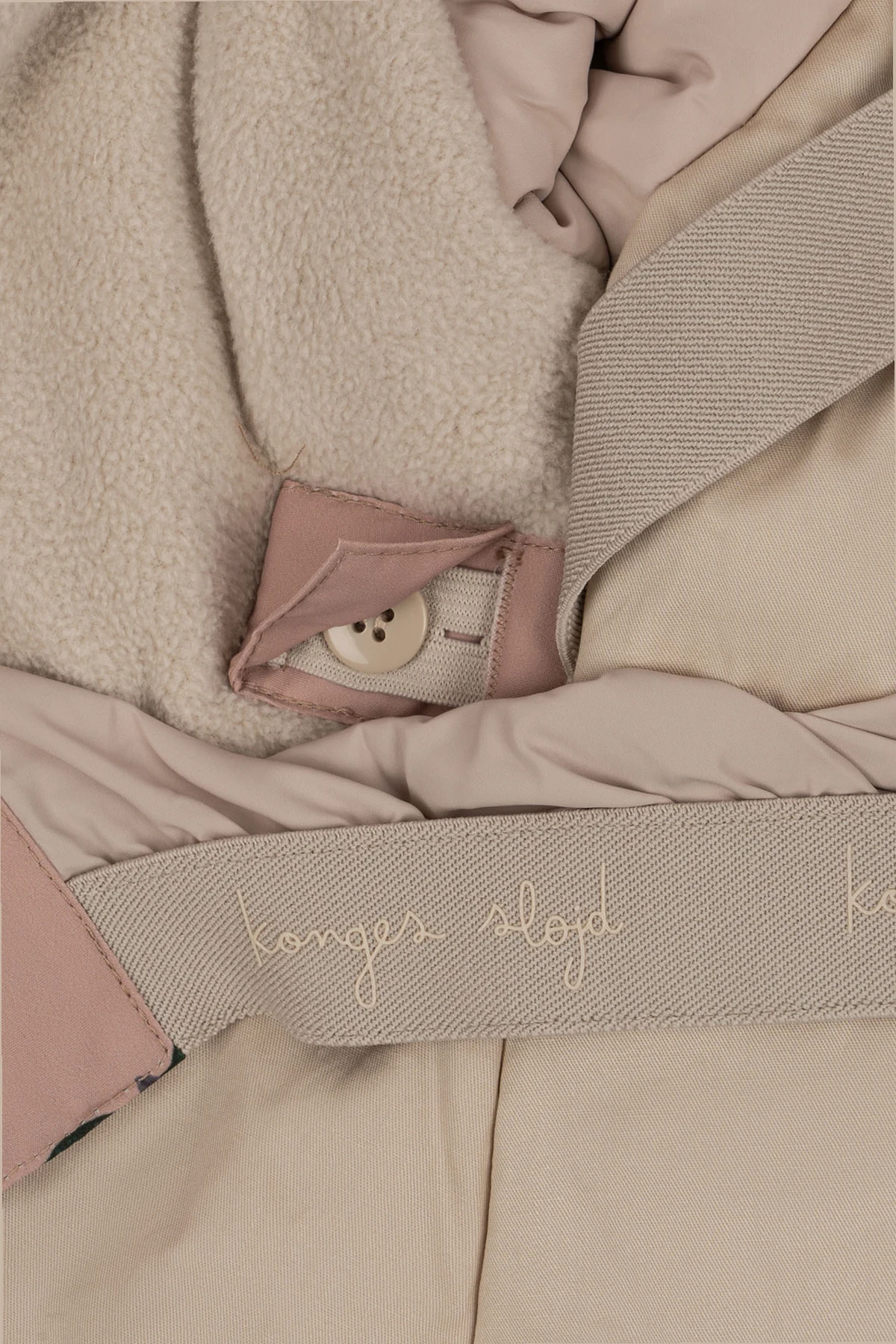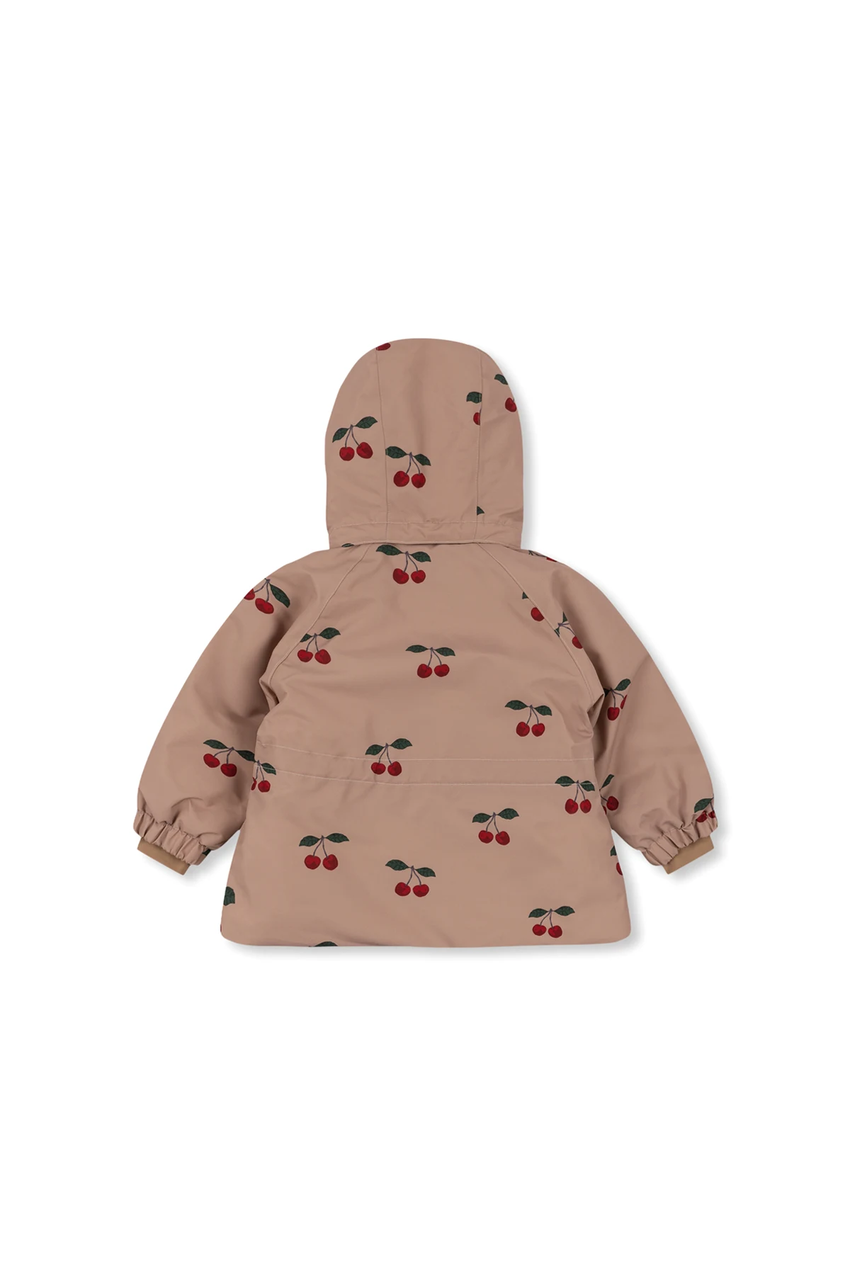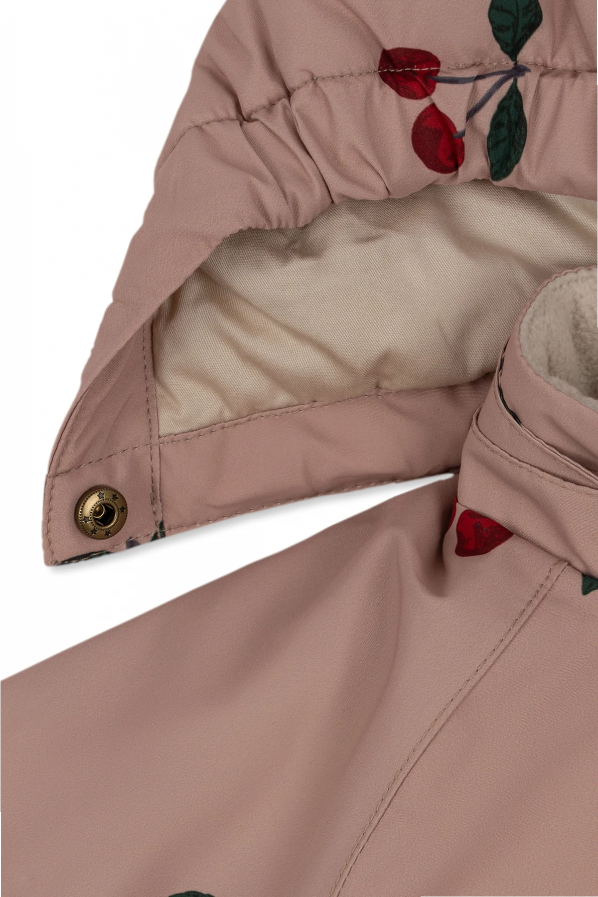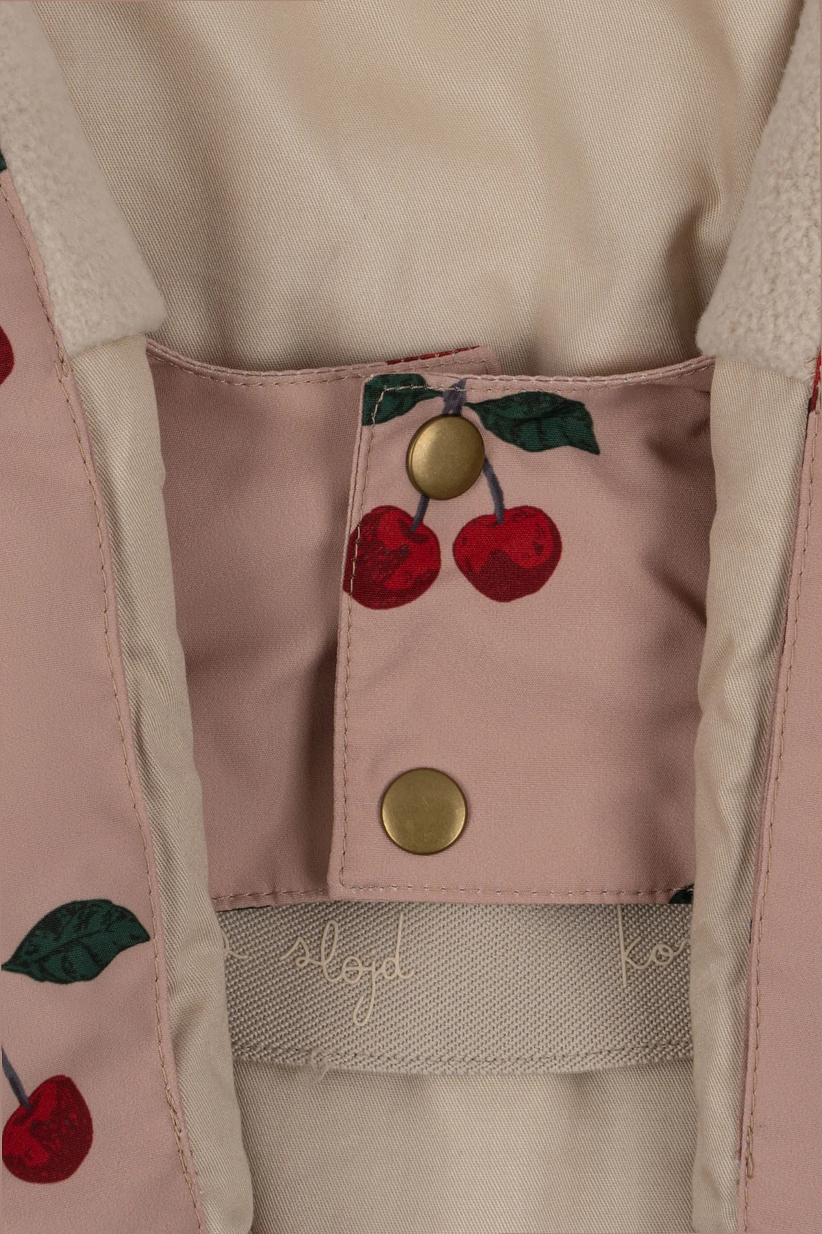 Pink ‘Mismou’ insulated jacket from Konges Slojd. Crafted from fabric with the OEKO-TEX® Standard 100 certificate, water-repellent BIONIC-FINISH*ECO impregnation and THERMOLITE® EcoMade insulation. Fastened with snap buttons and a zip, this design features a cherry motif, detachable hood, three zip pockets, ruffle hem, long sleeves with ribbed cuffs and an elastic wrist gaiter as well as internal shoulder straps and a snap-fastened snow belt.
