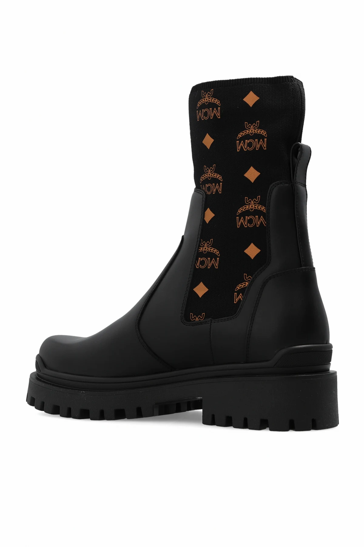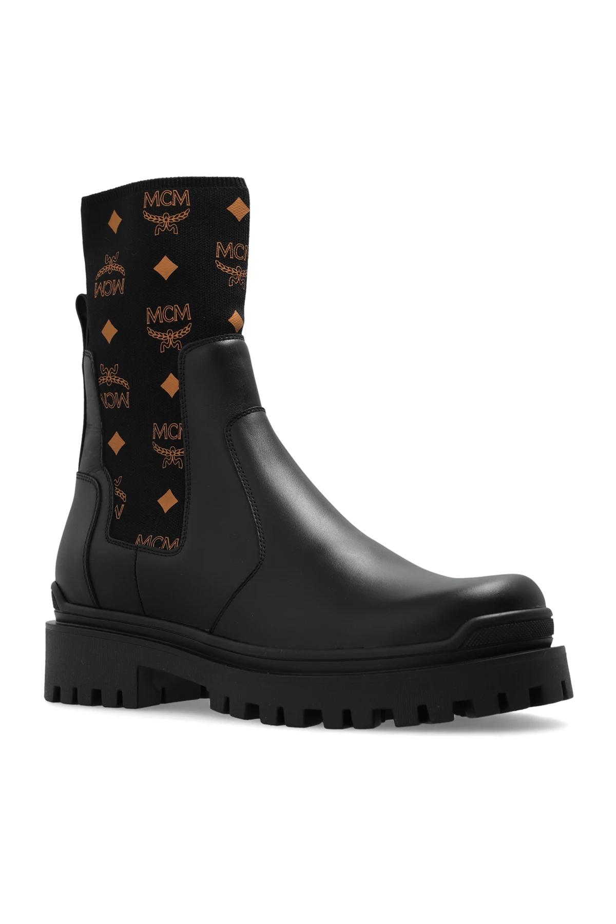 Black ankle boots from MCM. Made of leather, this pair features a sock with a brass-tone monogram, rounded toe and black rubber sole.