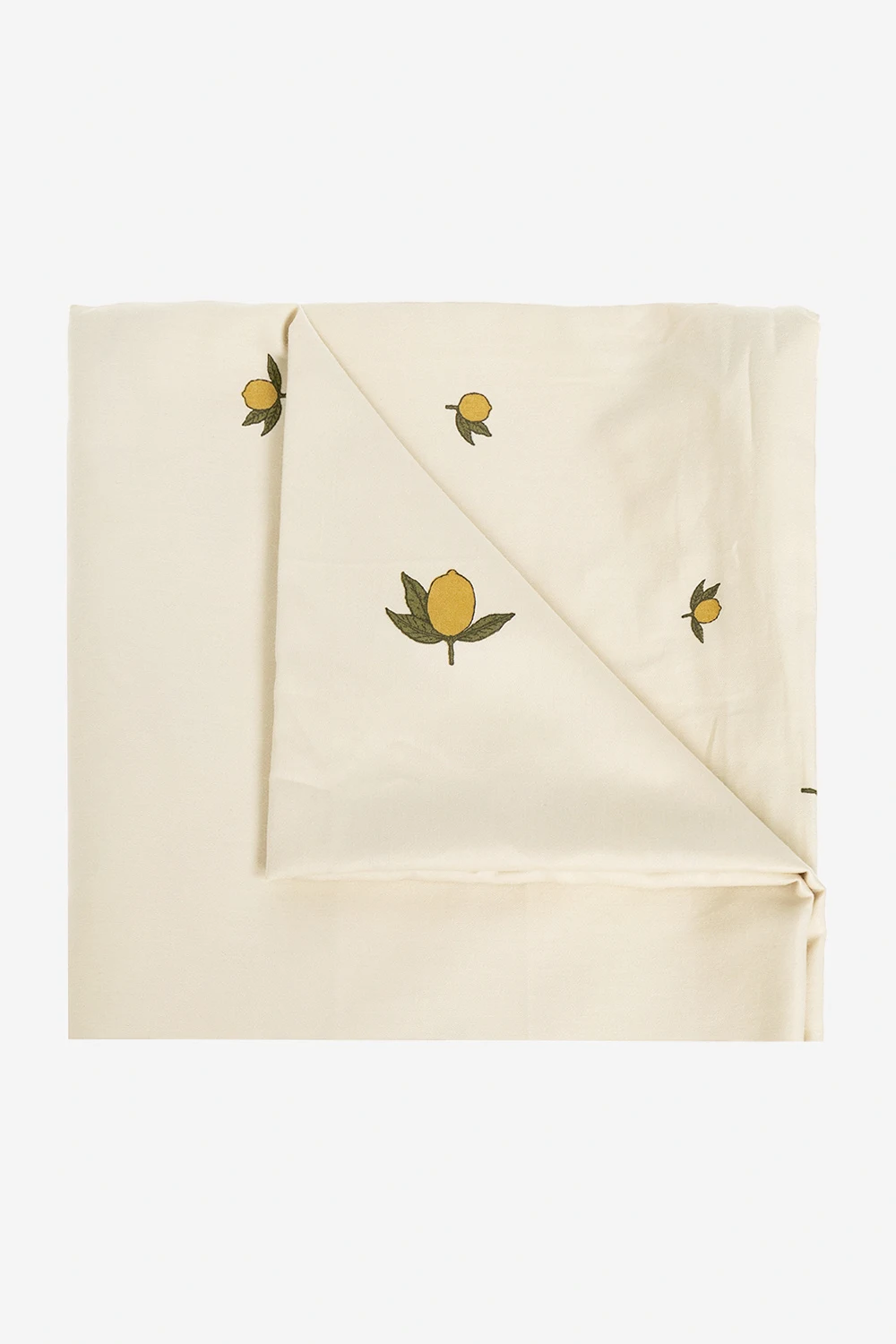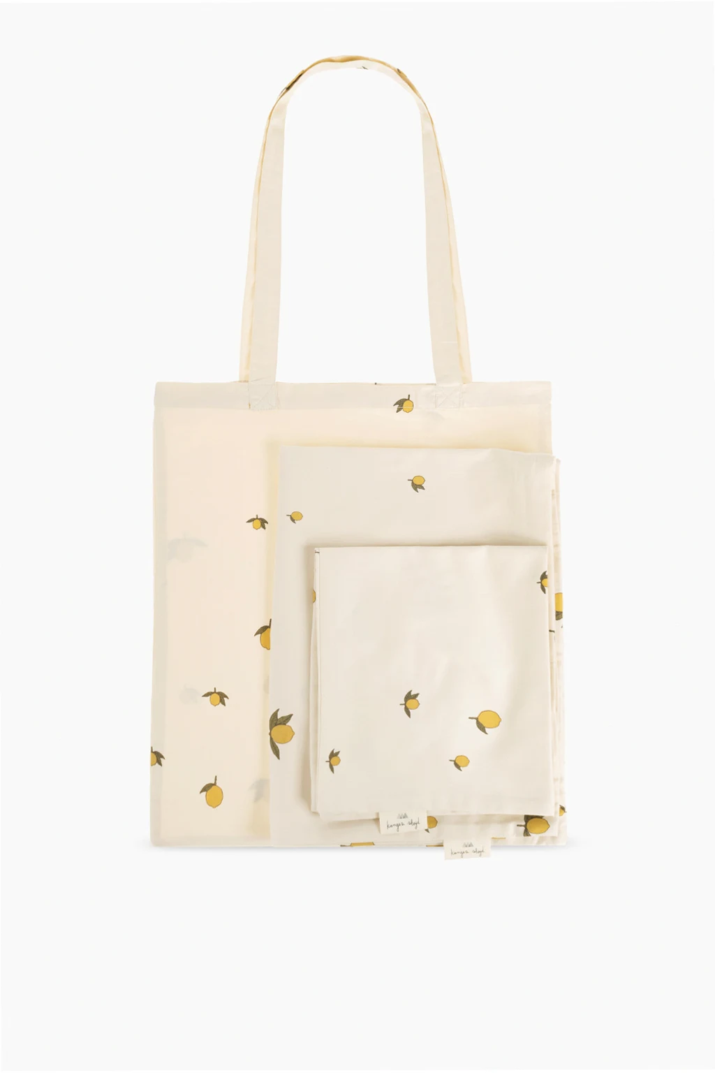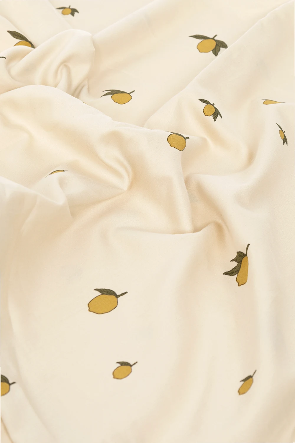 Cream bedding set from Konges Slojd. Crafted from organic cotton, this item is fastened with a zipper and features a colourful lemon print. Each set is packaged in its very own matching cotton carry bag.