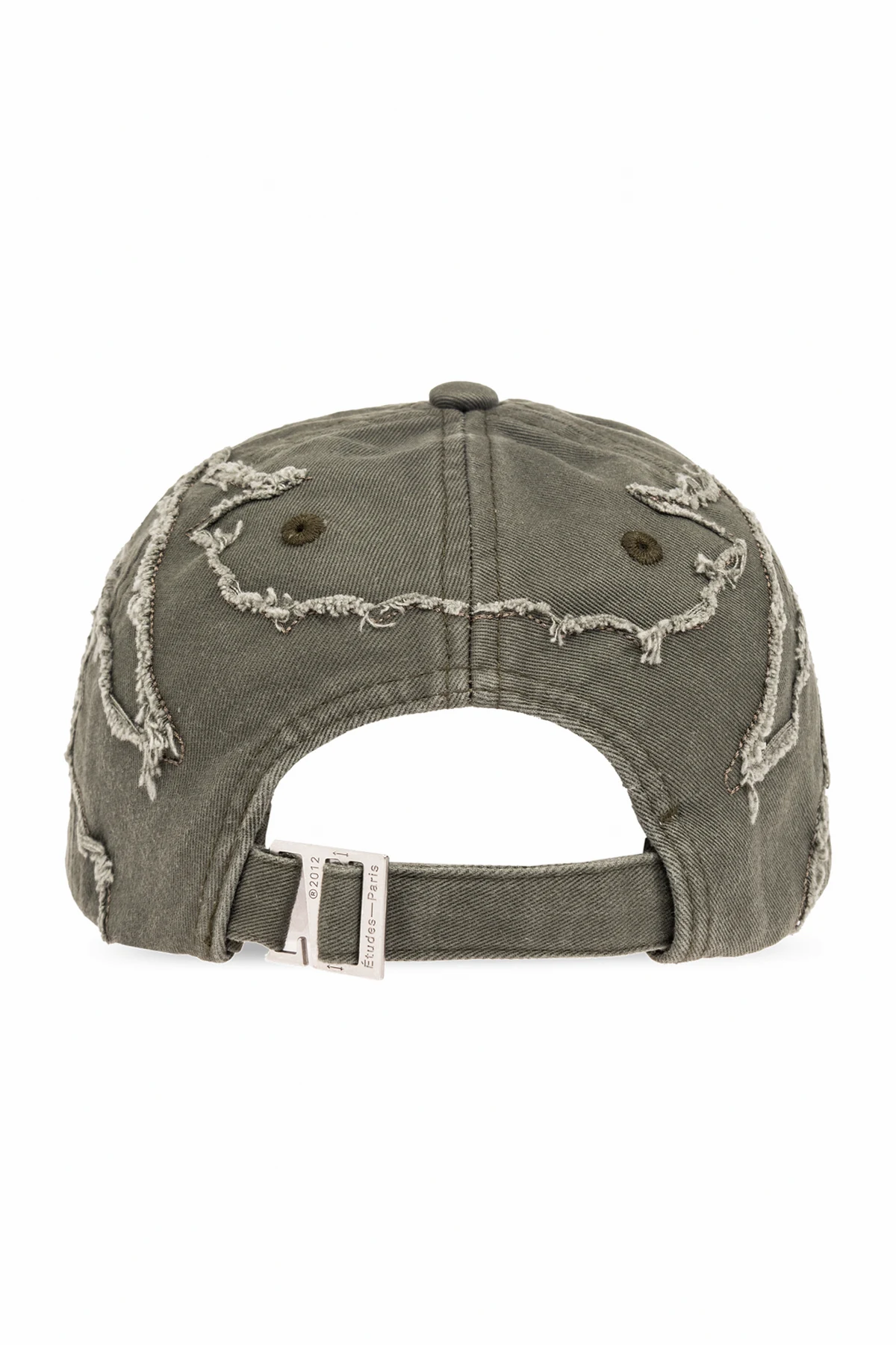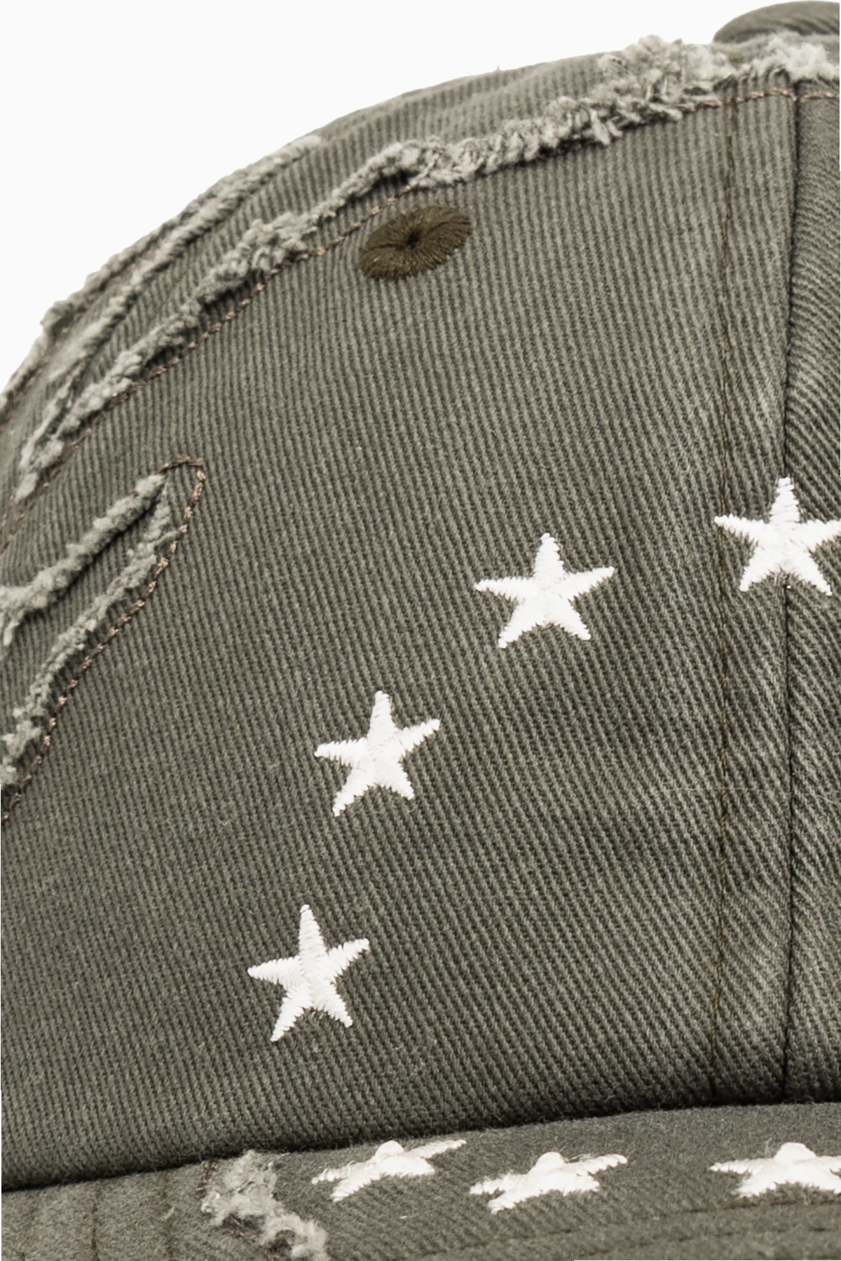 Ein charakteristisches Element des Designs ist das einzigartige Used-Look , erreicht durch wohlüberlegte Abnutzungen und Fransen, insbesondere an den Rändern des Schirms sowie an der Krone. Die Kappe erhält ihre Wiedererkennbarkeit durch sorgfältig gestickte weiße Sterne , die in drei Reihen angeordnet sind, was ihr Ausdruckskraft und einen unverwechselbaren Charakter verleiht.