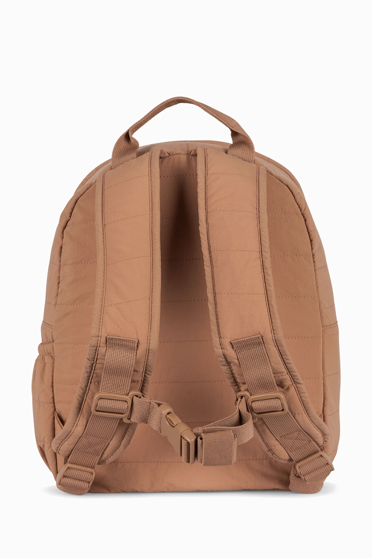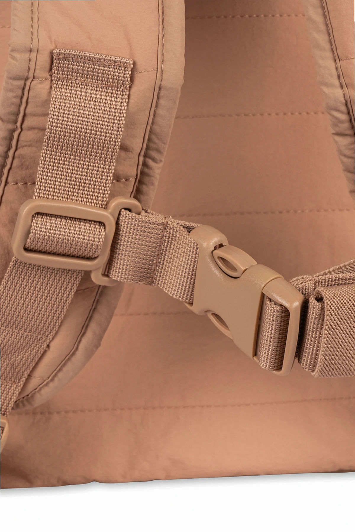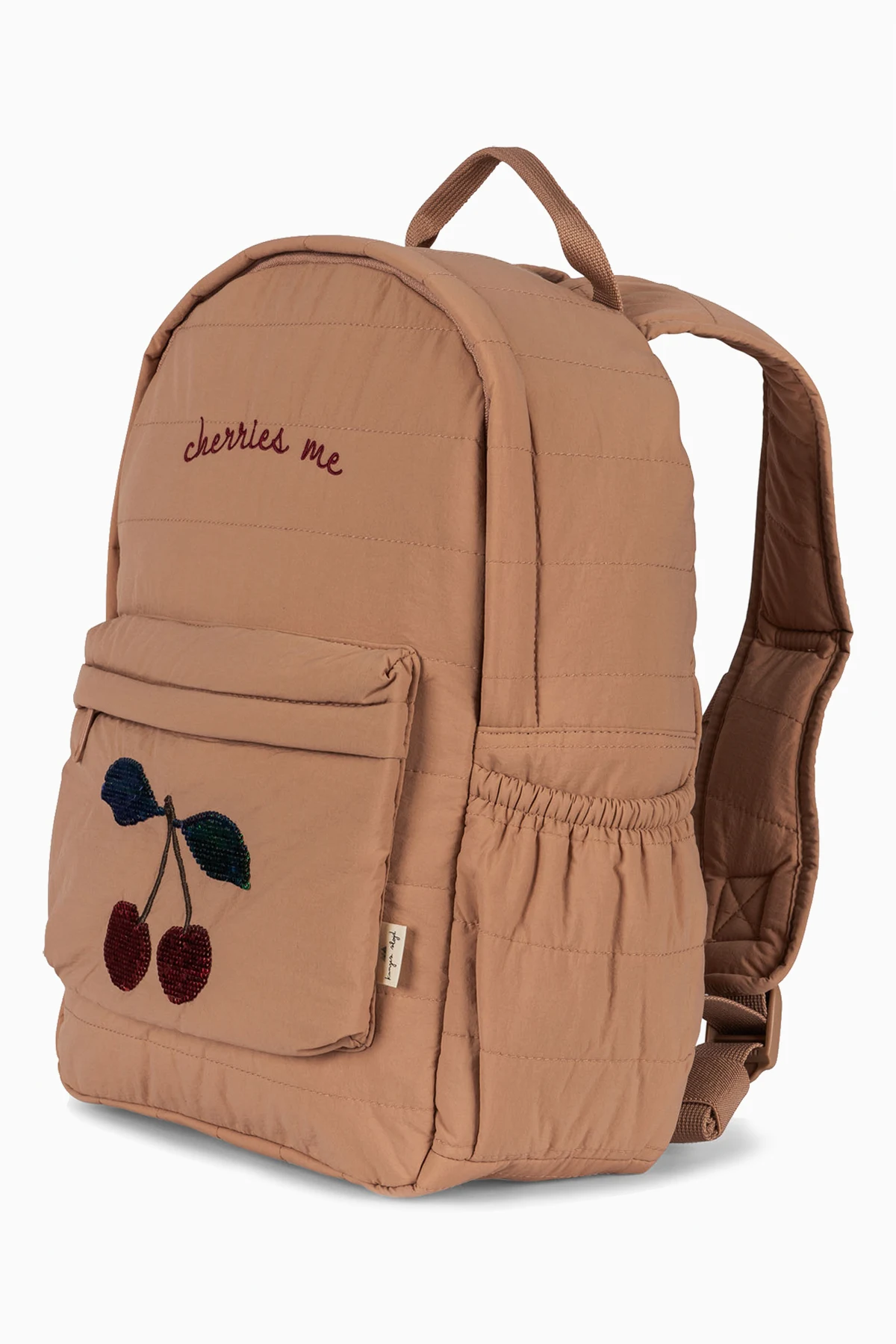 Blush pink backpack from Konges Slojd. Made of quilted fabric with a cherry motif. Light and spacious, suitable for all seasons, it will be the perfect companion for school adventures! It features an external bottle pocket, 3 small pockets, a chest strap and a handle. Inside the bag’s large compartment, you can write the child's name. Dirt resistant and easy to clean.