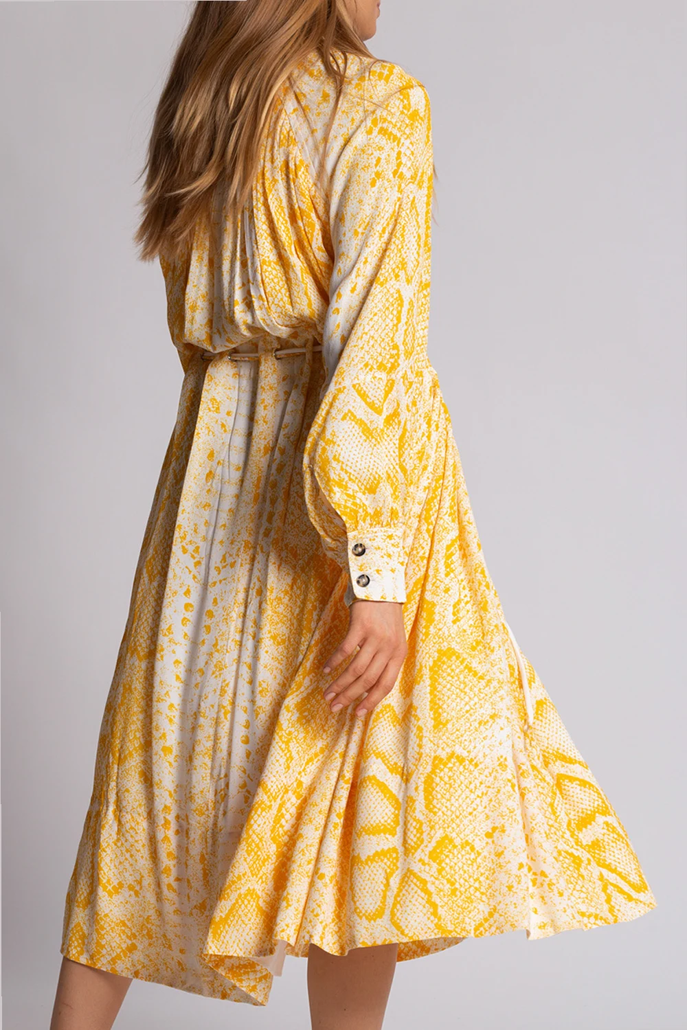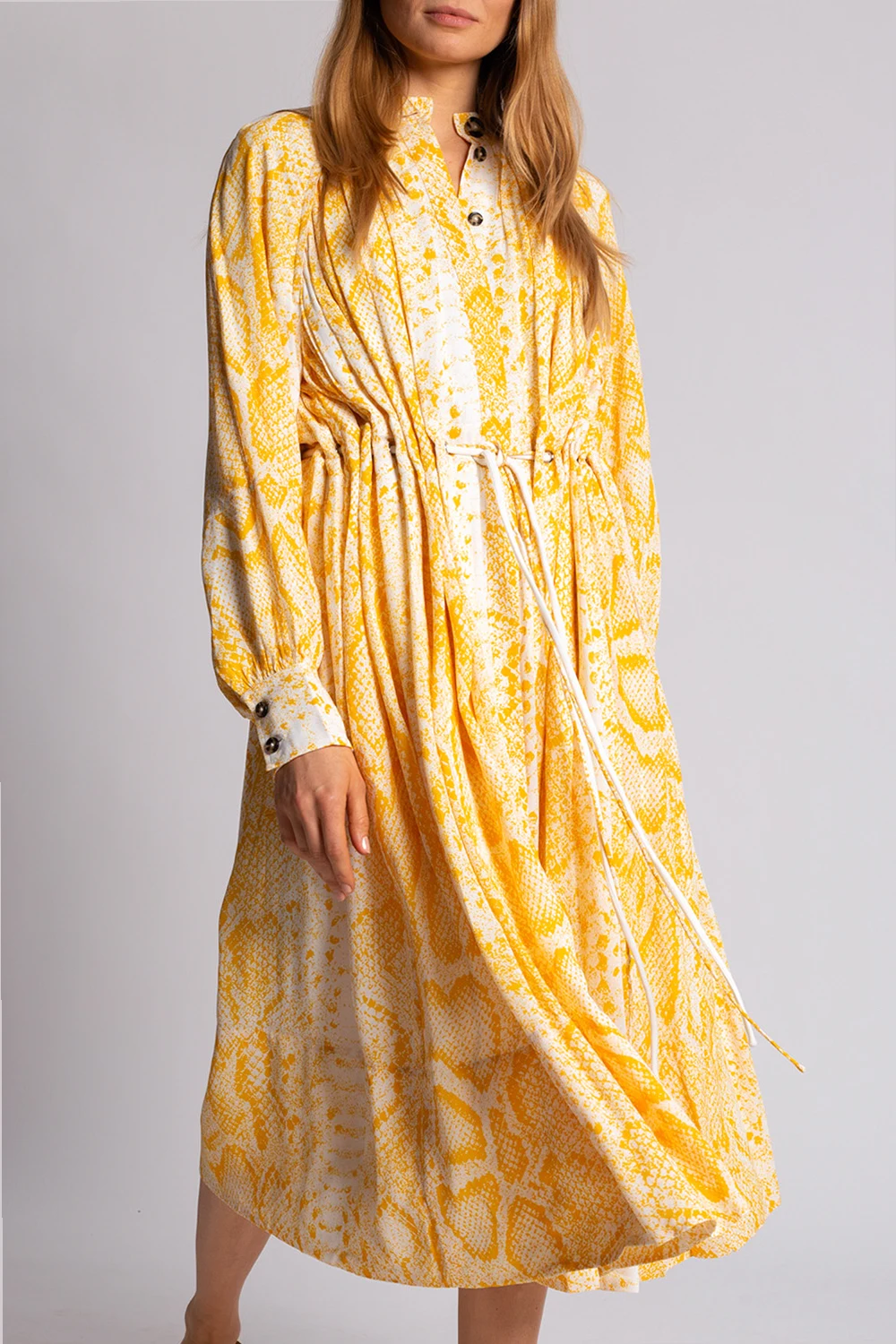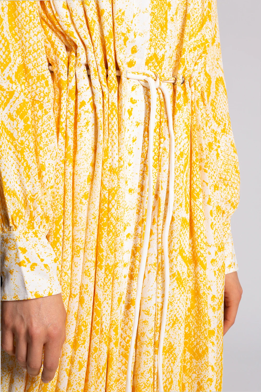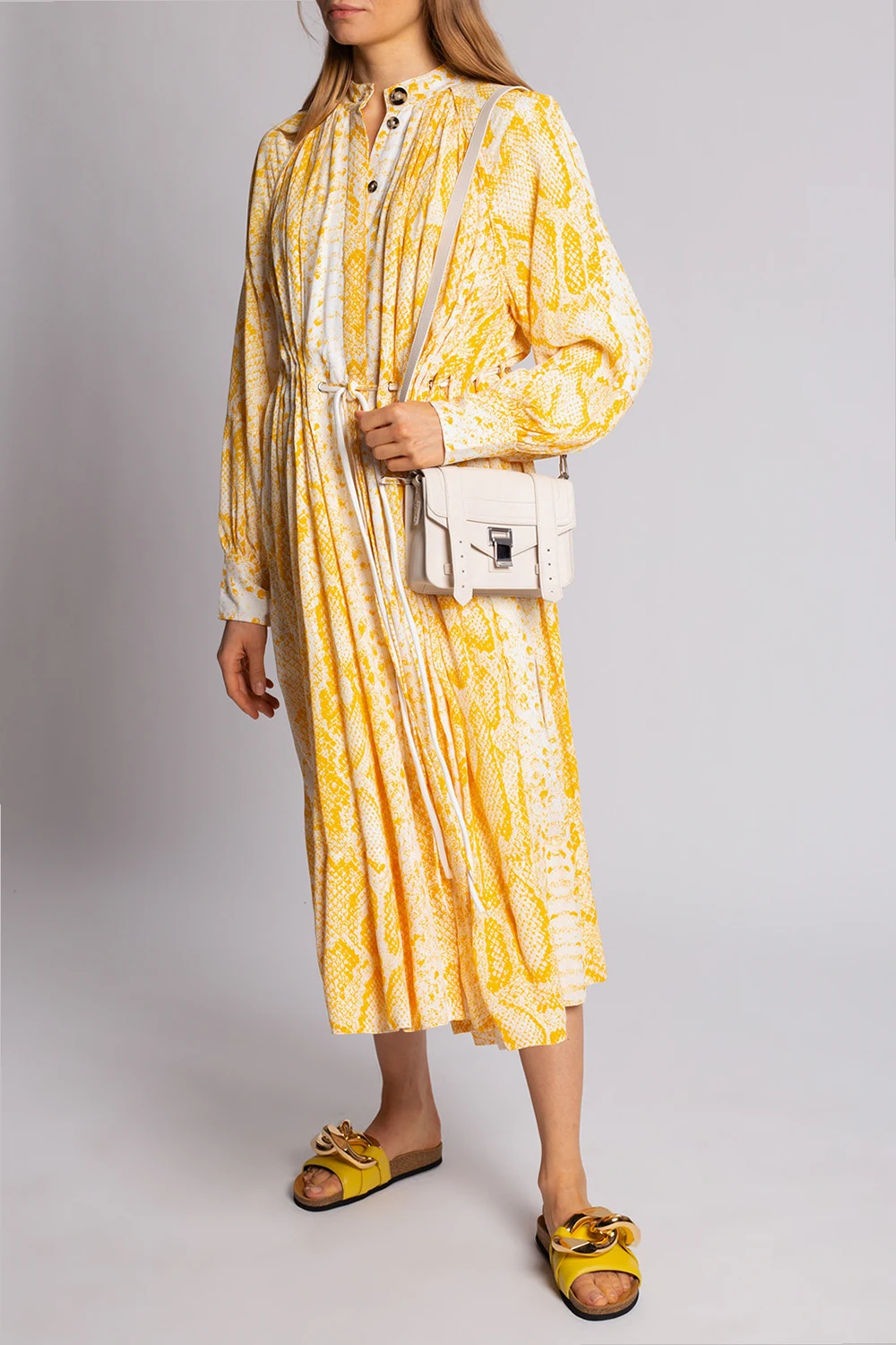 White and yellow dress from Proenza Schouler. Fastened with buttons with a concealed placket, this garment features a decorative tie waist and long sleeves.