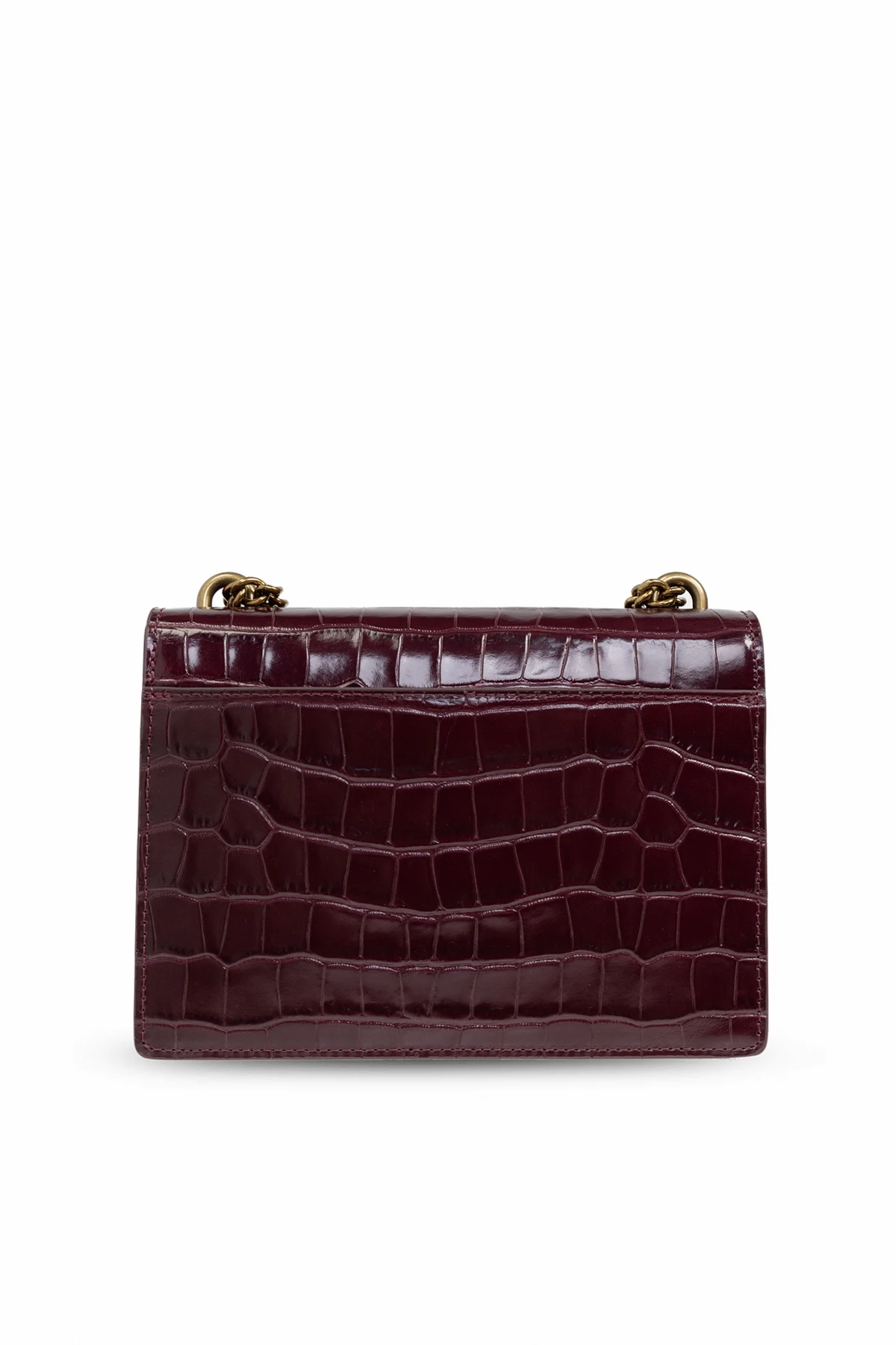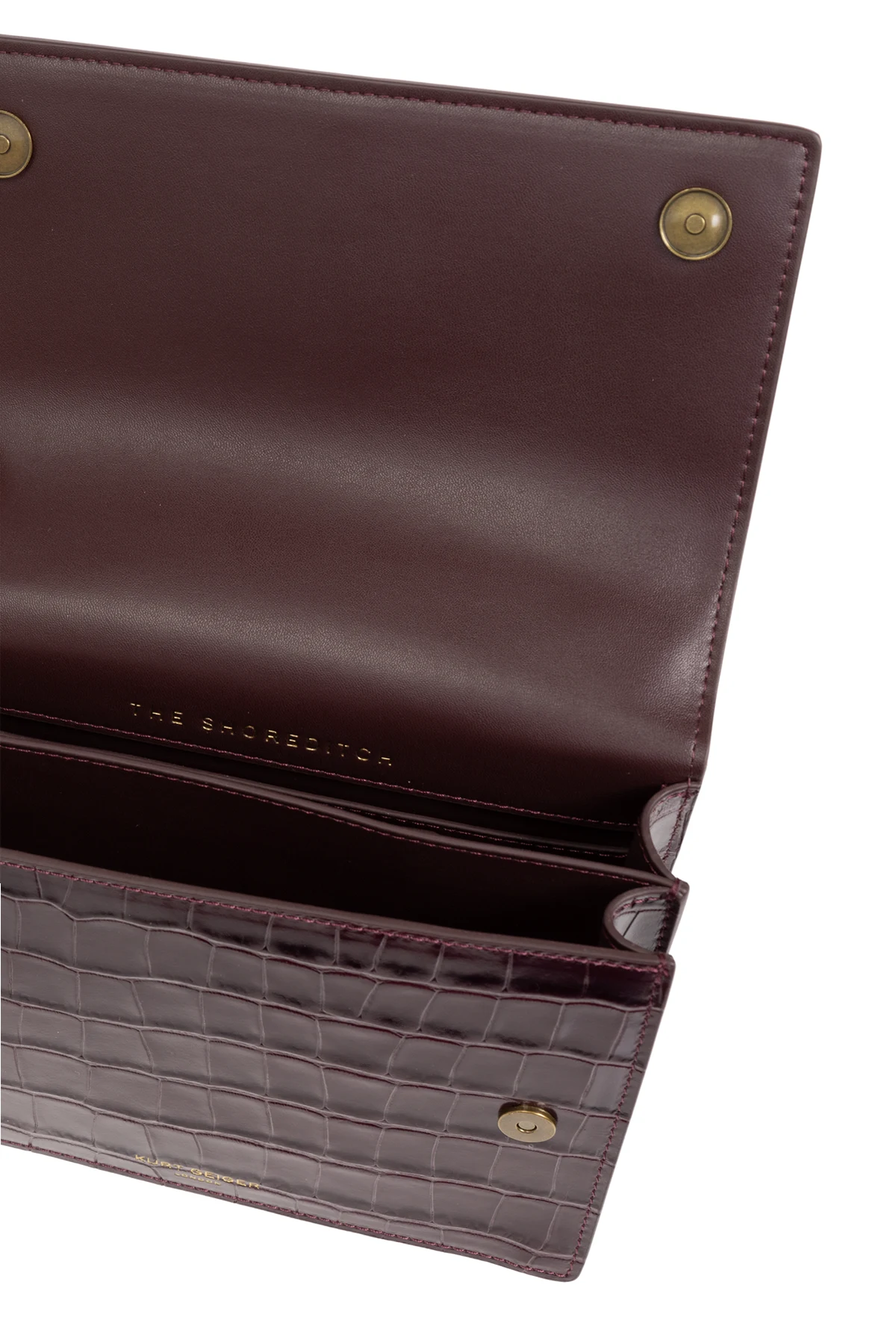 Die Tasche hat eine rechteckige Form und ist aus hochwertigem Leder gefertigt, das geprägt ist, um Krokodilleder zu imitieren. Die dominierende burgunderrote Farbe unterstreicht ihren raffinierten Charakter. Auf der Vorderseite der Tasche befindet sich ein dekorativer Verschluss in Form eines Tierkopfes, verziert mit farbigen Steinen, und eine goldene Kette dient als Schulterriemen. Das Ganze wird durch den Schriftzug "KURT GEIGER LONDON" in goldener Farbe vervollständigt.
