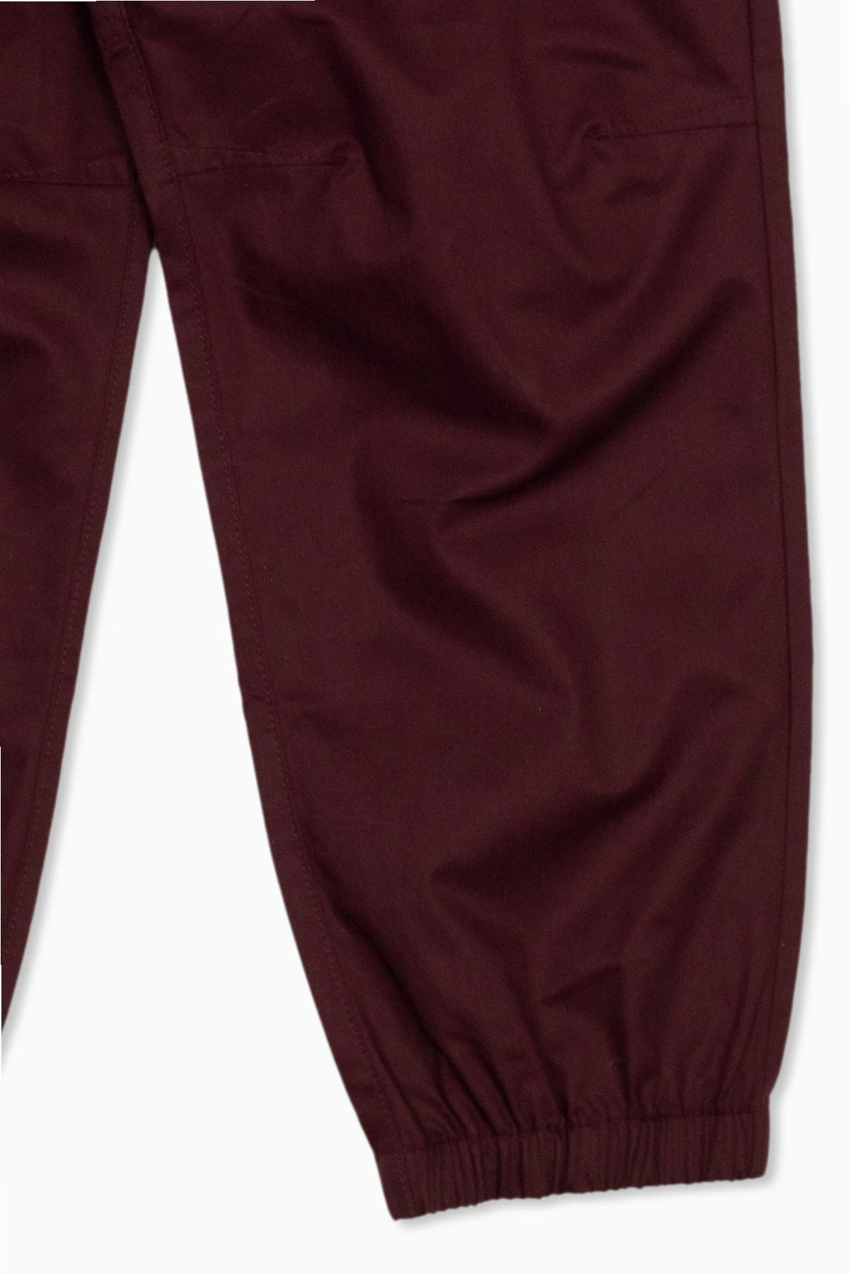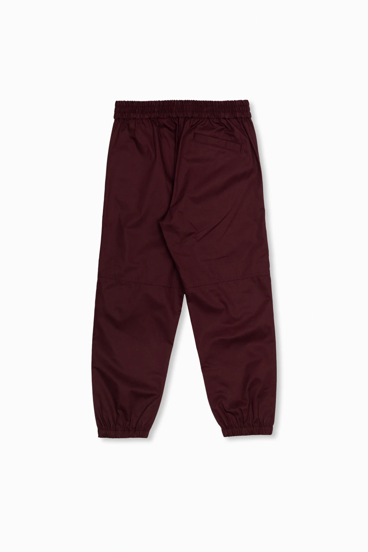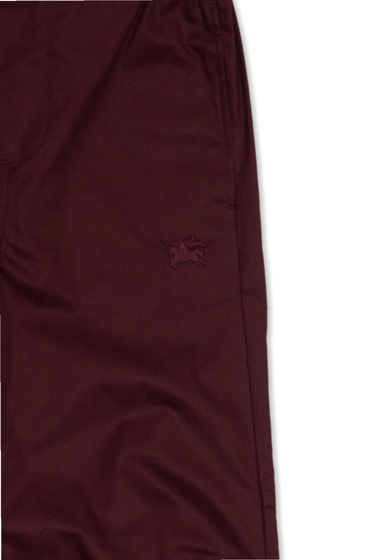 Maroon trousers from Burberry Kids. Made of cotton, this pair features an elasticated waistband and cuffs, an embroidered logo as well as two slip pockets on the front and one at the back.