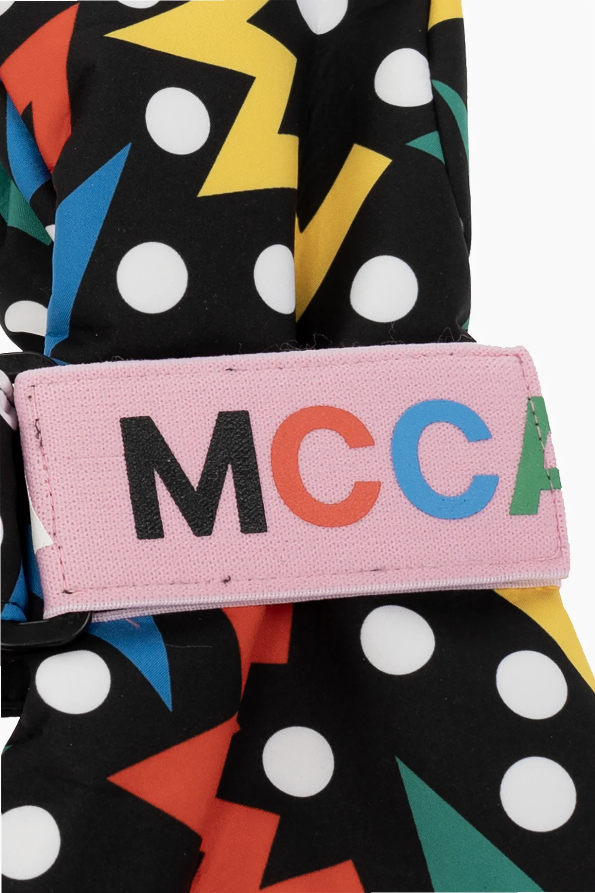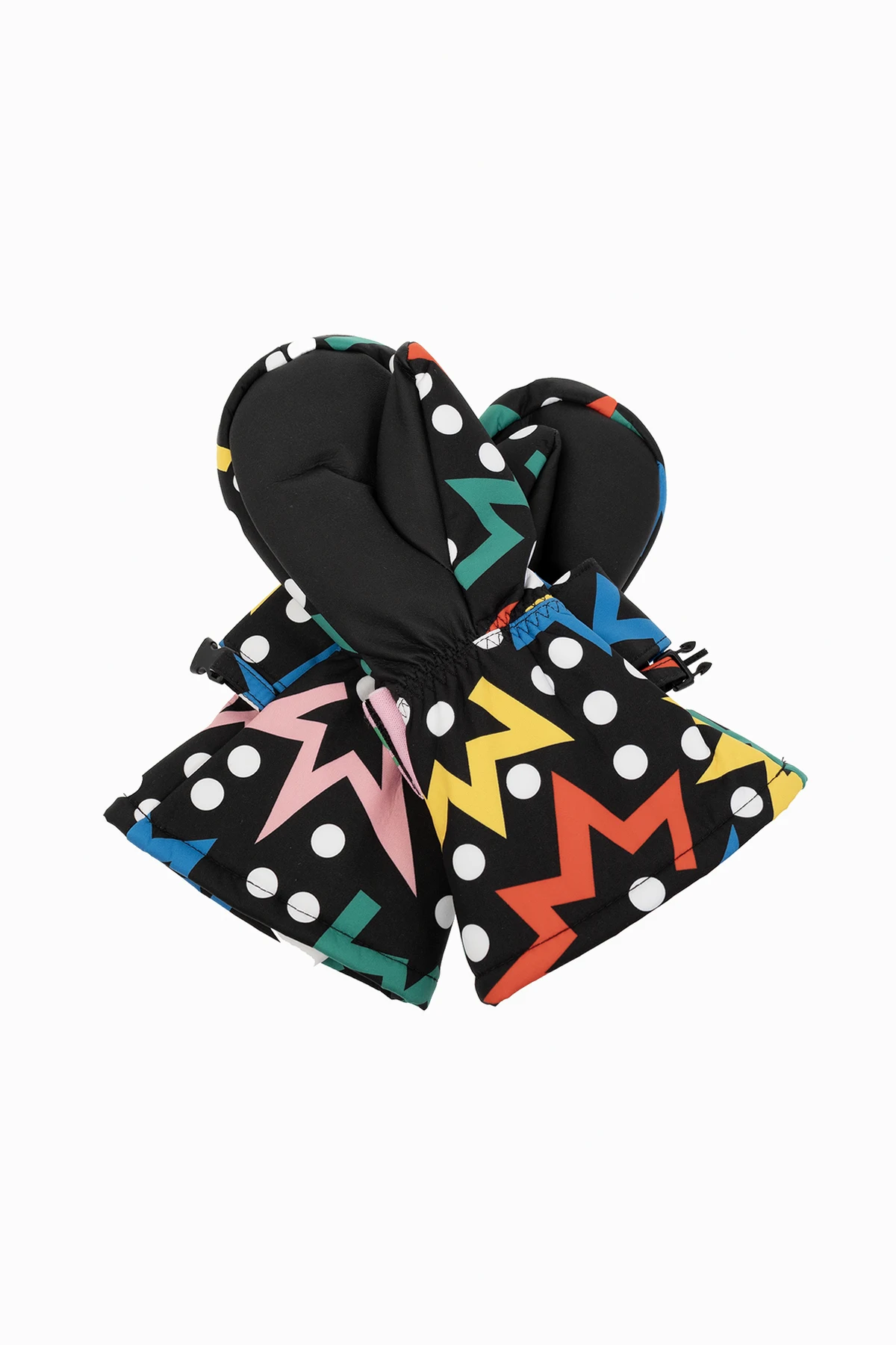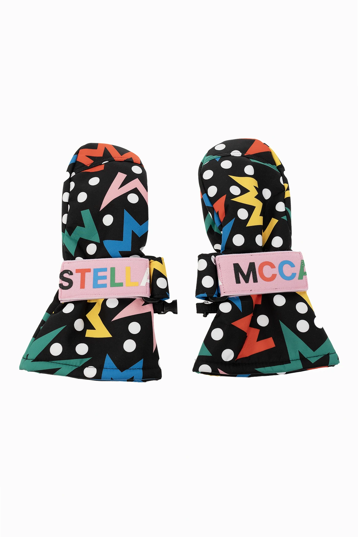Black ski gloves from Stella McCartney Kids. Made from recycled materials, this pair fastens with branded velcro straps and showcases a colourful pattern with dots and stars. It is complete with a fleece lining. Connected via a snap.