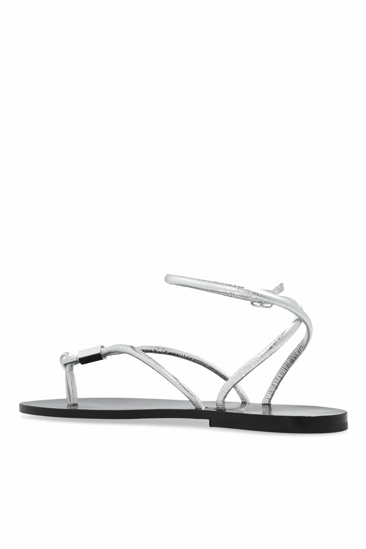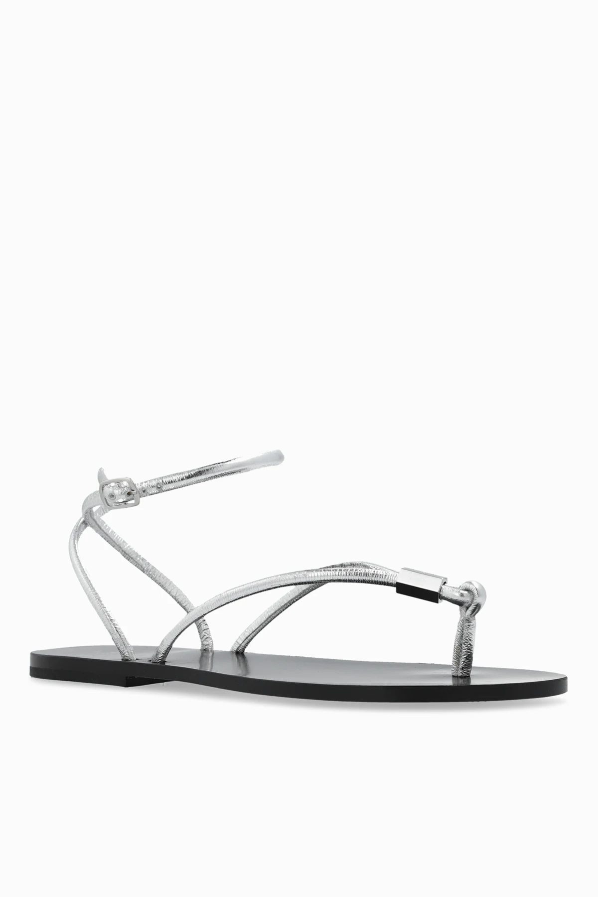 Sie zeichnen sich durch eine einzigartige Kombination von Riemen aus, deren glänzendes Material den Fuß subtil umschlingt und ihm Leichtigkeit und Anmut verleiht. Die verstellbare Knöchelschnalle ermöglicht eine perfekte Passform und sorgt für Tragekomfort, während die flache, lederne Sohle Bequemlichkeit den ganzen Tag garantiert. Die dominierende silberne Farbe, kombiniert mit einer metallischen Applikation mit eingraviertem Logo auf der Vorderseite, unterstreicht den exklusiven Charakter dieser Sandalen.