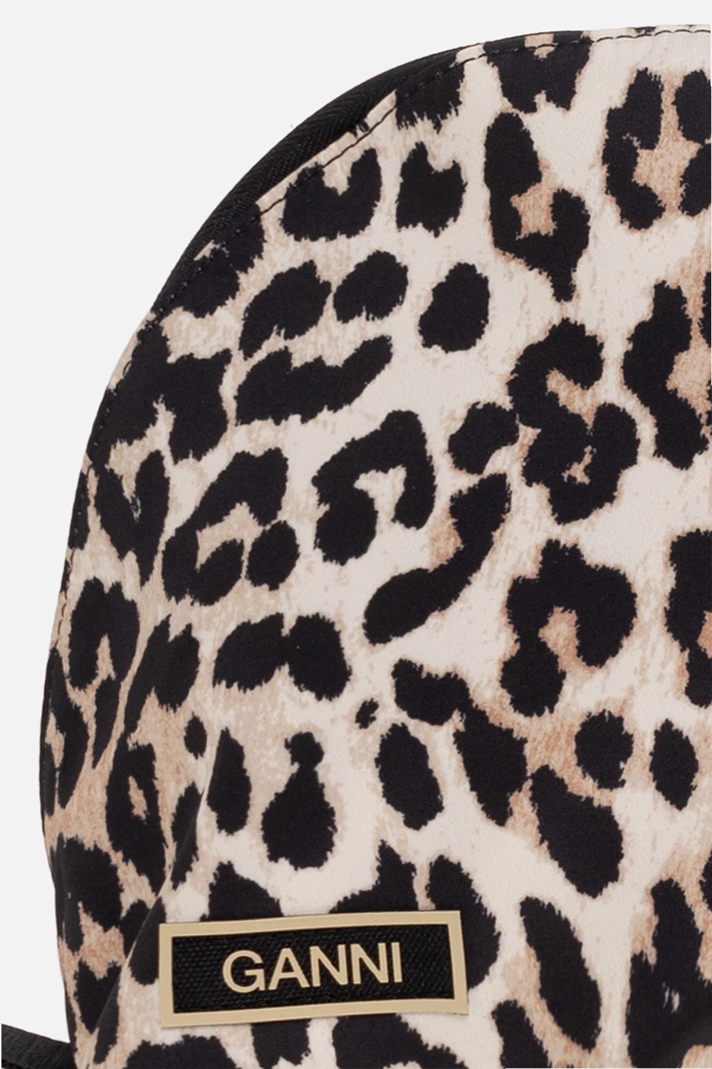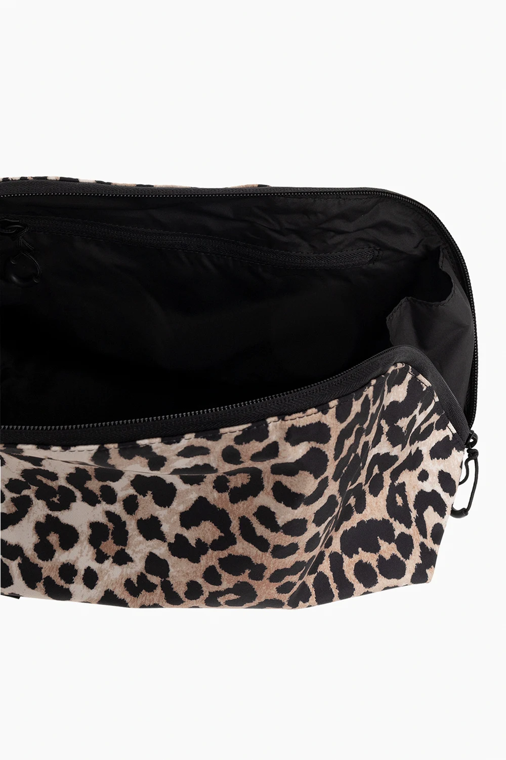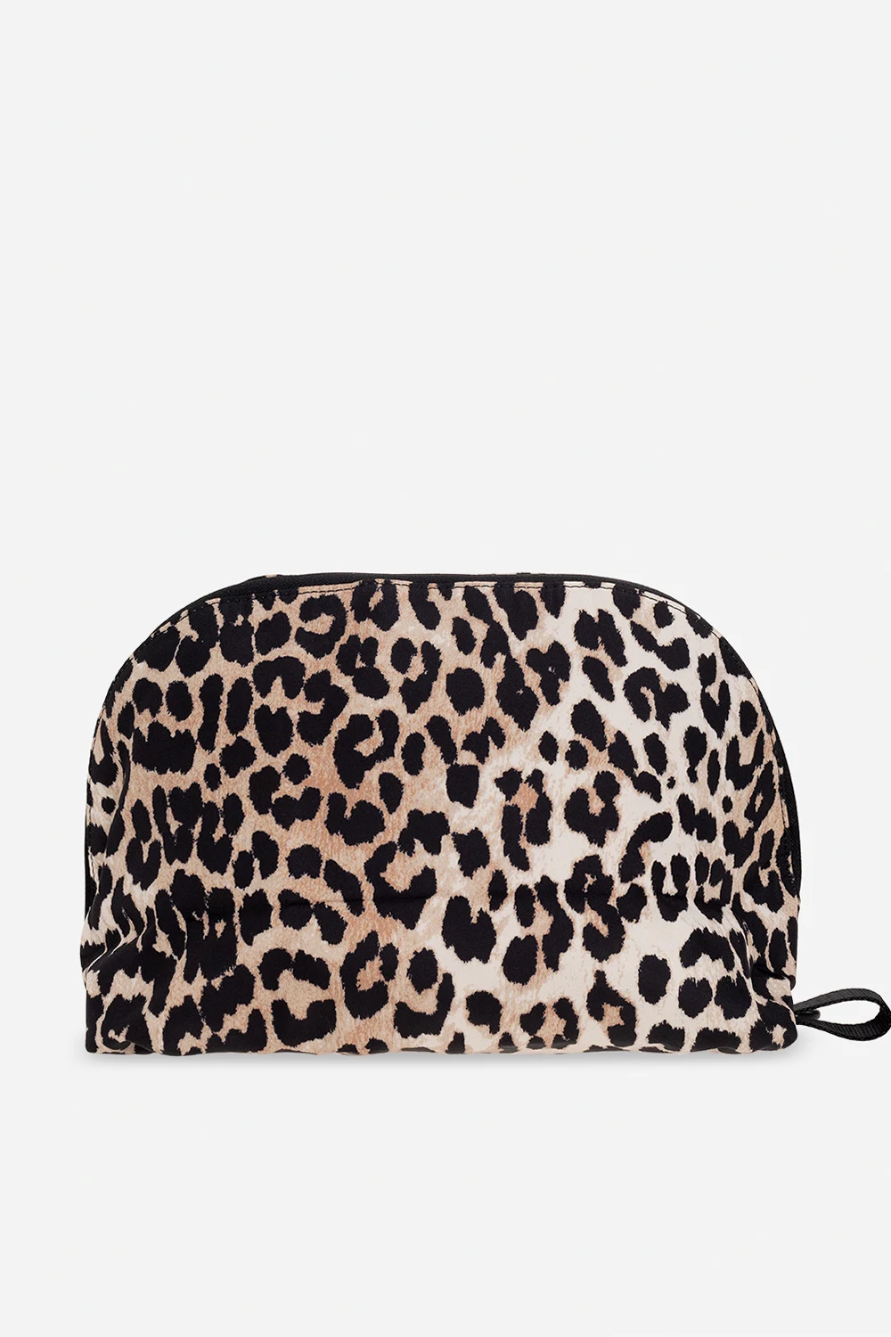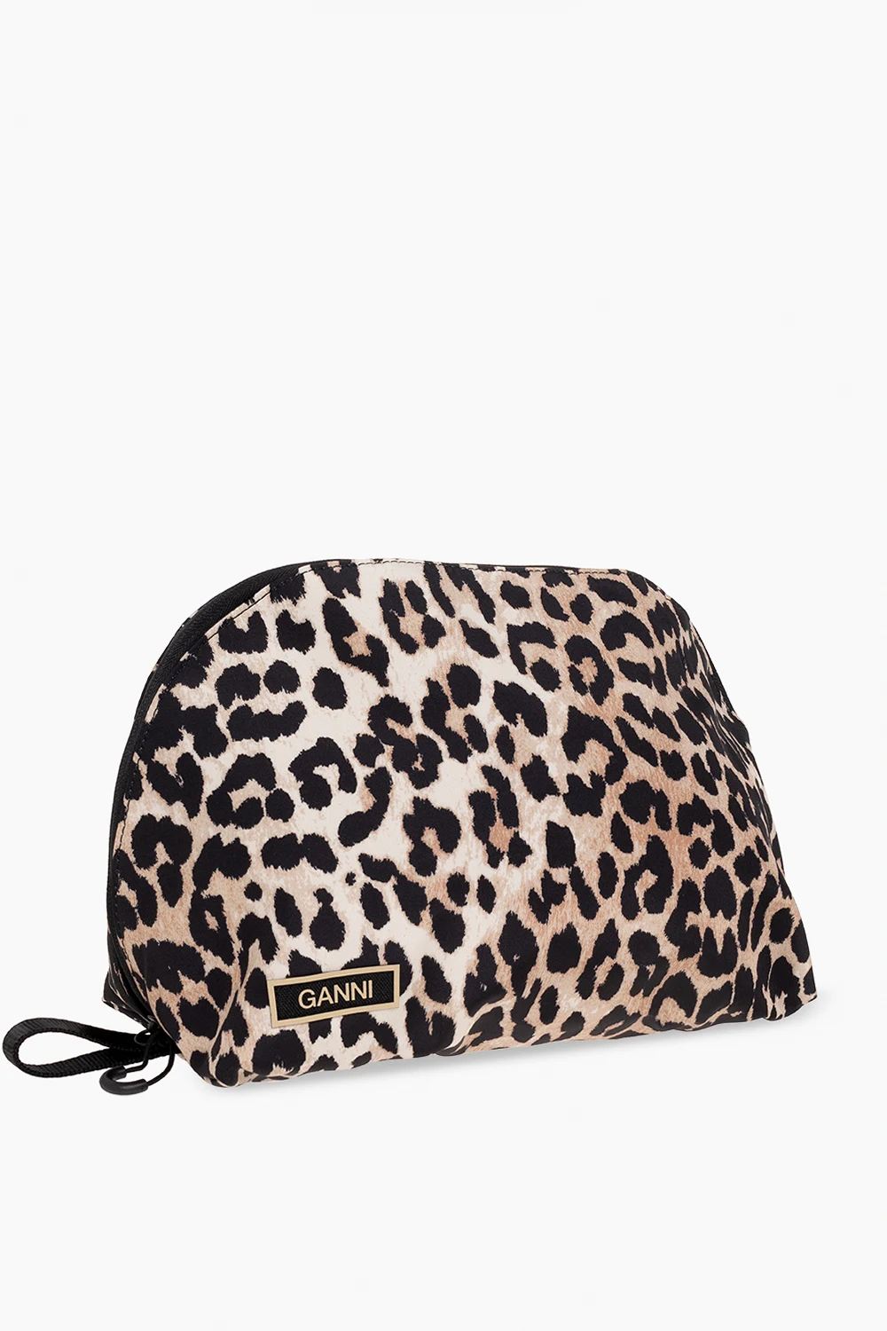 Beige and cream wash bag from Ganni. Crafted in part from recycled material, this design secures with a zipper and showcases an animal pattern, a logo patch and one internal compartment with one zip pocket.