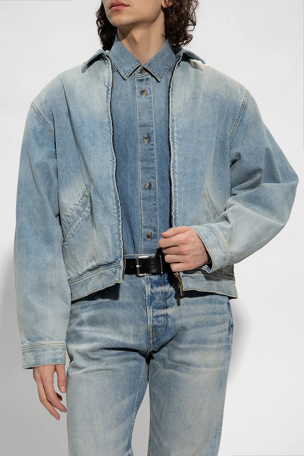 Light blue denim jacket from Fear Of God. Fastened with a two-way zip, this design features a two-way zip, two front pockets, logo patch at the back and long sleeves with buttoned cuffs.