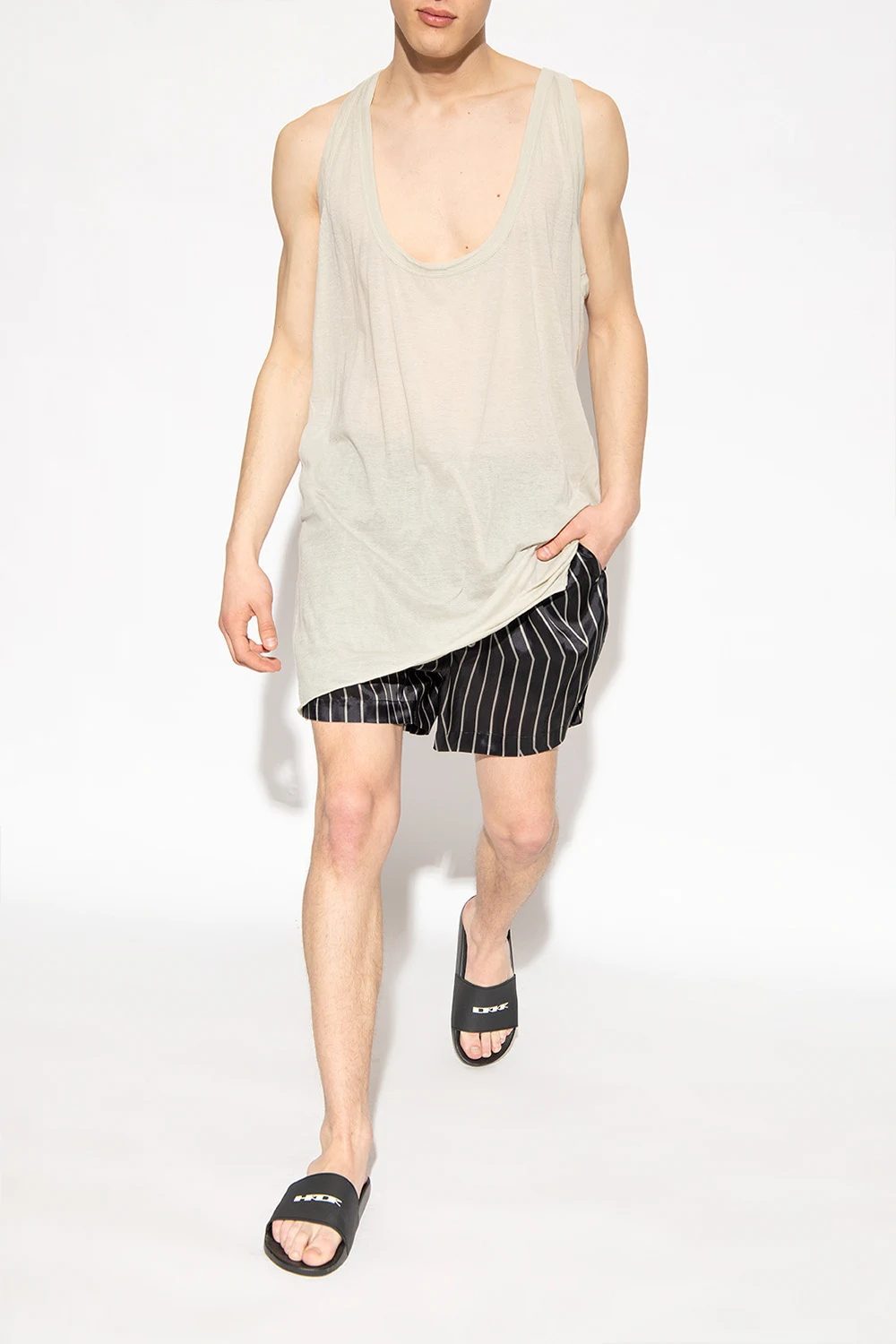 Black slides from Rick Owens DRKSHDW. Sitting on a black rubber sole, this model showcases cream logo lettering.