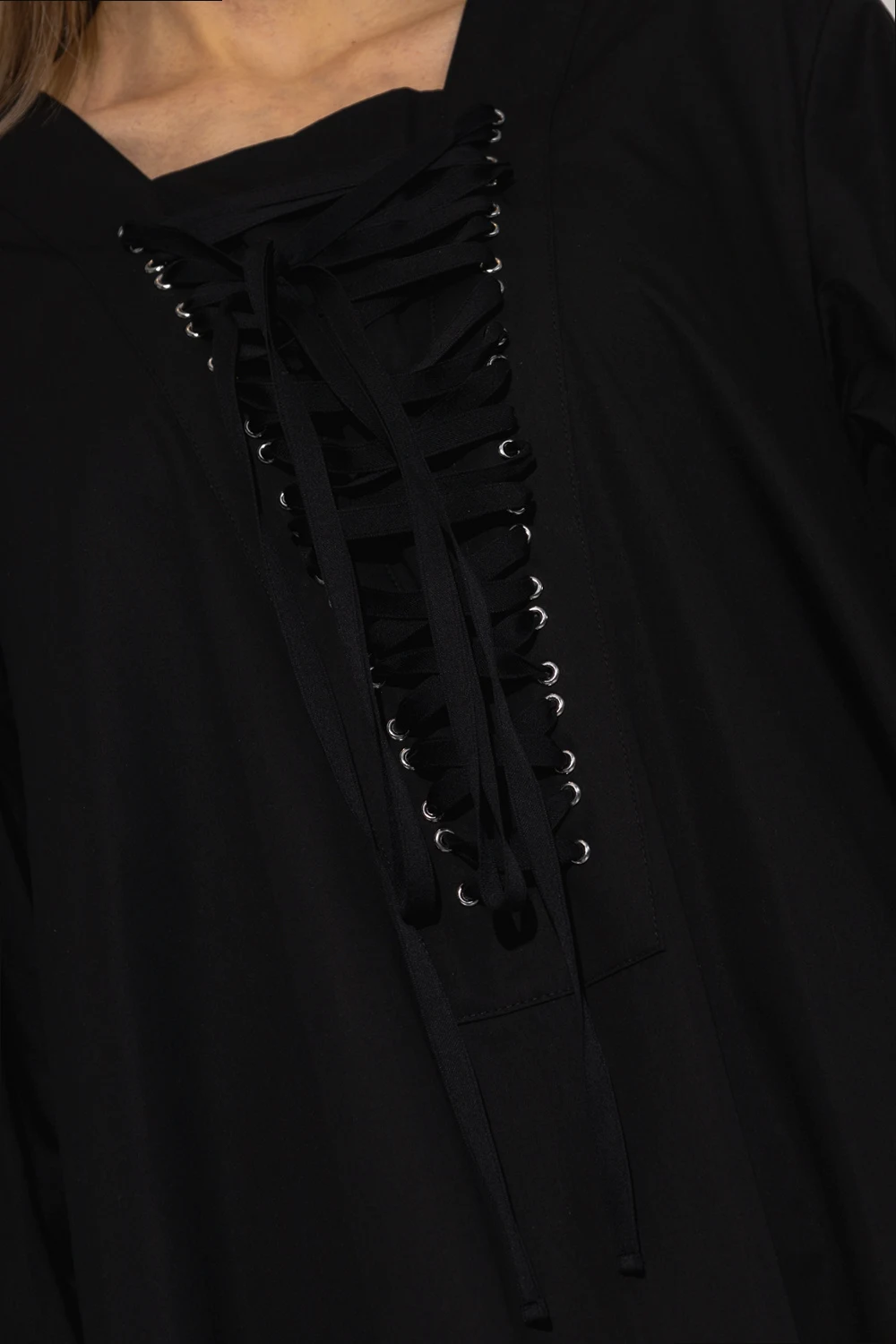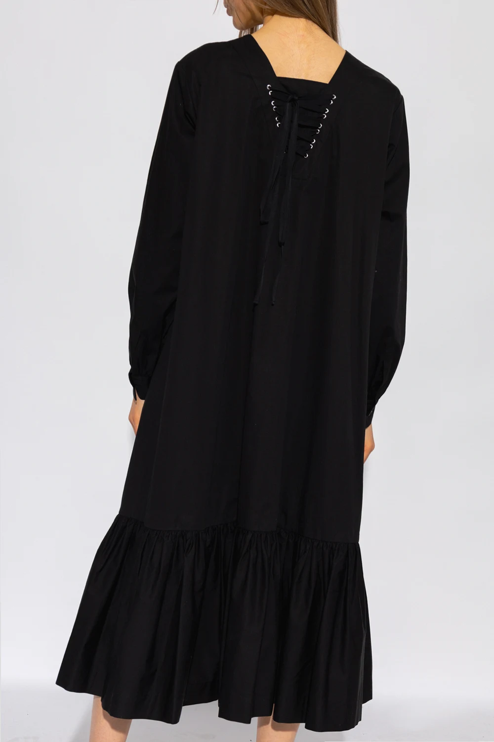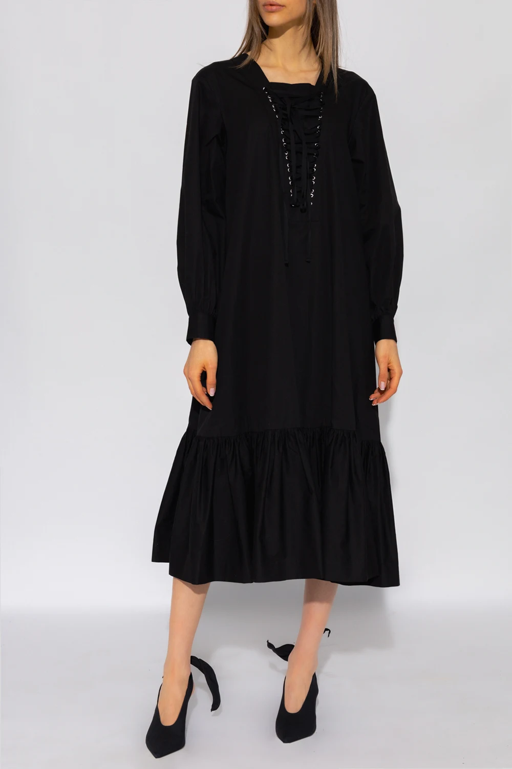 Black dress from Comme Des Garçons Ninomiya. Made of cotton with a relaxed-fitting silhouette, this style features a distinctive self-tie detail on the front and back, two slip pockets, a flared hem with ruffles and long puff sleeves with button cuffs.