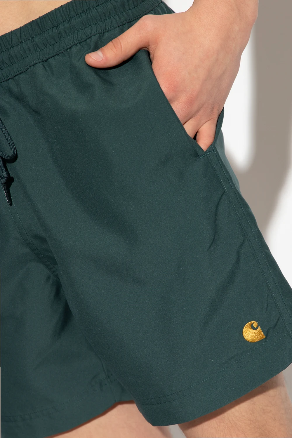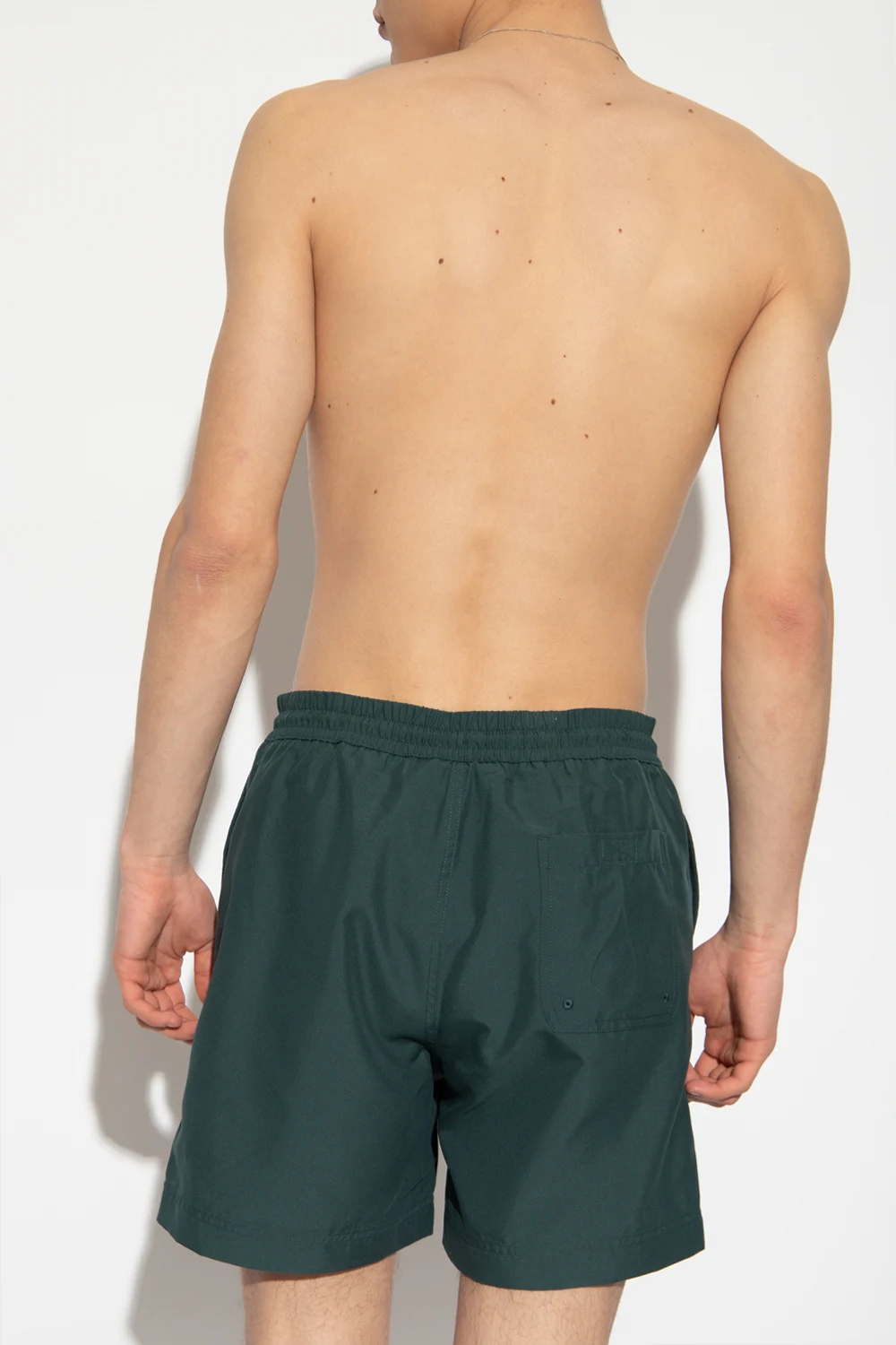 Green swim shorts from Carhartt WIP. This pair features an elastic drawstring waistband, yellow logo embroidery, two slip pockets and velcro pocket.