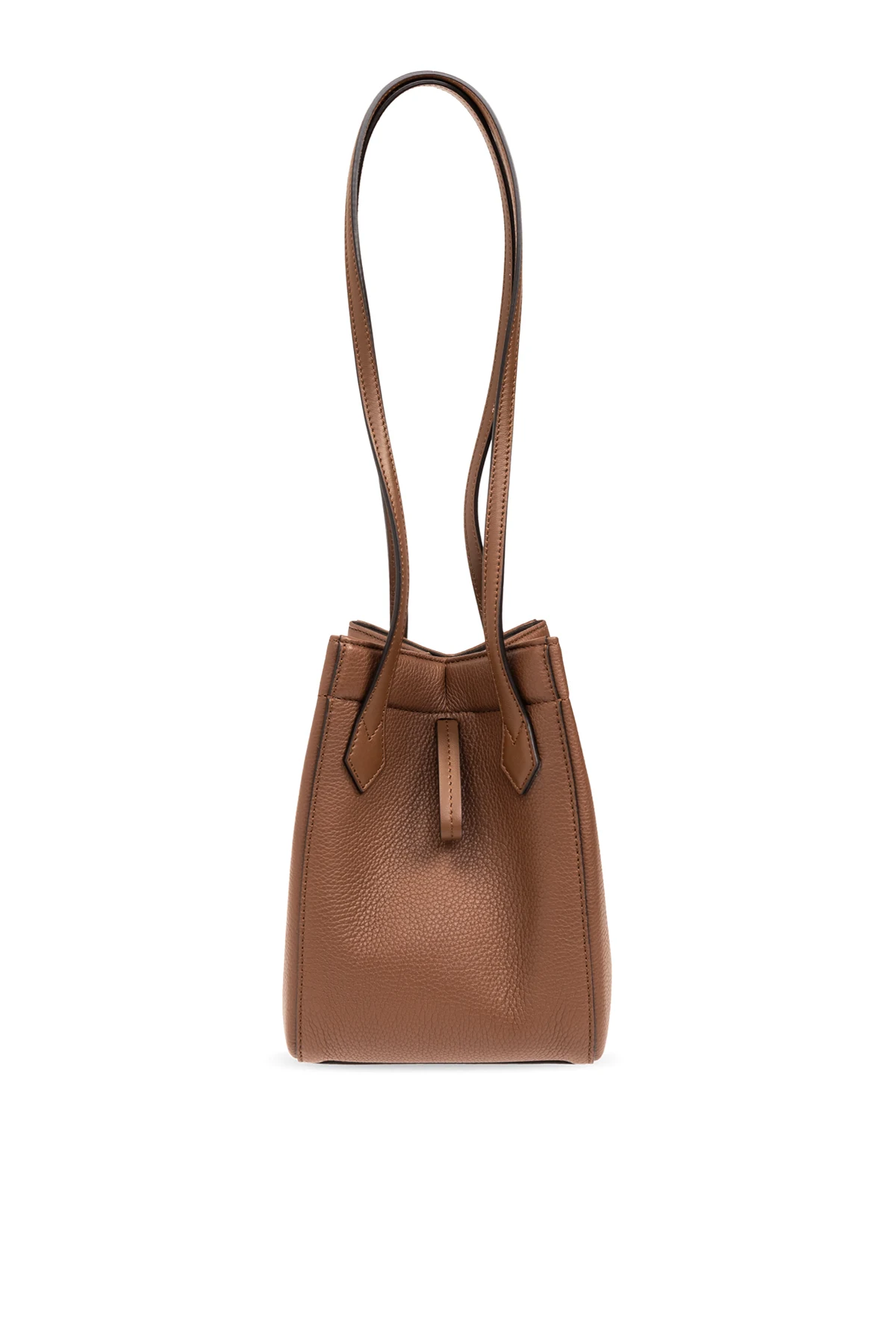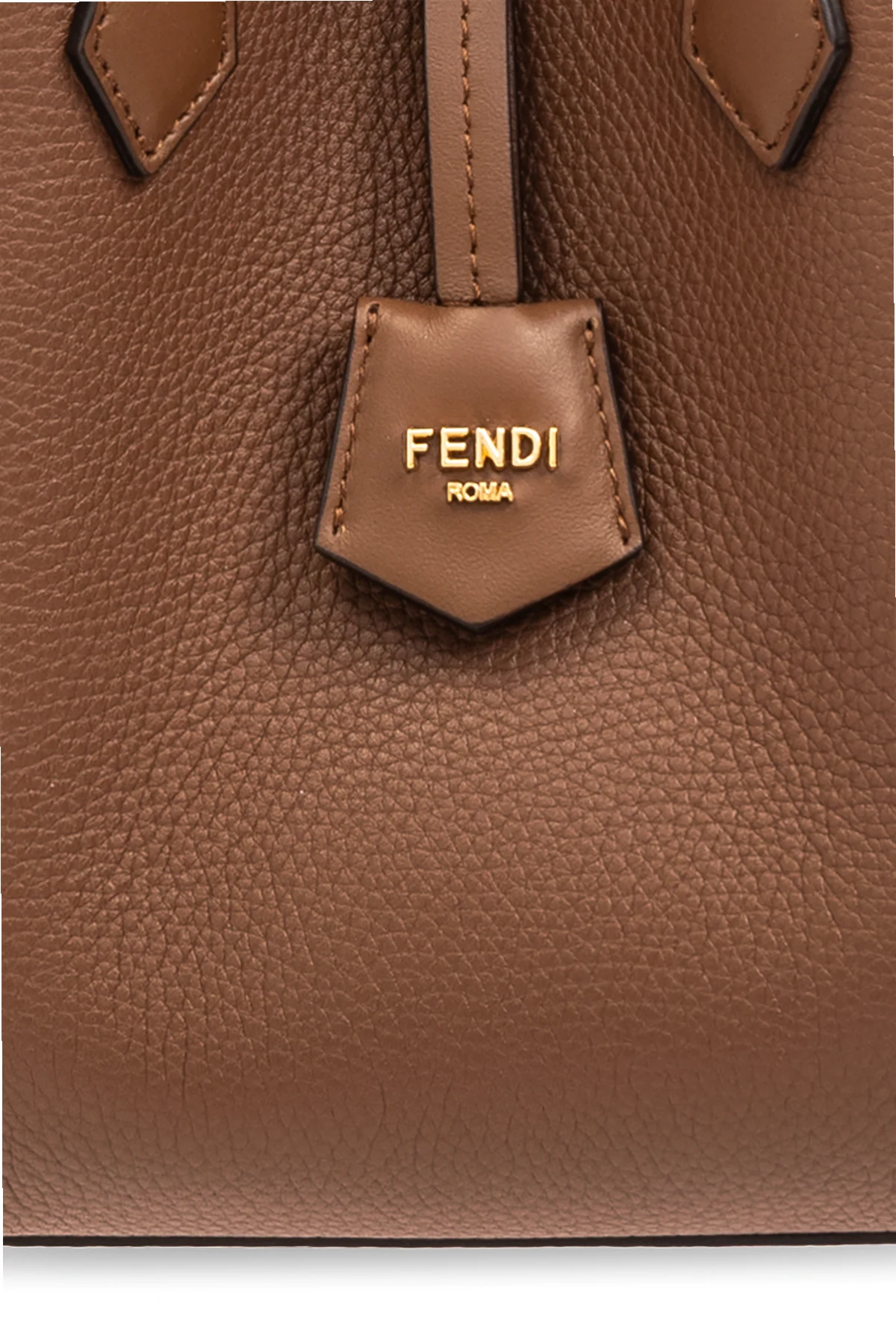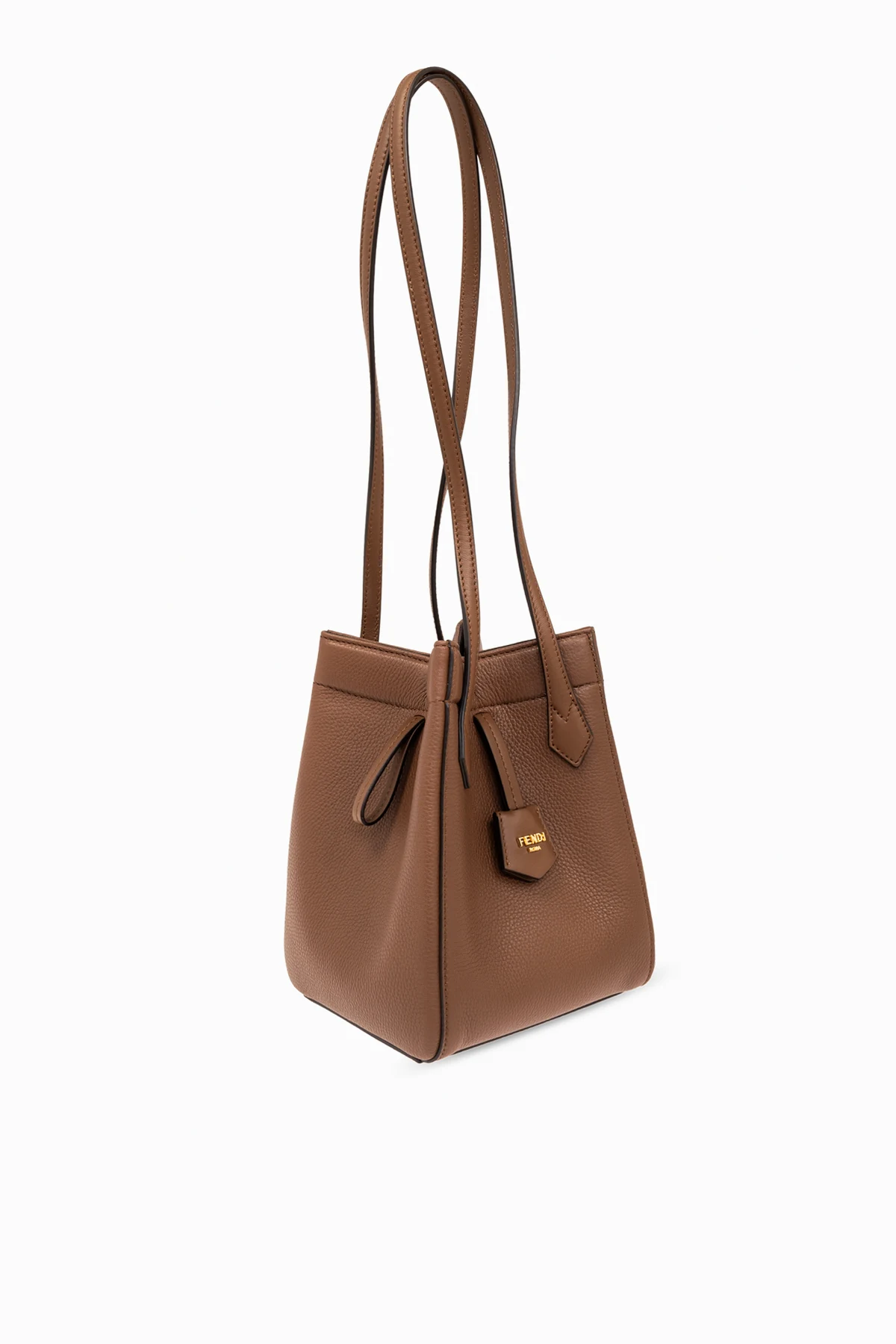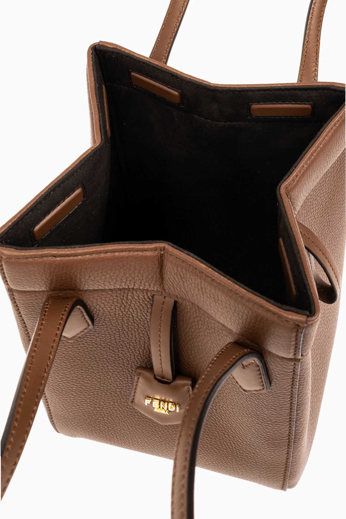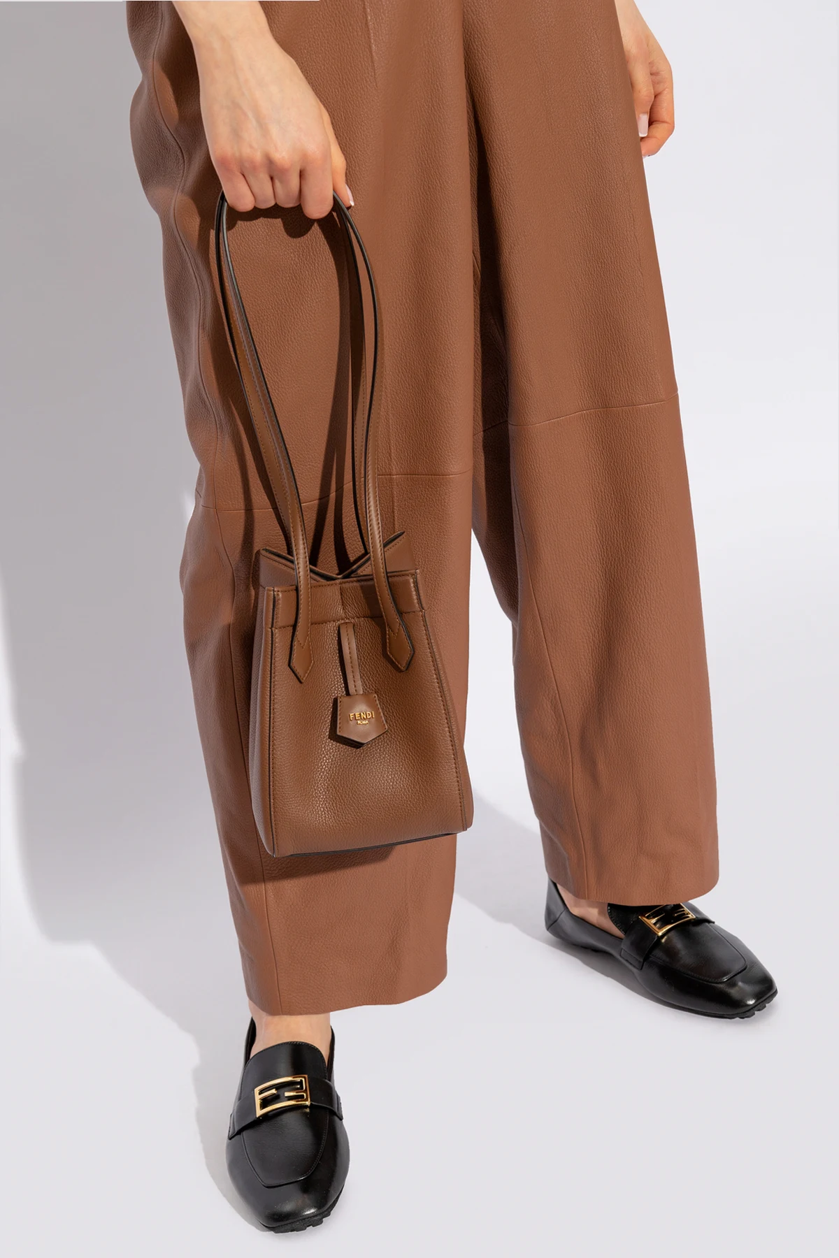 Aus Leder mit einer körnigen Textur gefertigt, präsentiert sich die ‘Origami Mini’ in einem edlen Braunton, der harmonisch mit den goldenen Metallelementen zusammenwirkt. Ein Detail in Form eines subtilen Fendi-Logos, geprägt auf einem quadratischen Etikett, verleiht dieser Tasche nicht nur Prestige, sondern auch Charakter. Der lange, schlanke Riemen sowie zusätzliche, dekorative Riemen mit rohen Kanten ermöglichen ein bequemes Tragen über der Schulter und betonen gleichzeitig ihr lockeres, luftiges Aussehen.