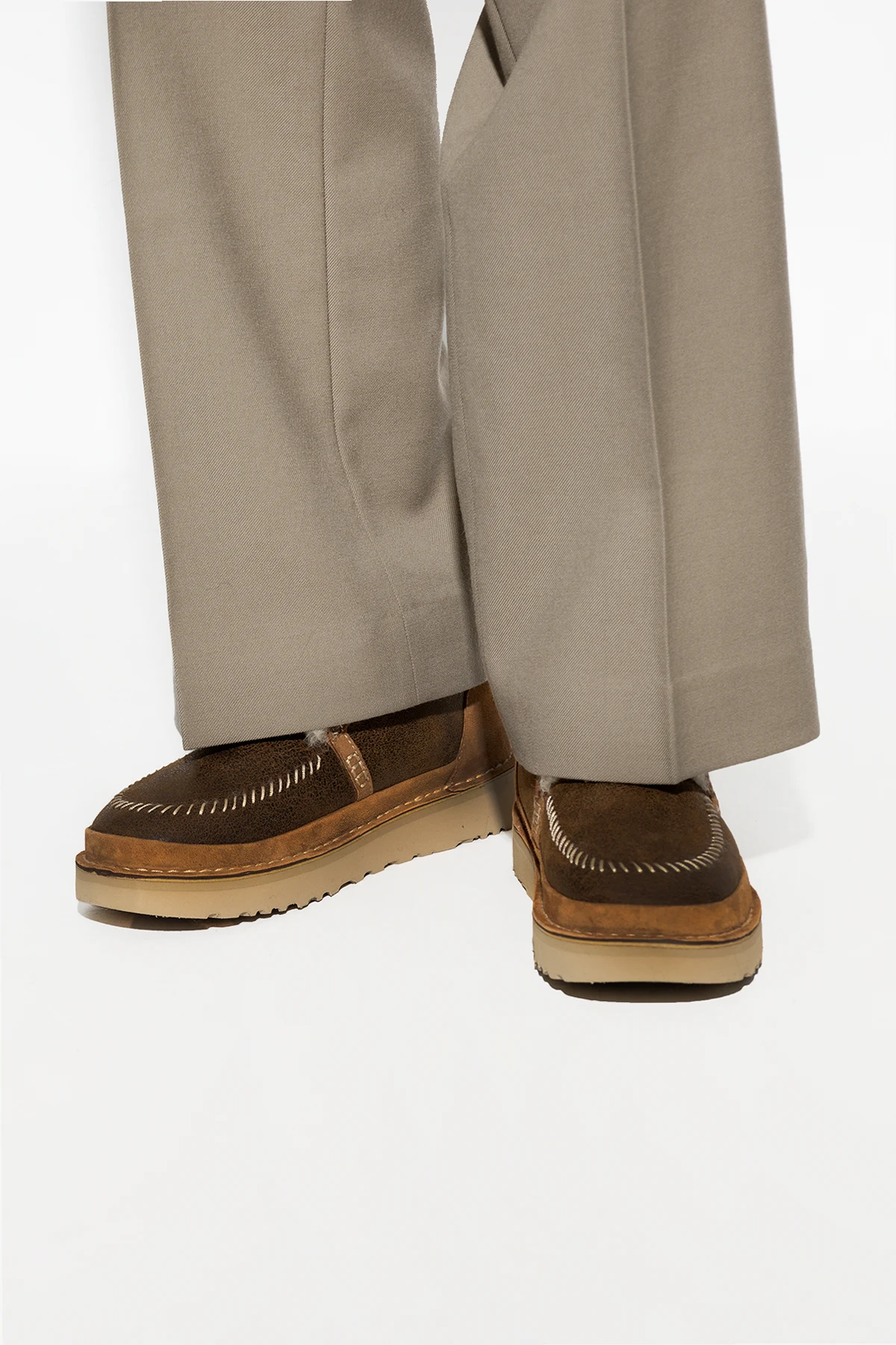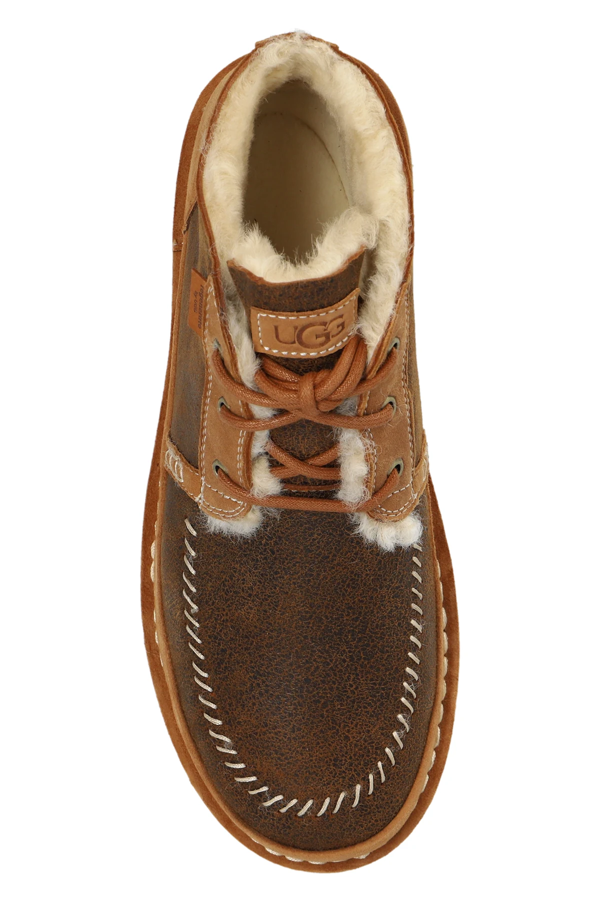 Brown and beige ‘Neumel Crafted Regenerate’ ankle snow boots from UGG. Made from leather with a cracked effect, this model showcases a logo-embossed patch on the back, exposed cream stitching and inner insulation made from a combination of high-quality wool and fine lyocell fibre. The brown foam outsole sourced from sugar cane reduces dependence on fossil fuels by replacing conventional petroleum-based materials commonly used in footwear with a renewable, biotechnology-based alternative. Sugar cane is a fast-growing, rainwater-dependent resource that captures CO2 from the atmosphere and sequesters carbon, and requires no irrigation.