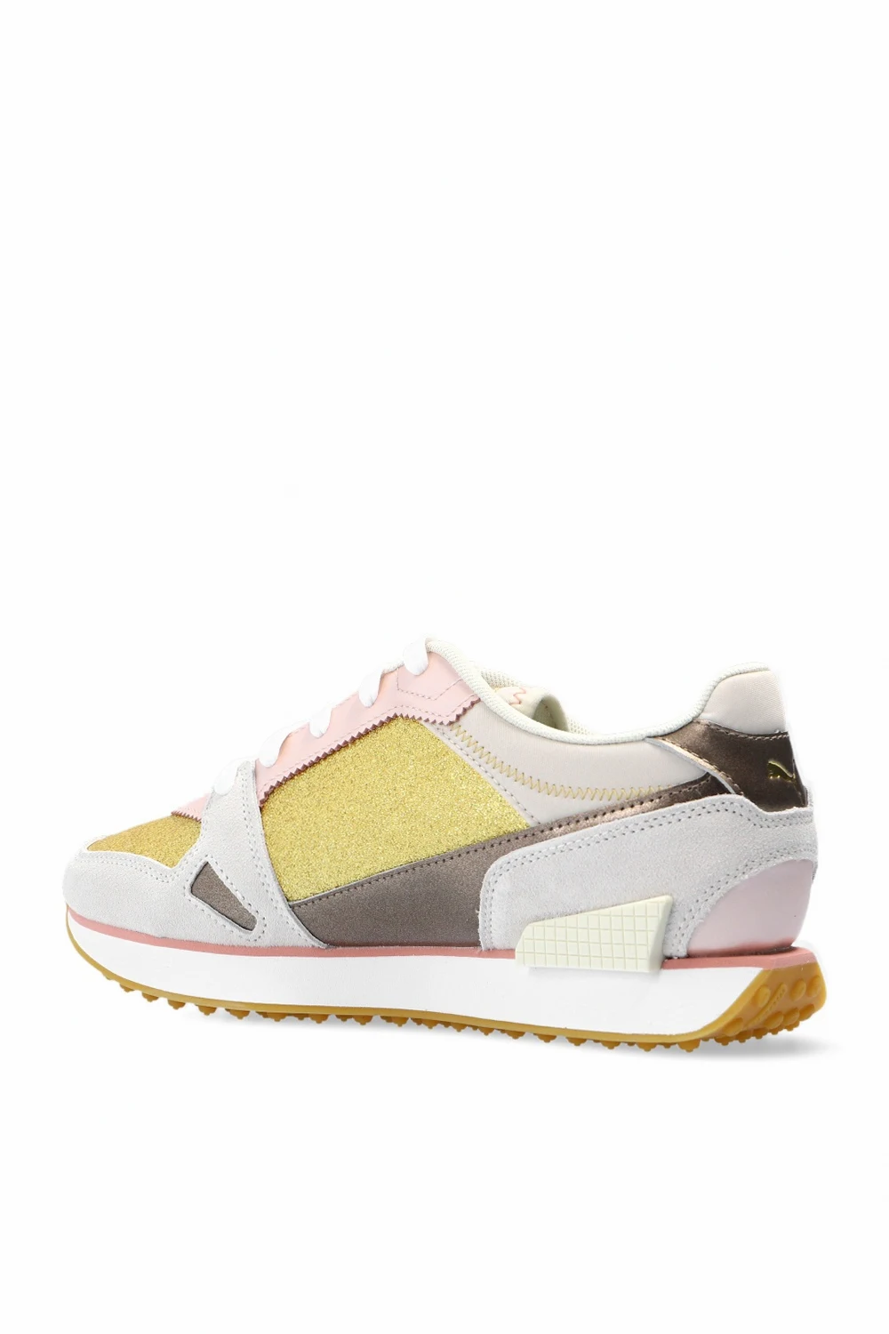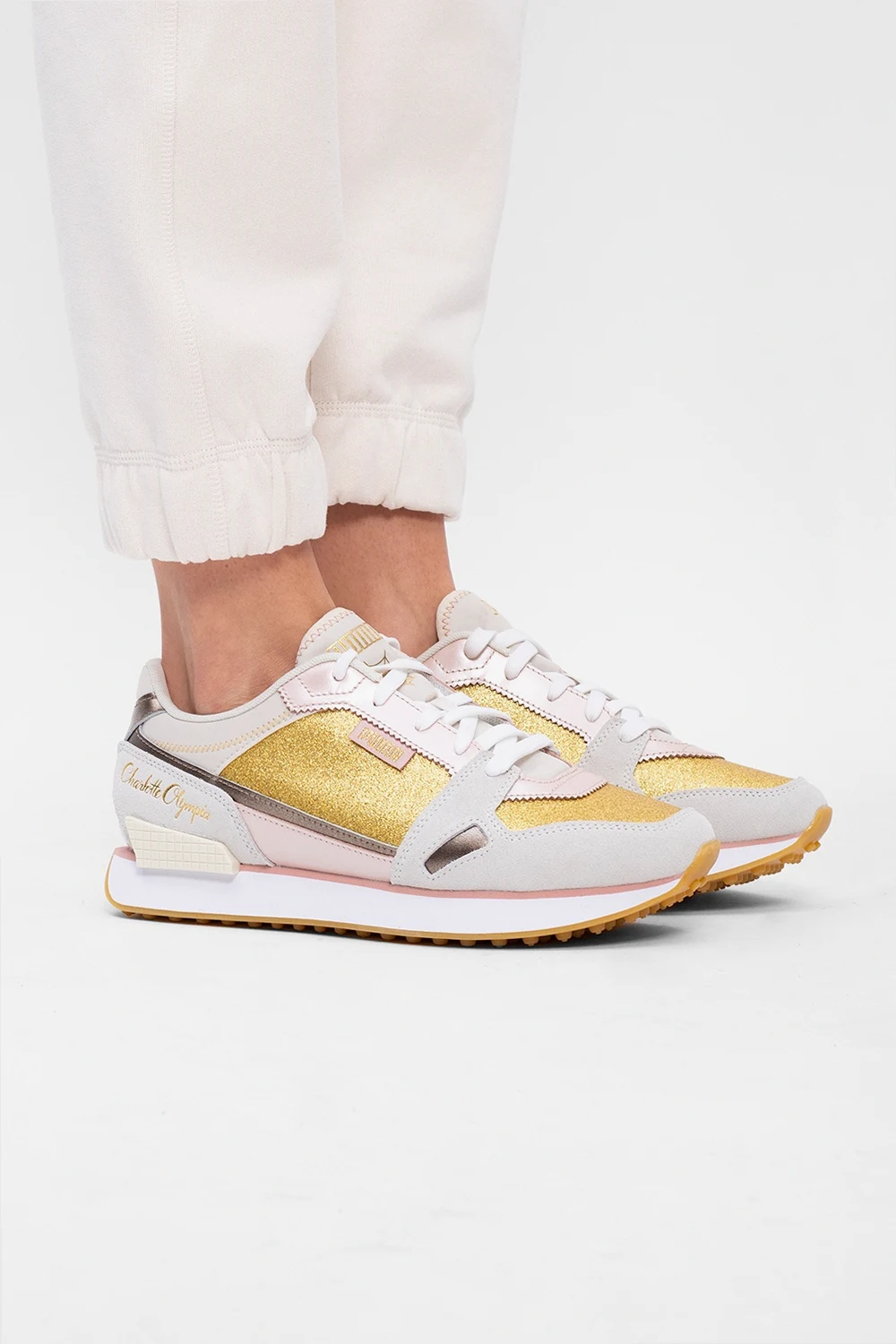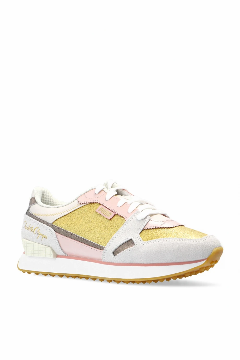 Cream, pink and gold-tone ‘Mile Rider’ sneakers from Puma x Charlotte Olympia. Trimmed with glitter, this lace-up model features a gold-tone logo and grosgrain strap at the back as well as a rubber sole in white and beige.