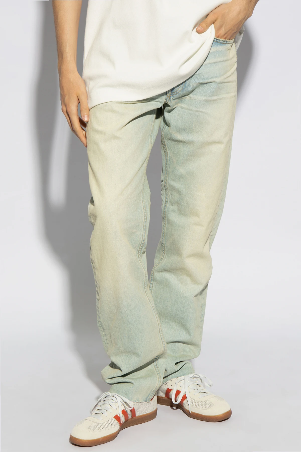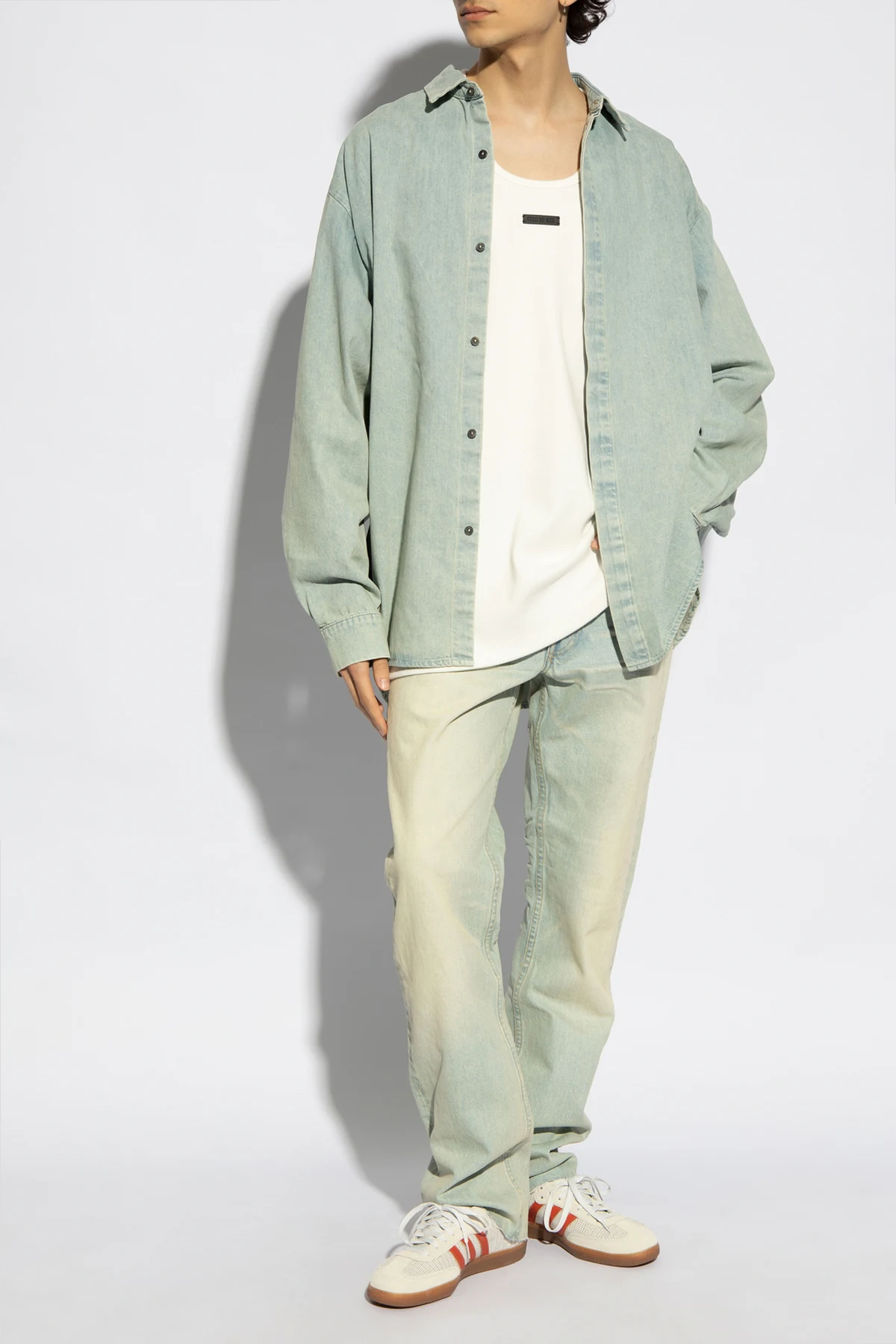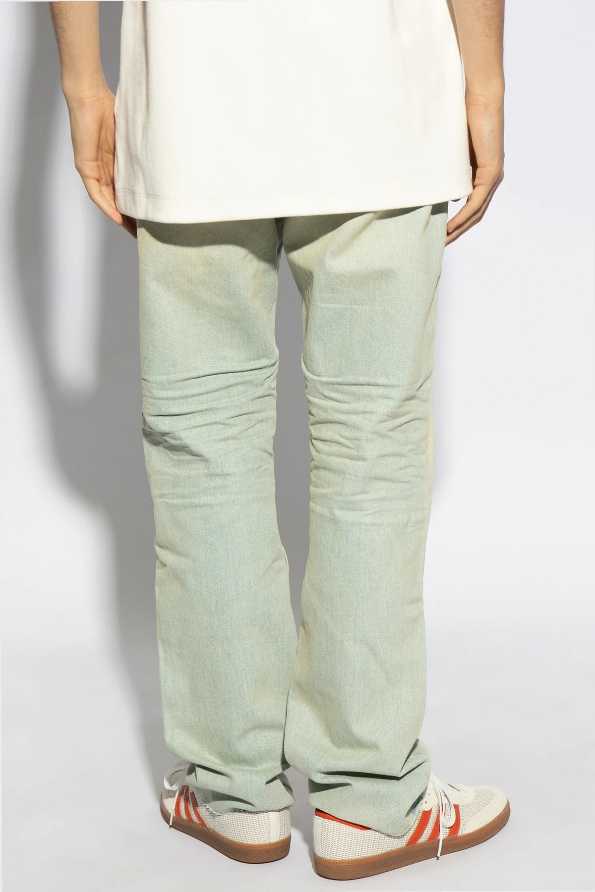 Die unbestreitbare Quintessenz klassischer Eleganz sind Straight-Leg-Jeans von der renommierten Marke Fear Of God . Diese Hose, gefertigt aus hochwertiger 100% Baumwolle , vereint Langlebigkeit und Tragekomfort und verkörpert gleichzeitig einen unabhängigen Stil. Die dominierende hellblaue Farbe, veredelt durch eine subtile Patina aus Abnutzungen und Ausbleichungen, verleiht ihnen einen charakteristischen Vintage-Look, der Blicke auf sich zieht und die Individualität unterstreicht.
