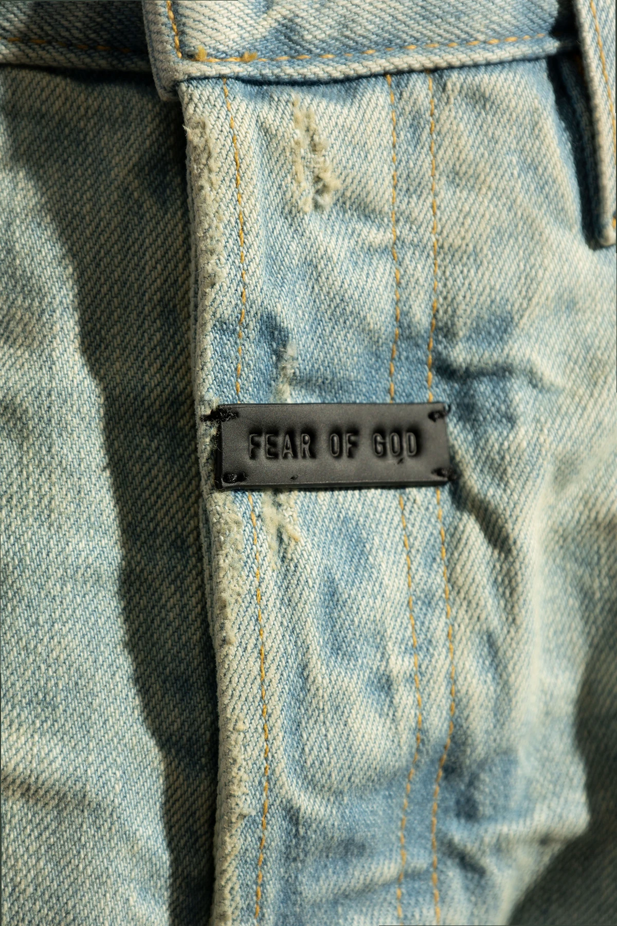 Klassische Elemente wie Nähte, Einschubtaschen und Gürtelschlaufen werden durch das charakteristische, dunkle Label mit dem weißen Schriftzug "FEAR OF GOD" auf einer der vorderen Taschen vervollständigt. Dies ist nicht nur ein Erkennungszeichen der Marke, sondern auch ein Beweis für Exklusivität und Zugehörigkeit zur Welt der High Fashion. Die geradlinigen Beine und der Knopfverschluss bieten Komfort und Funktionalität, was diese Jeans zur perfekten Wahl für jede Gelegenheit macht.