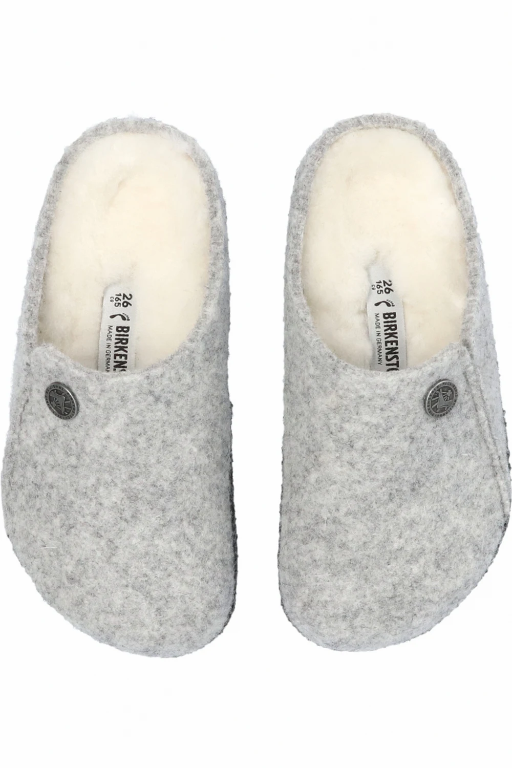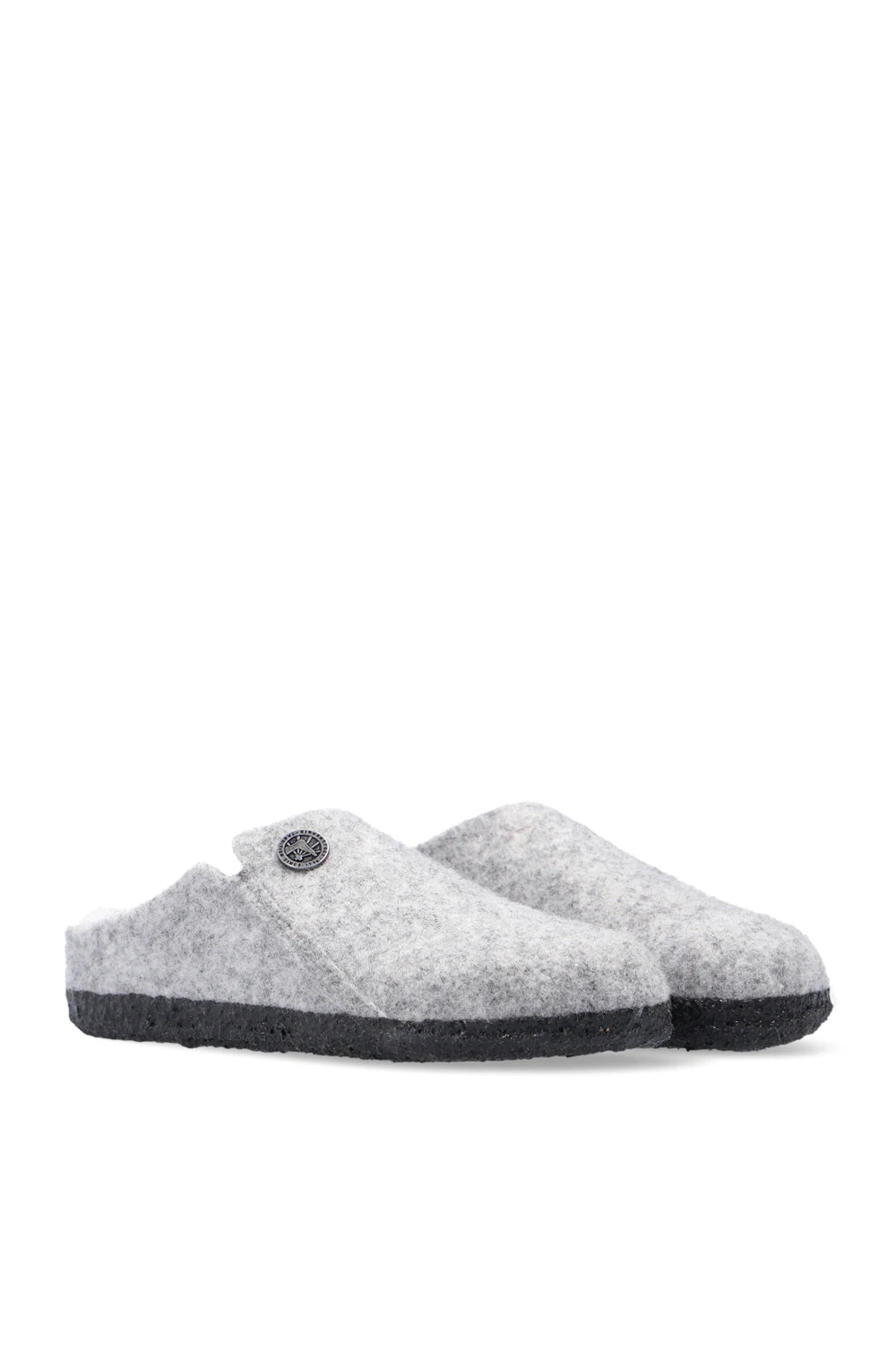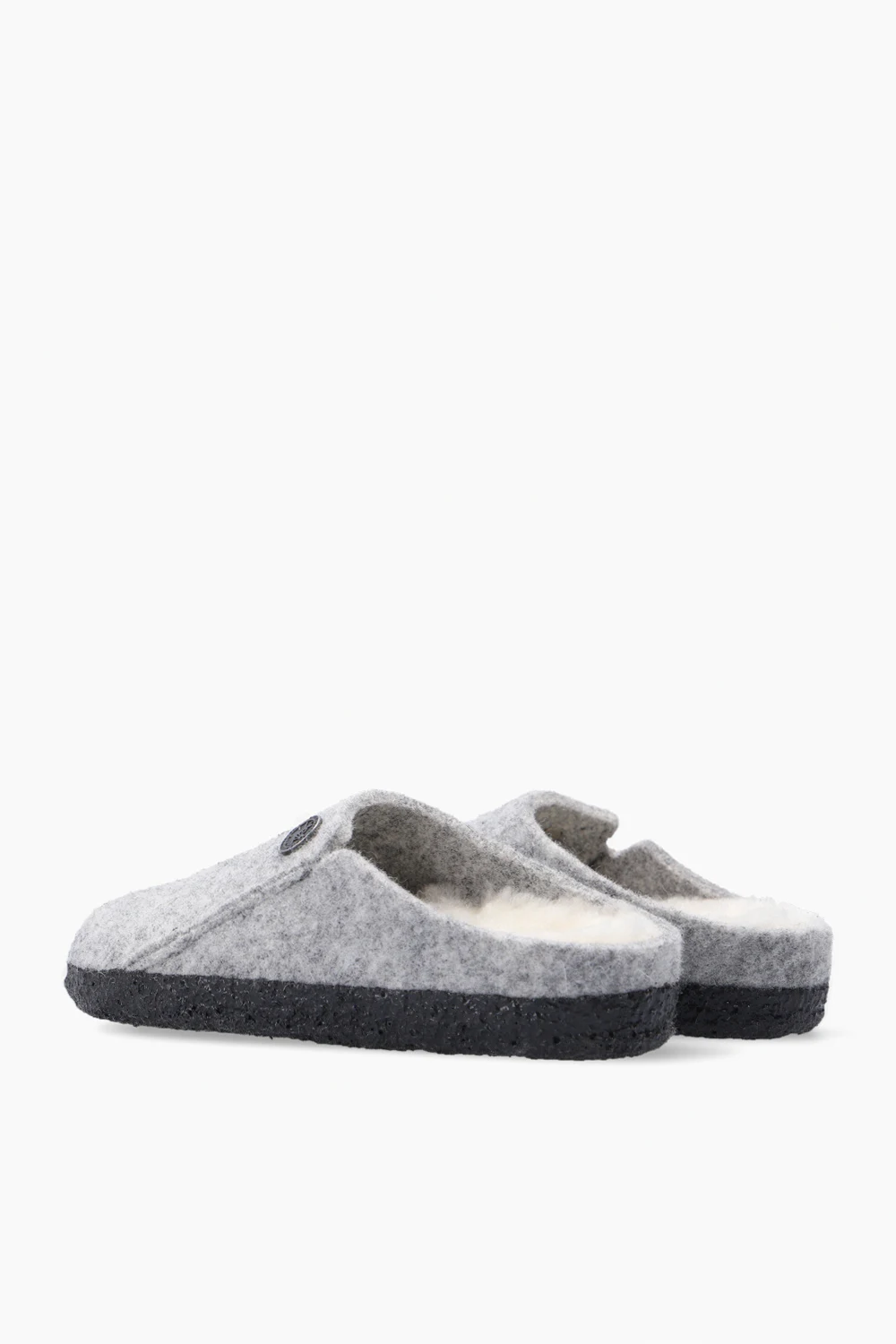 Light grey ‘Zermatt Rivet’ slides from Birkenstock Kids. Made from felt, this pair features a logo embroidery, metal appliqué in silver-tone, fur lining and dark grey sole made from light cork coated with latex.
