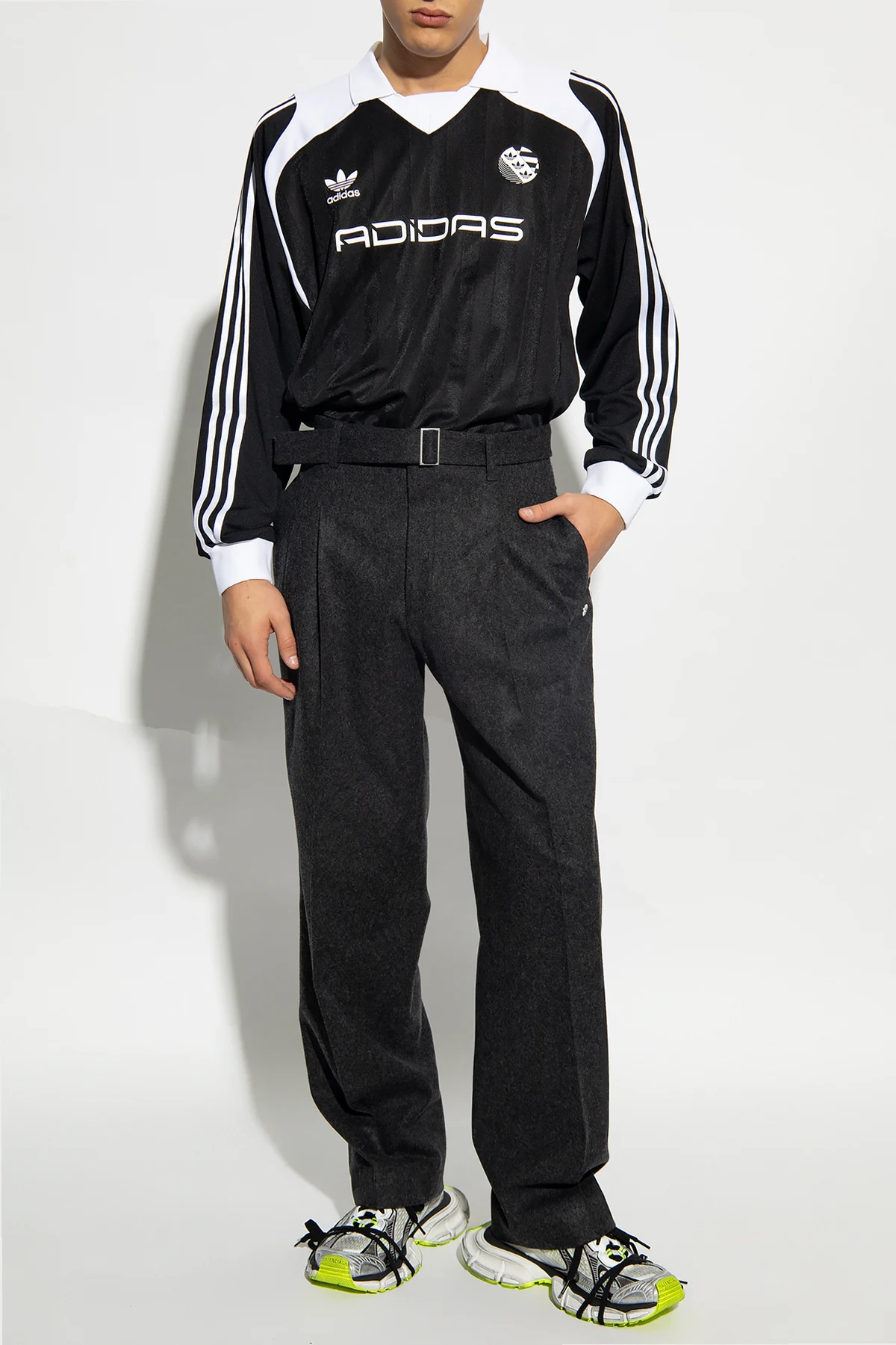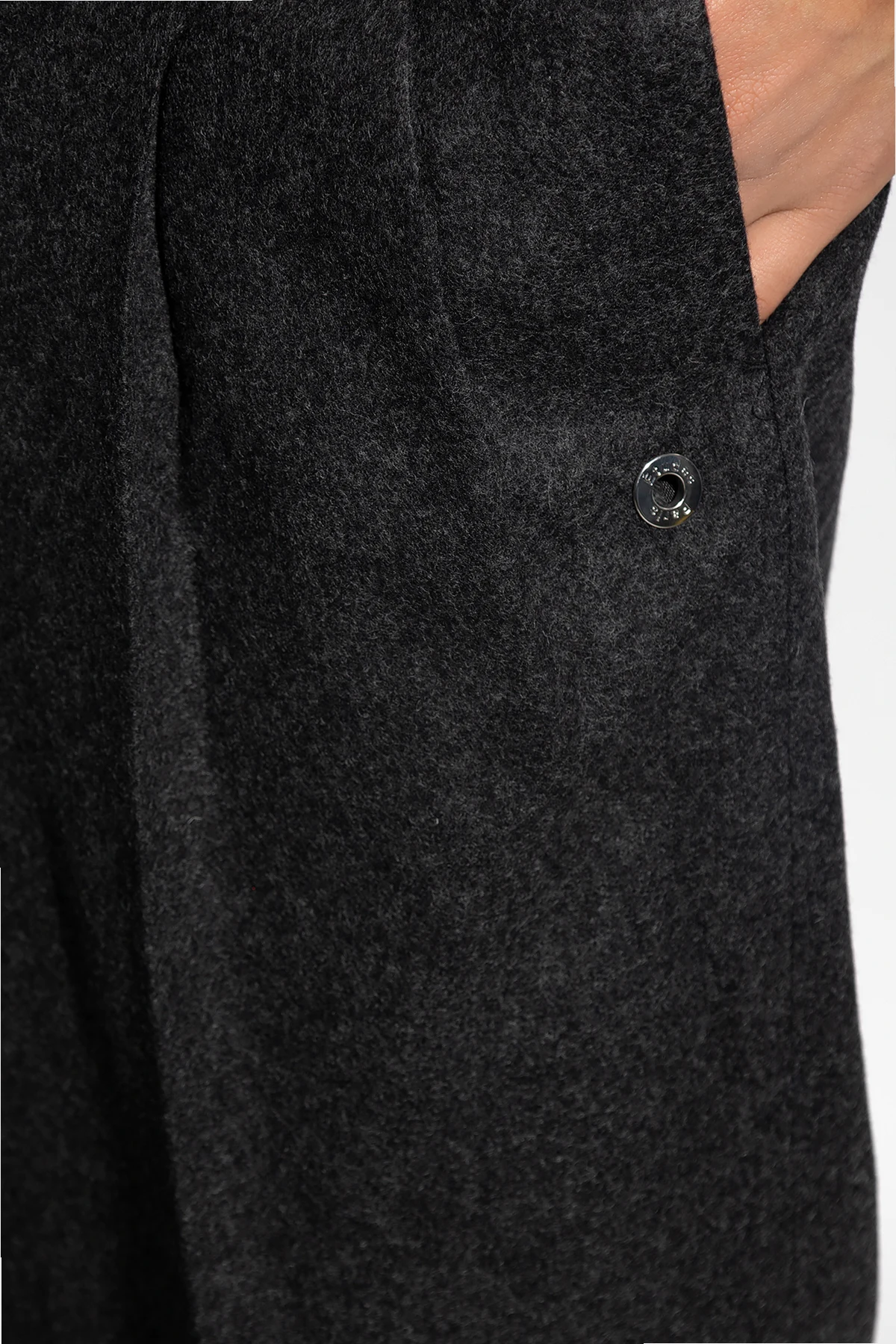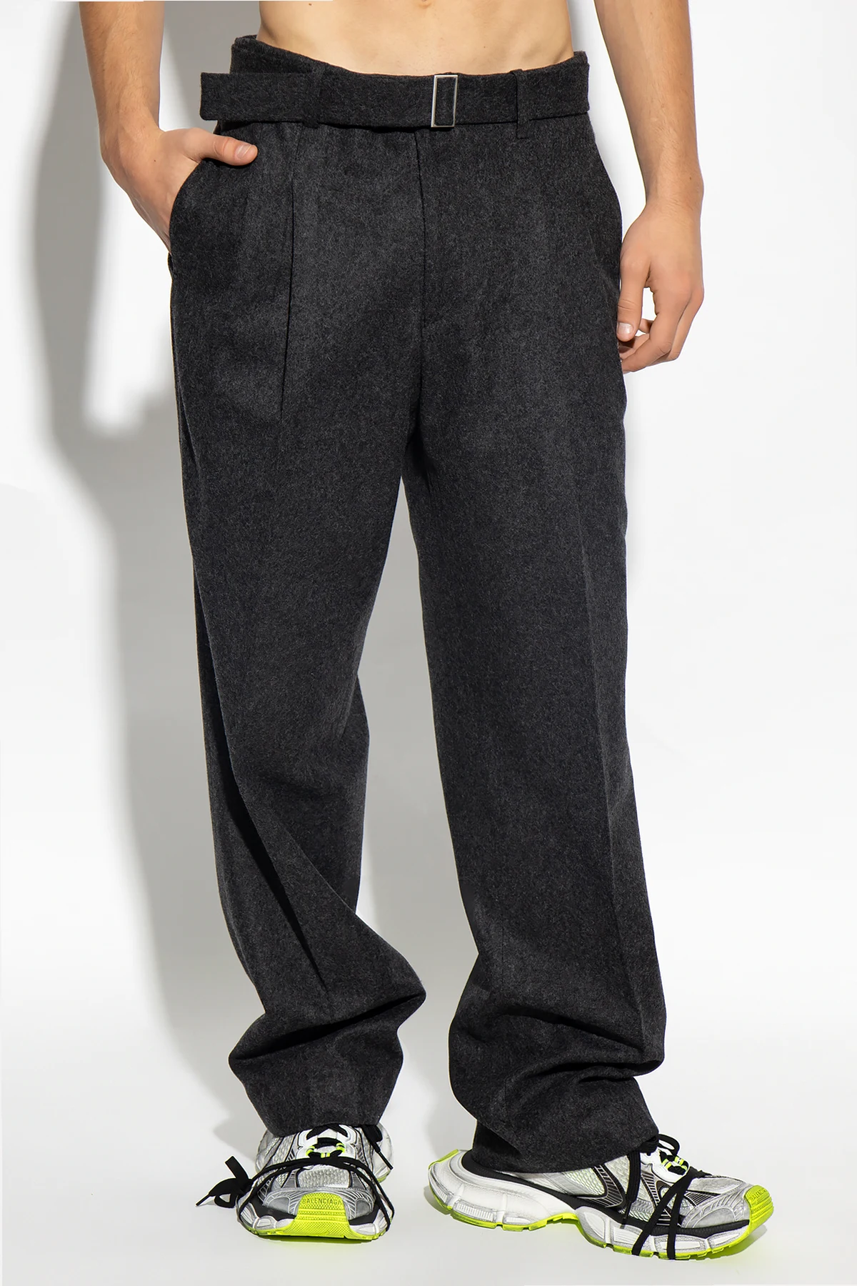 Dark grey trousers from Etudes. Made of wool, this pair falls with straight legs and features a zip fly with a hook, a buckle belt, front pleats, a silver-tone plaque with an engraved logo as well as three pockets: two on the front and one at the back.