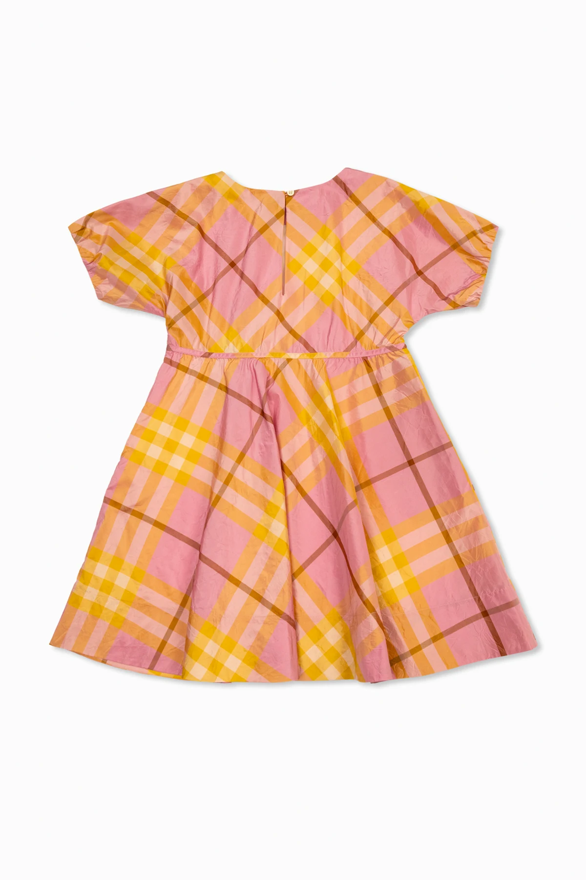 Wir präsentieren Ihnen ein Kleid im Karomuster von Burberry Kids , das zeitlose Eleganz mit einem Hauch kindlicher Freiheit verbindet. Dieses einzigartige Design zeichnet sich durch eine rosa Farbe mit einem großen, gelben Karomuster aus, was jeder Styling-Kombination einen charmanten Akzent verleiht. Gefertigt aus hochwertigem 100% Seide mit einer Innenlage aus 100% Polyester , bietet es nicht nur einen raffinierten Look, sondern auch Tragekomfort. Die zart gerafften kurzen Ärmel und die taillierte Passform verleihen dem Kleid eine leicht figurbetonte Form, die die weibliche Silhouette hervorhebt.
