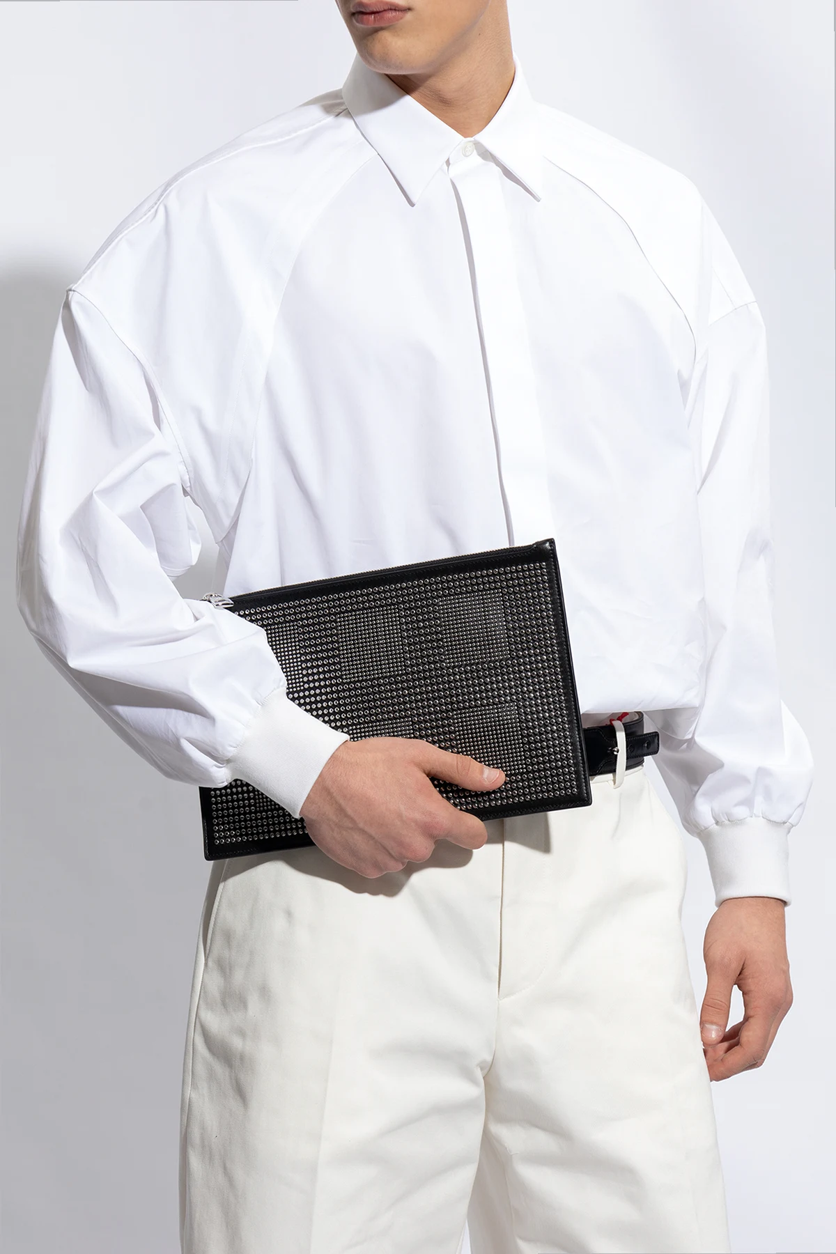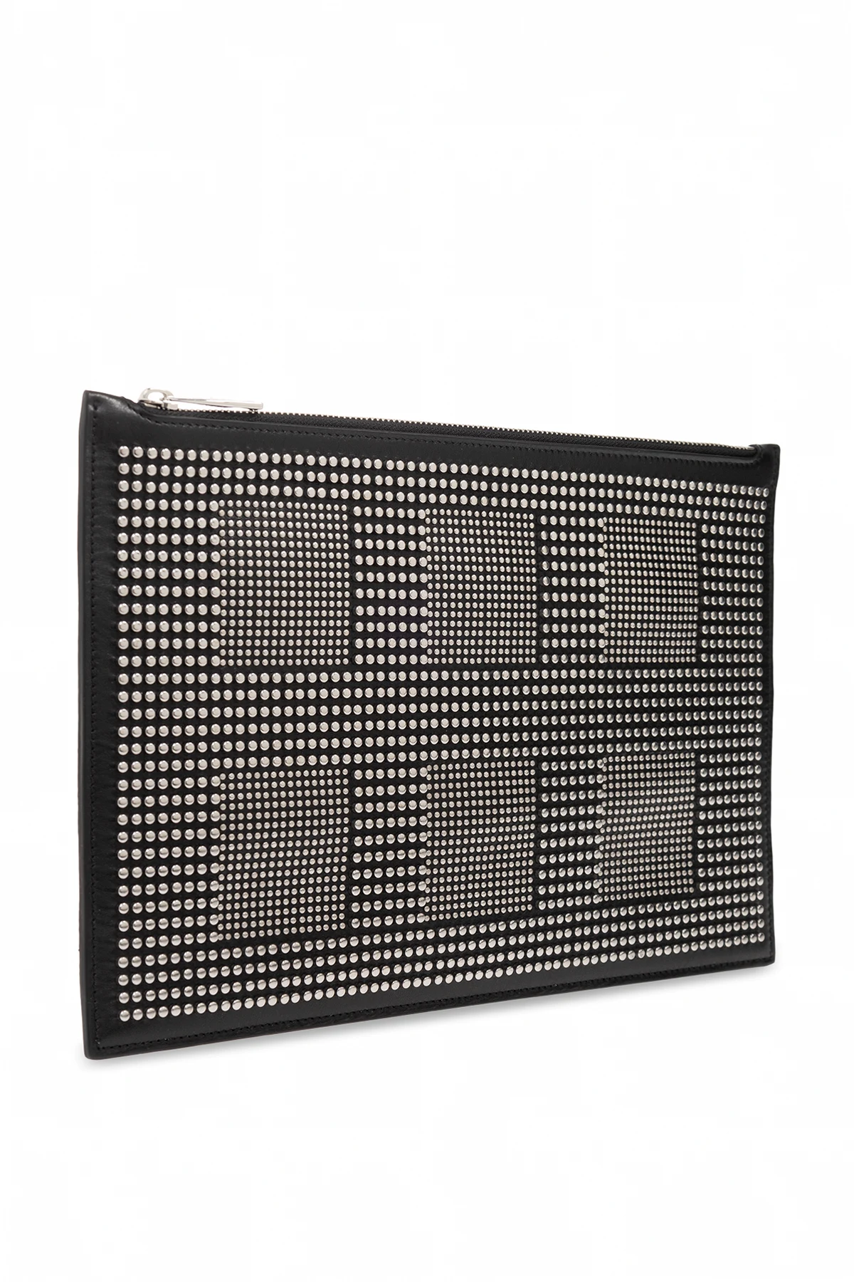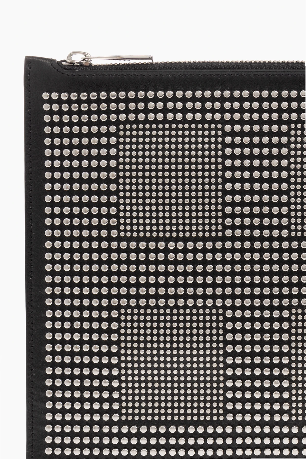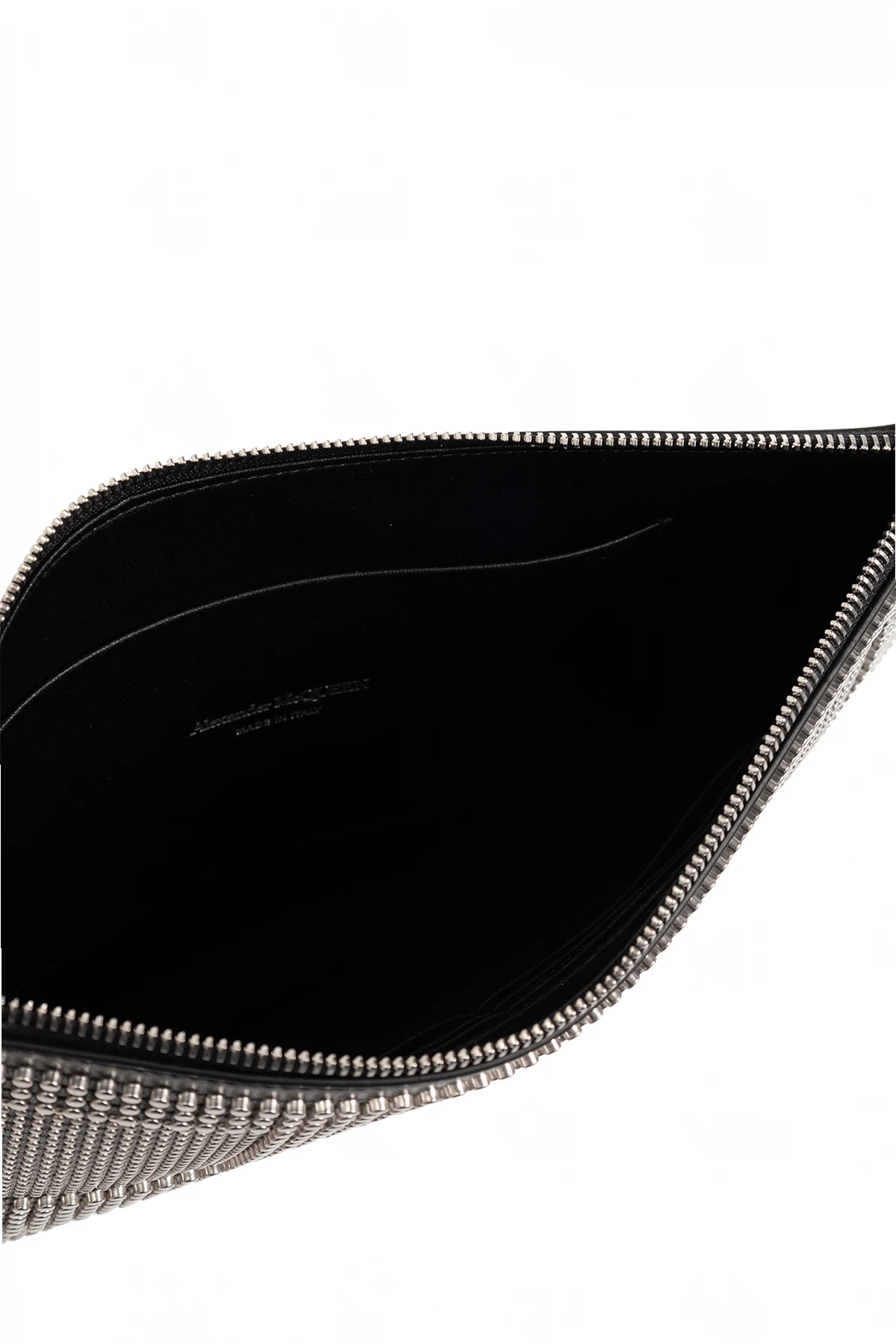 Black handbag from Alexander McQueen. Made of calf leather and decorated with studs, this item features a zip fastening, silver-tone metal hardware and one internal compartment with one slip pocket and eight card slots.