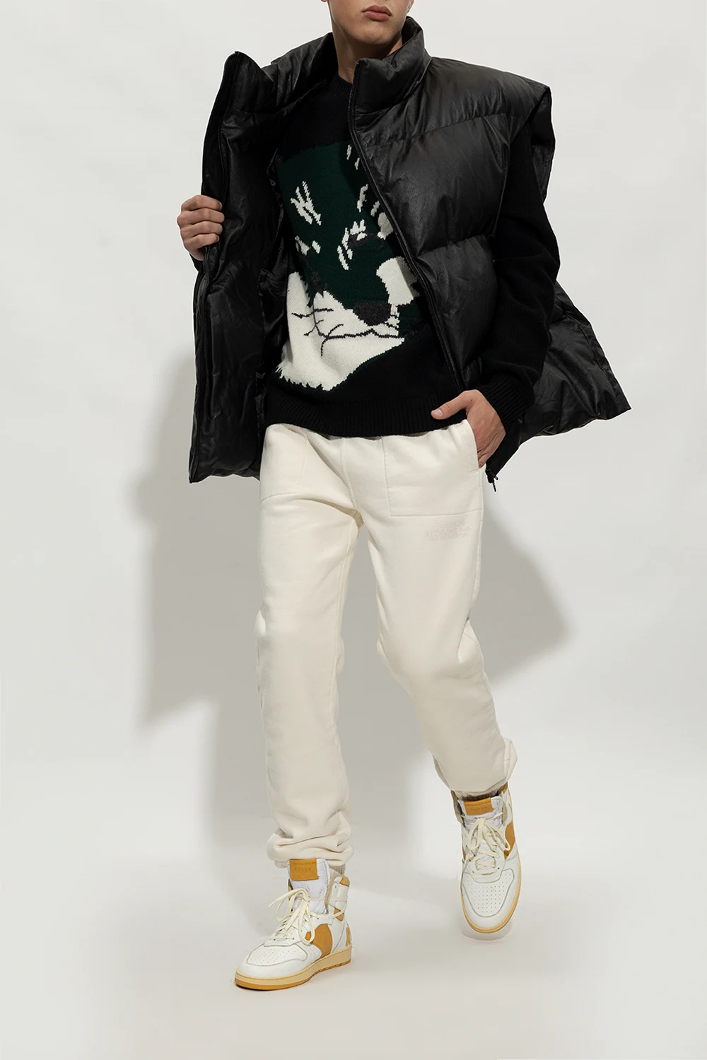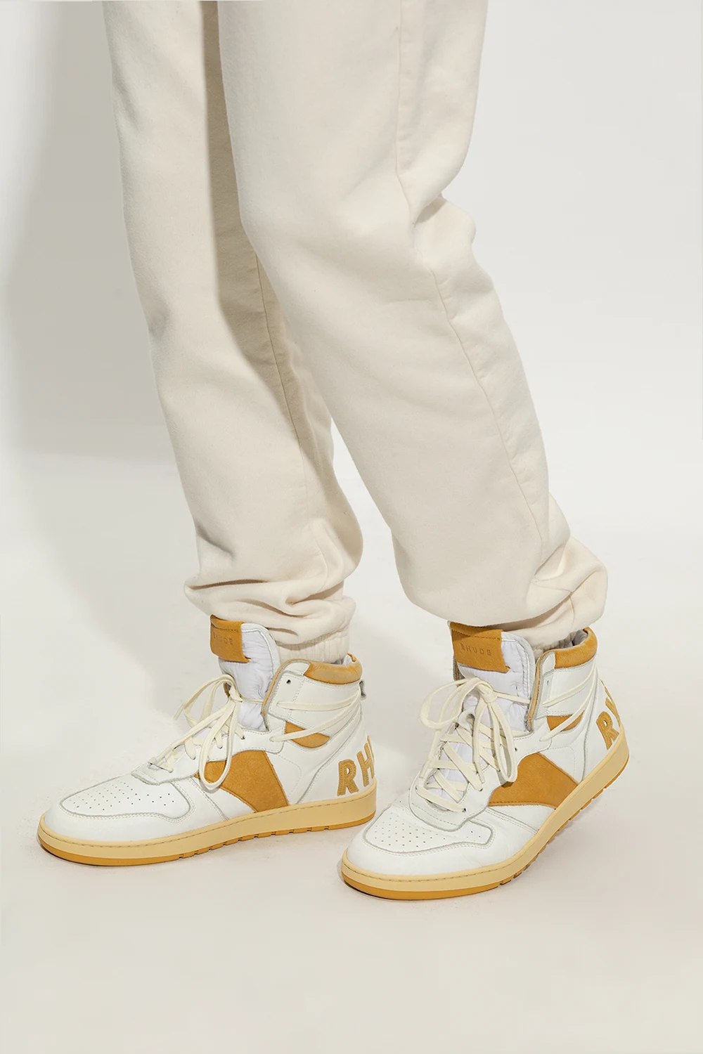 White and dark yellow ‘Rhecess High’ high-top sneakers from Rhude. Made of leather, this lace-up pair features a tongue patch with a logo, perforations, logo patches at the back, vintage effect and rubber sole in yellow and cream.