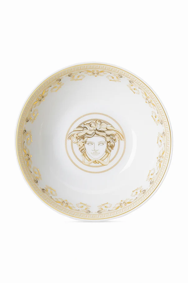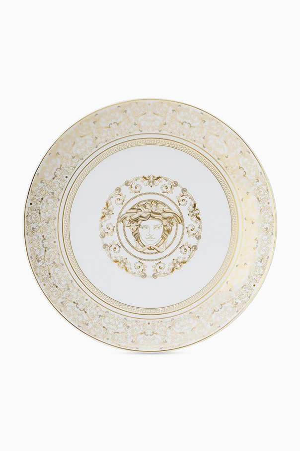 Der Teller ist ein wahres Kunstwerk, auf dem sich auf einem schneeweißen Hintergrund ein goldenes Muster mit dem für Versace typischen Medusenkopf abhebt. Feine goldene Ornamente an den Rändern verleihen ihm majestätischen Charme.