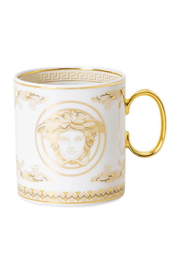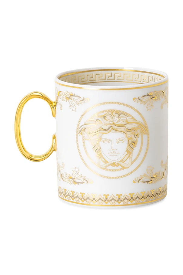 Die Tasse hingegen, mit einem weißen Körper, der durch goldene Muster, einschließlich des Medusenkopfes, veredelt ist, verfügt über goldene Verzierungen am Griff, die ihr eine unvergleichliche Eleganz verleihen.