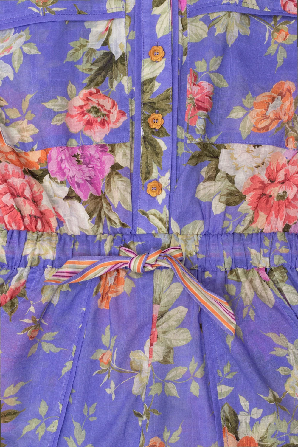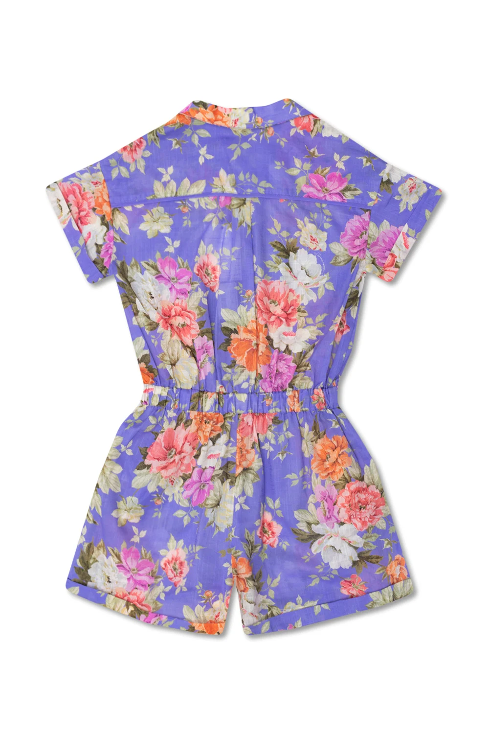 Purple jumpsuit from Zimmermann Kids. Made of cotton, this style fastens via decorative flower-shaped buttons and showcases a colourful floral pattern. It is complete with a drawstring waistband, a classic collar, two slip pockets, short sleeves with rolled-up cuffs and short legs.
