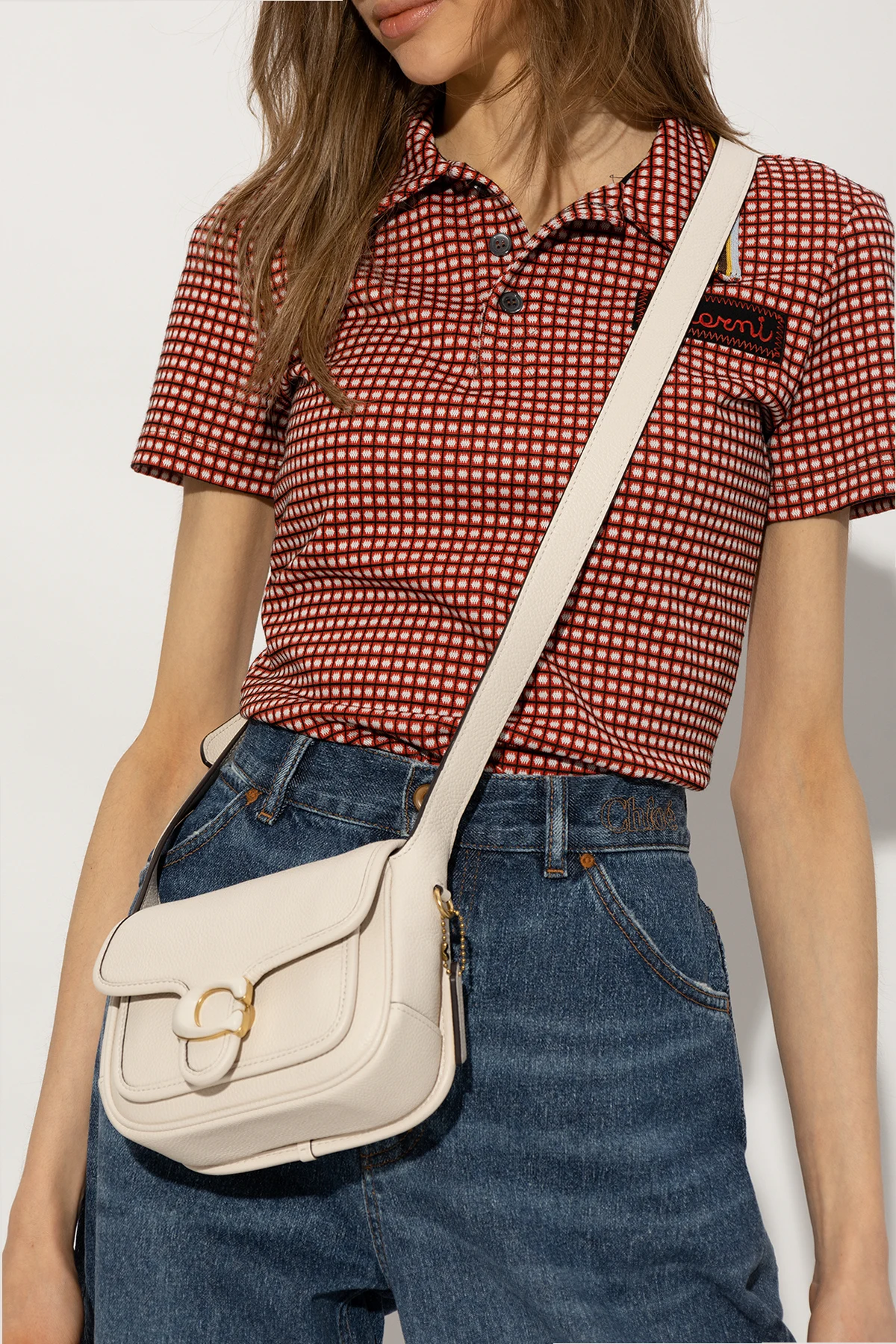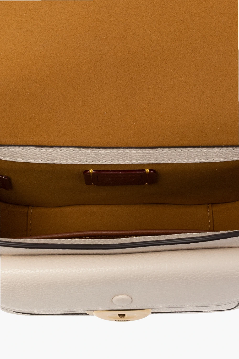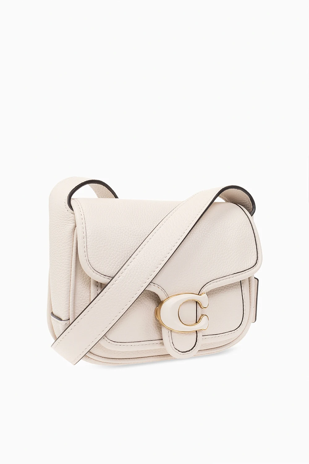 Cream 'Tabby 19' shoulder bag from Coach. Made of leather, this design features a snap closure, logo detail, shoulder strap, back pocket, one internal compartment and gold-tone metal hardware.