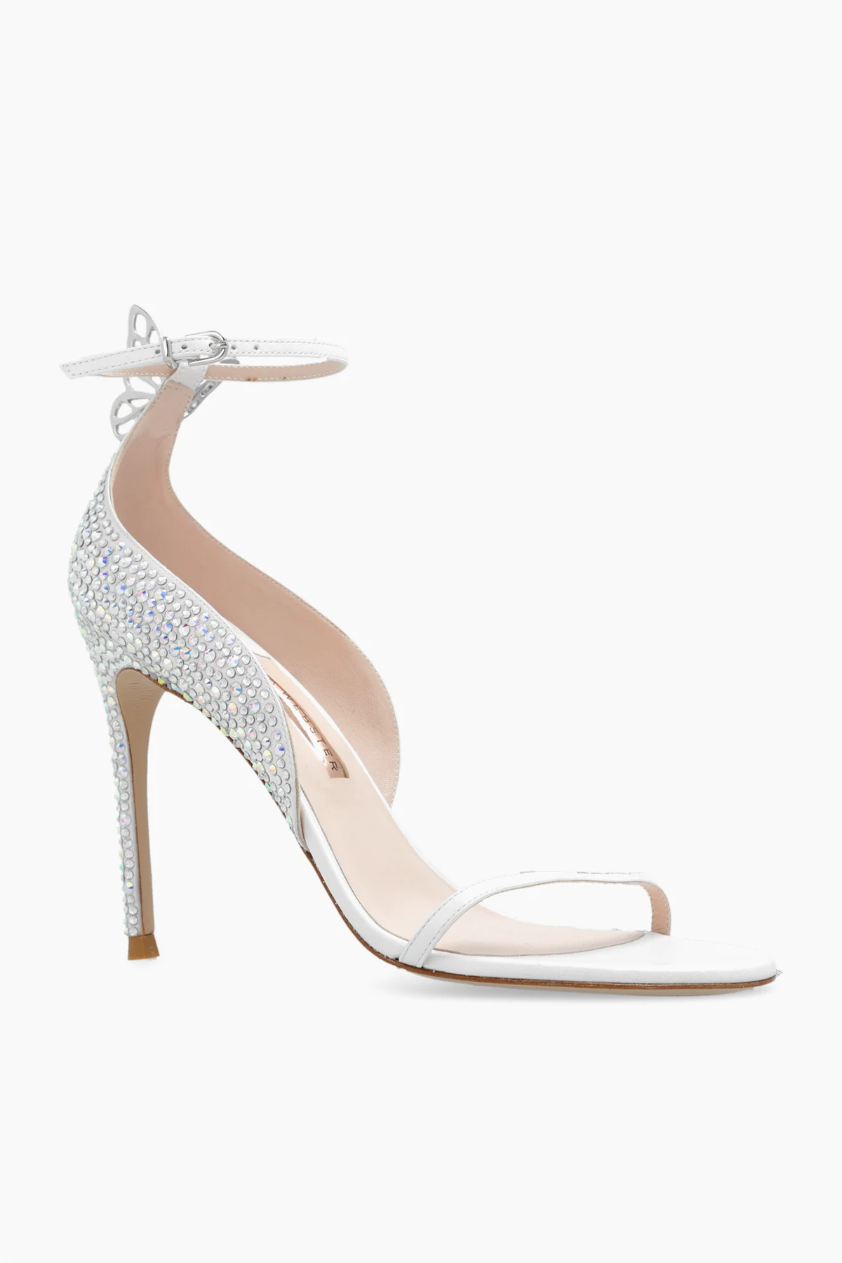 White ‘Mariposa’ heeled sandals from Sophia Webster. Made from rhinestones-embellished leather, this model sits on a beige leather sole and features an adjustable buckle strap around the ankle and a butterfly application to the heel.