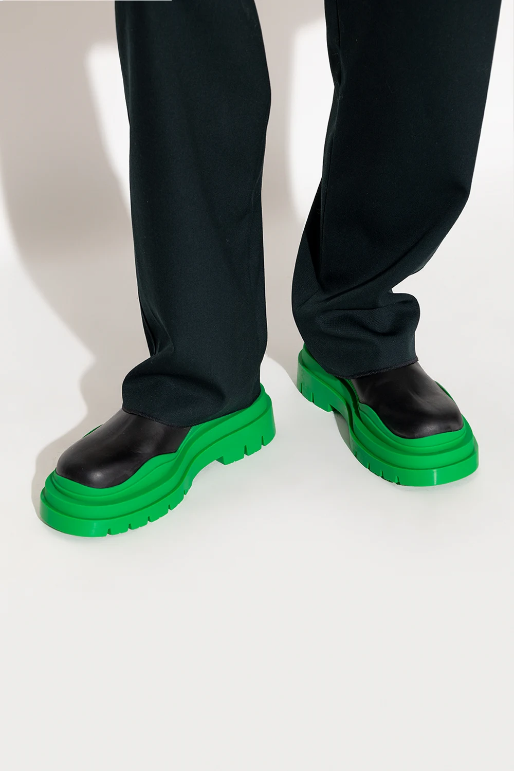 Black ‘Tire’ ankle boots from Bottega Veneta. Made from leather with a slip-on silhouette, this model sits on a green rubber sole and features elastic panels on the sides.