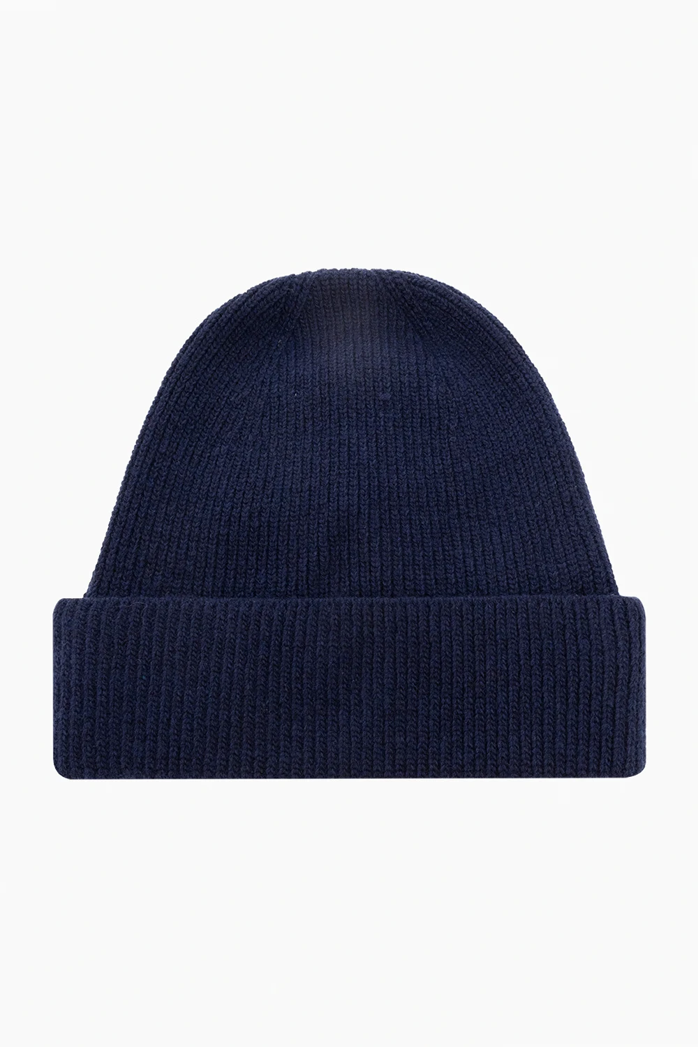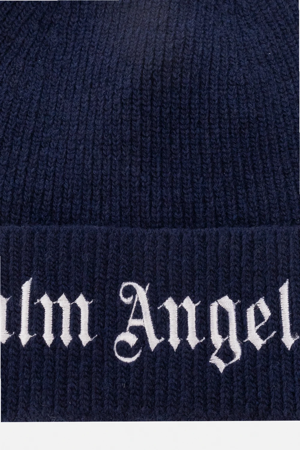 Navy blue beanie from Palm Angels Kids. Crafted with a ribbed knit, this item features an embroidered white logo on the front.