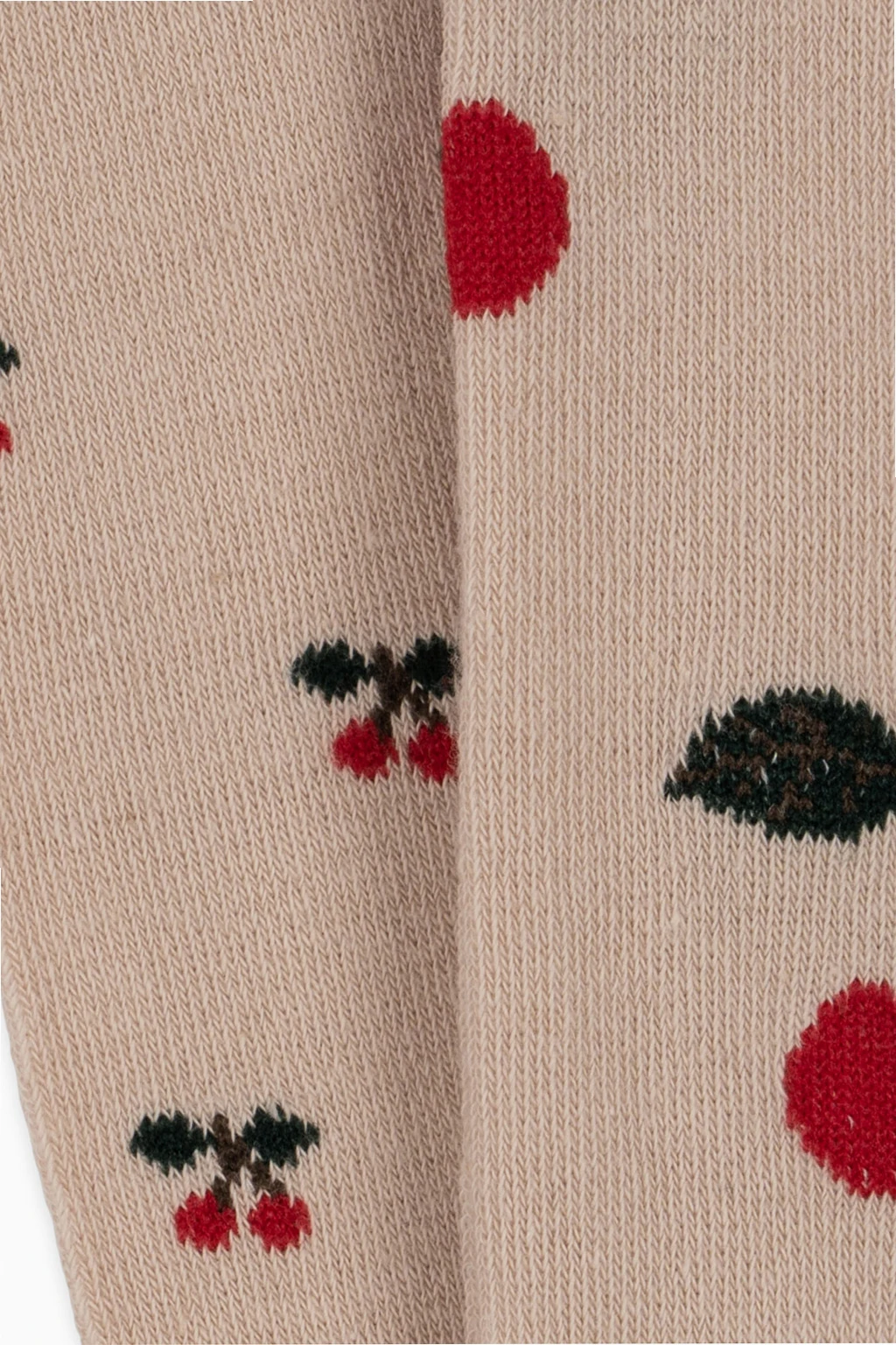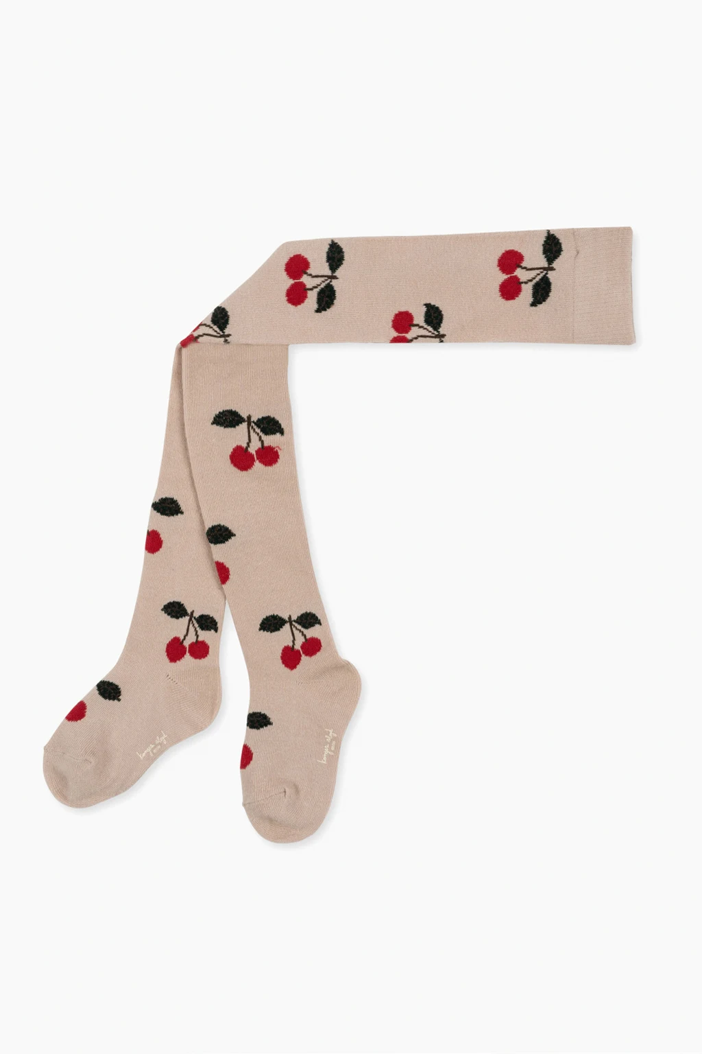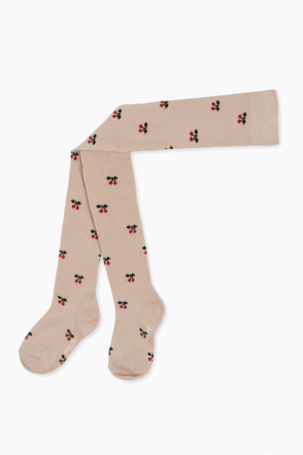 Beige tights two-pack from Konges Slojd. Crafted from organic cotton, each pair features a cherry graphic and ribbed cuffs.